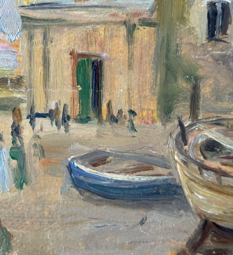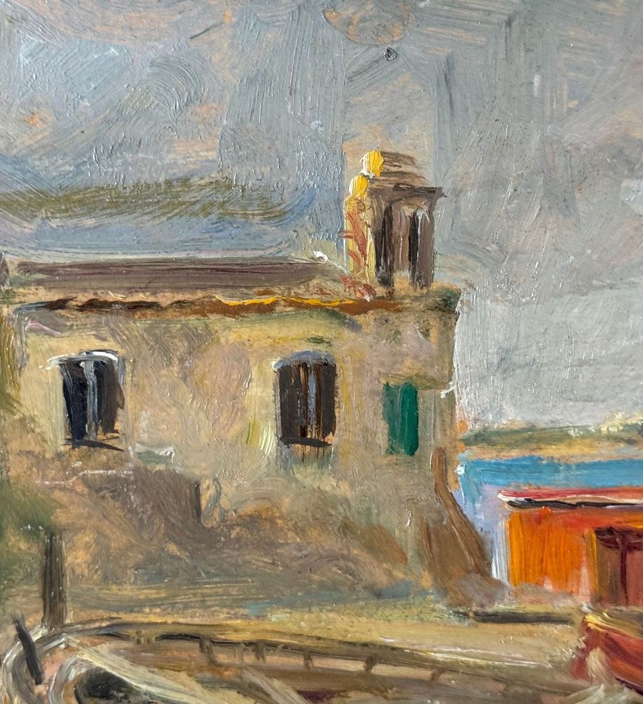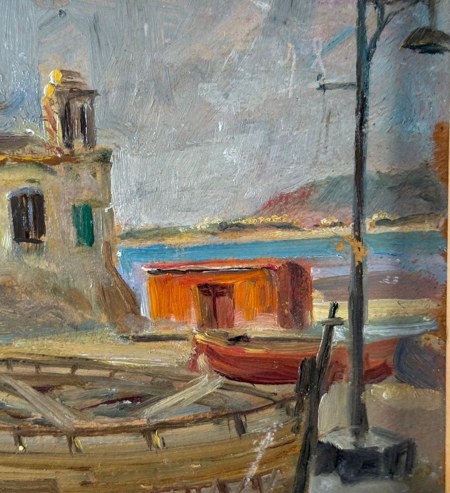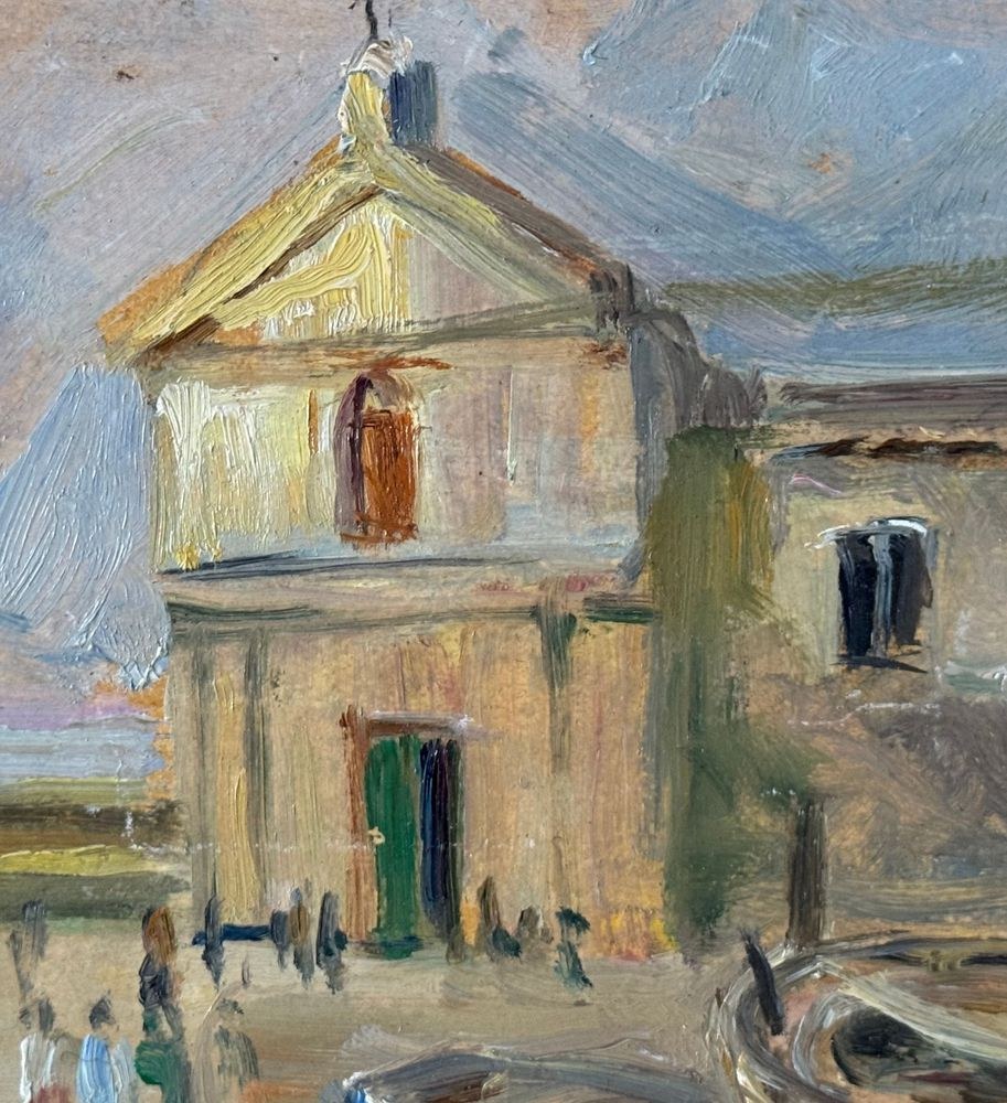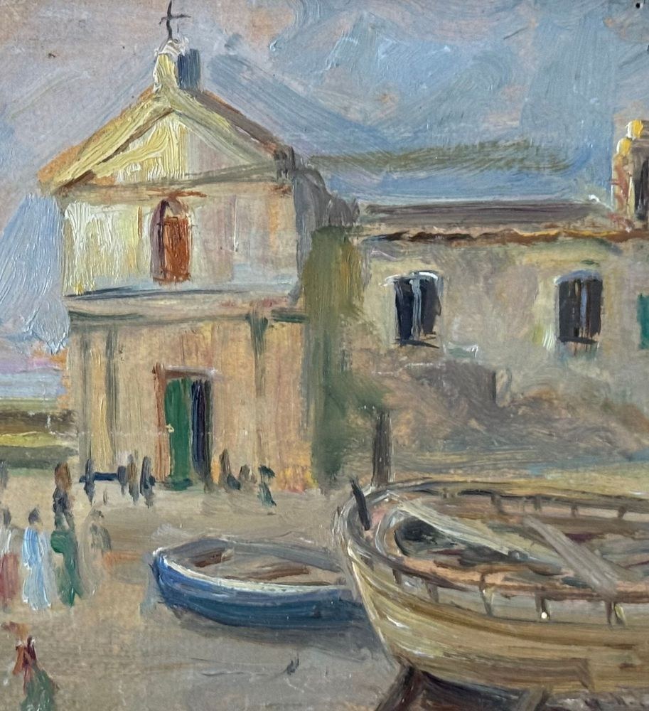 Oil on panel painting, 20th century, Italian school, depicting a seaside view with a small church and boats. Dimensions including frame: 42 x 30 cm. Inner frame dimensions: 34 x 21 cm. Signed lower right *Angela Carugati*. The artwork is in good condition.