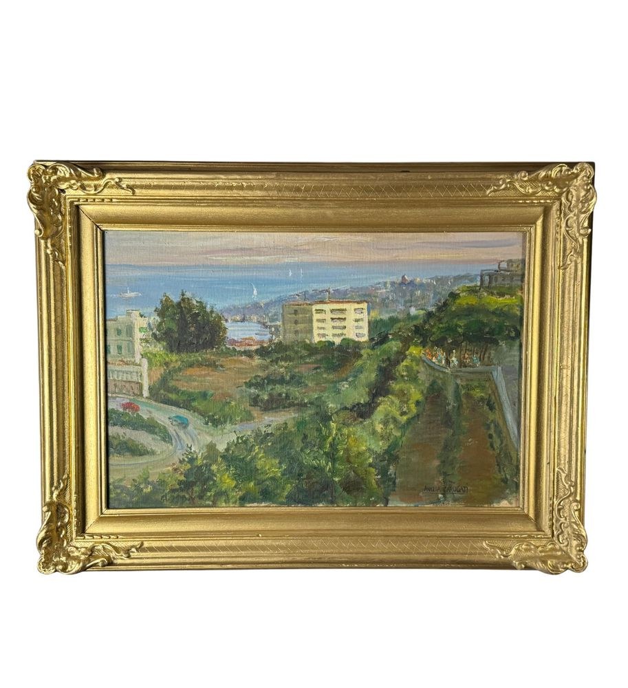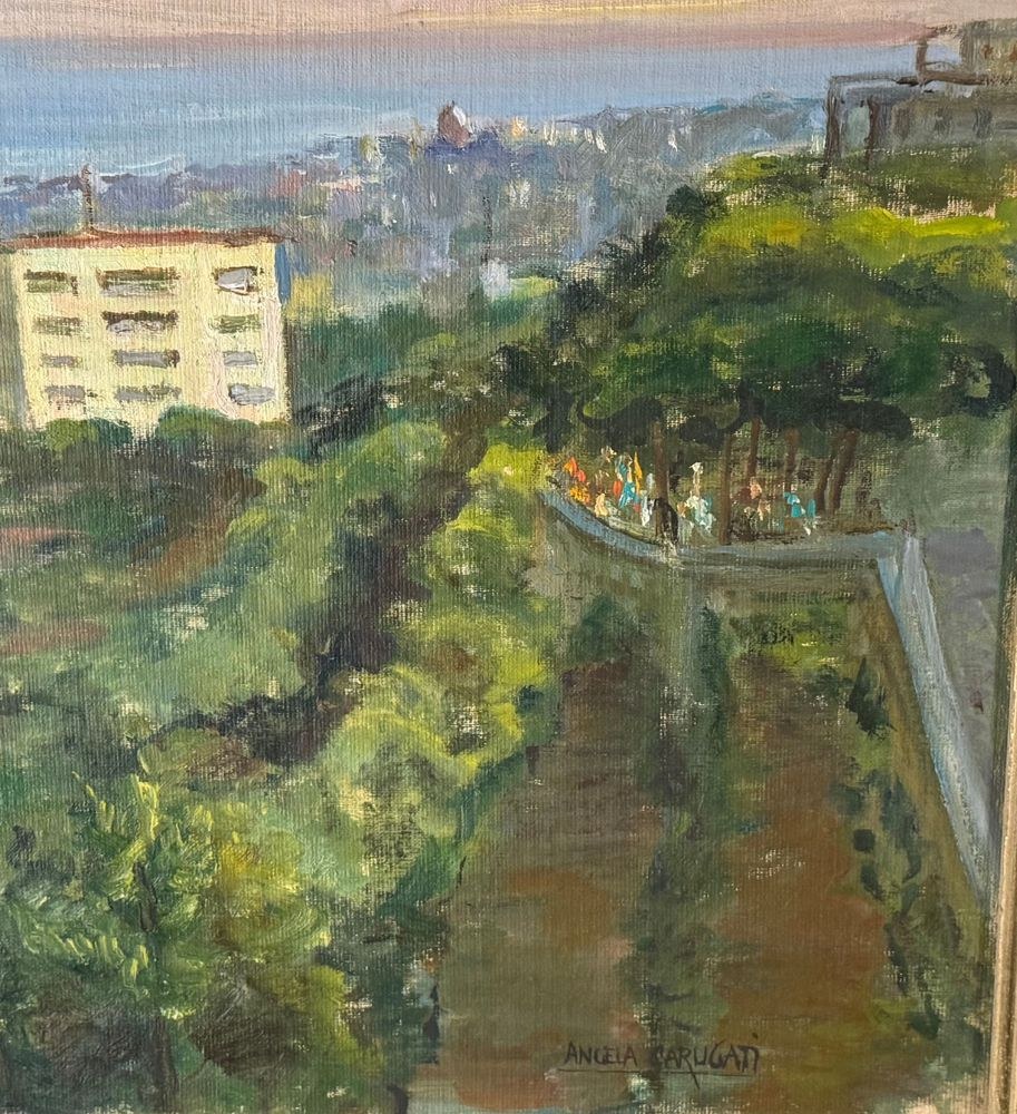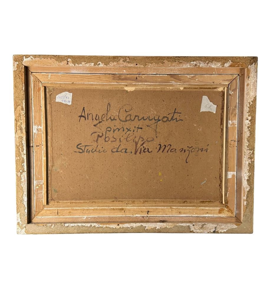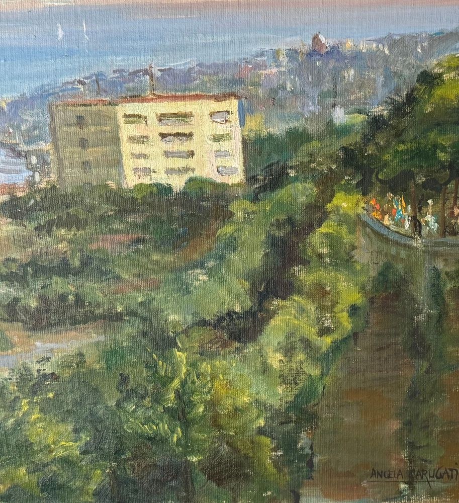 Oil painting on canvas mounted on panel, 20th century period, Italian school, depicting a Street in Posillipo. Dimensions including frame: 78x58 cm. Dimensions without frame: 60x40 cm. Signed in the lower right corner by Angela Carugati. The work is in good condition.