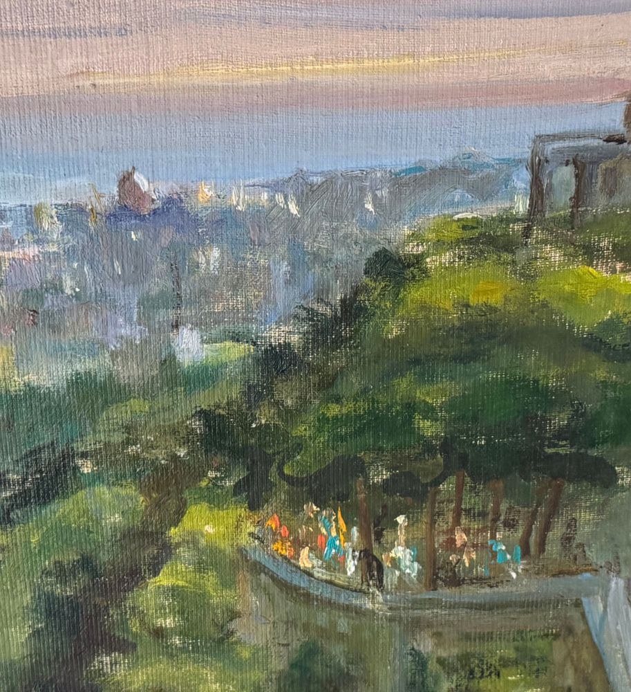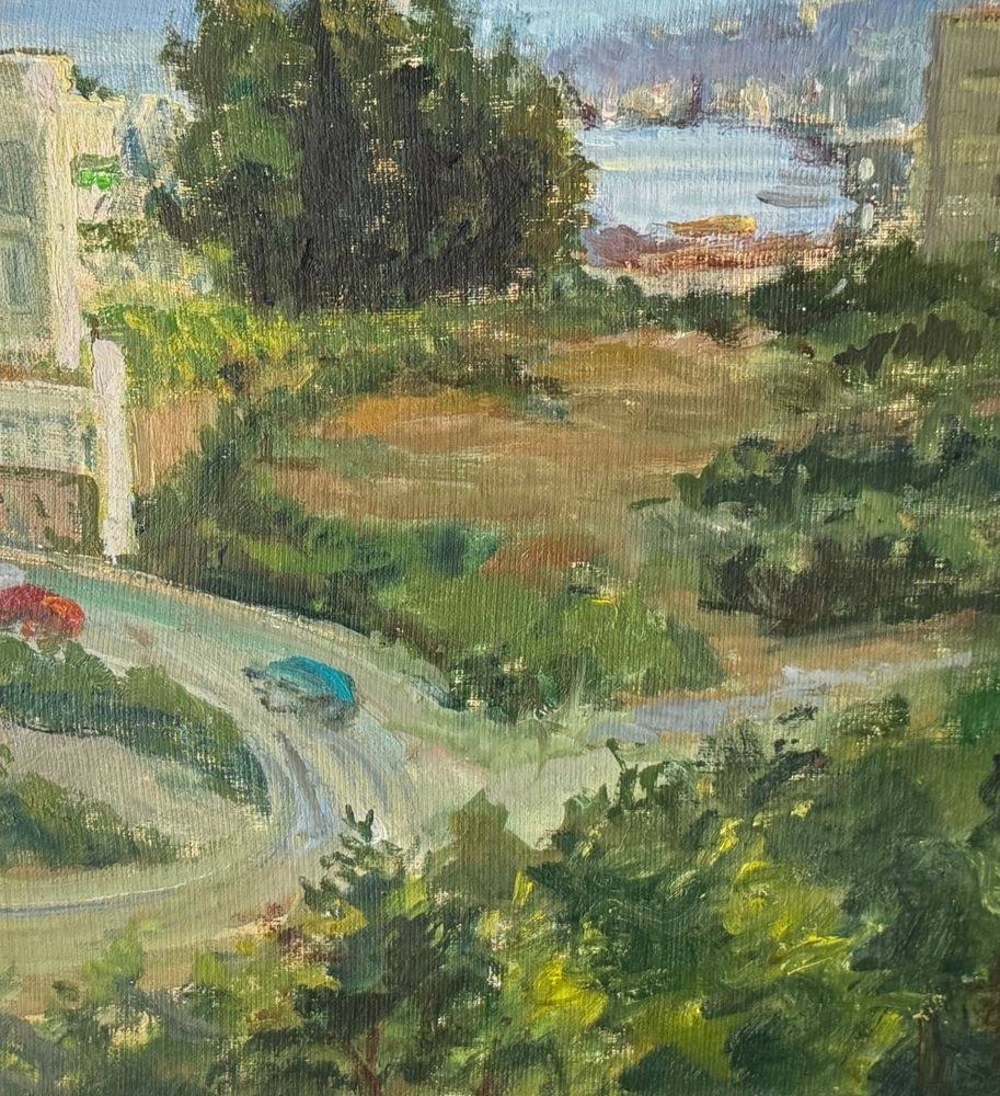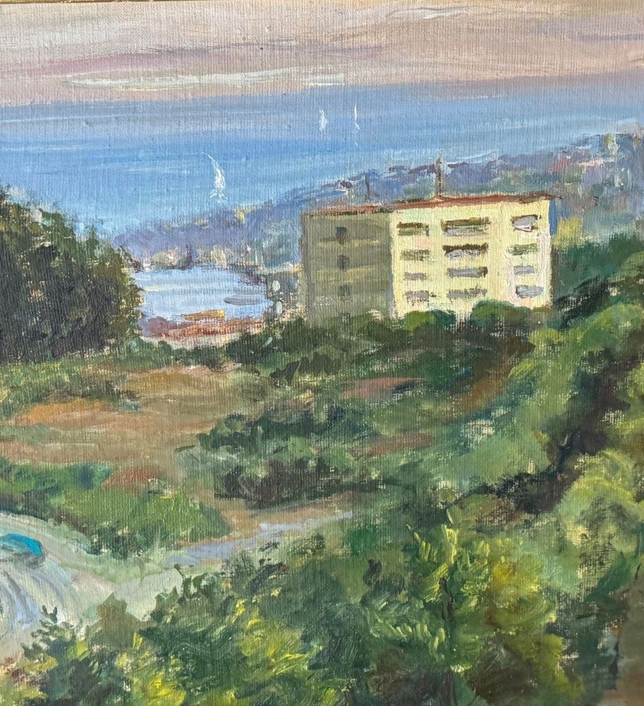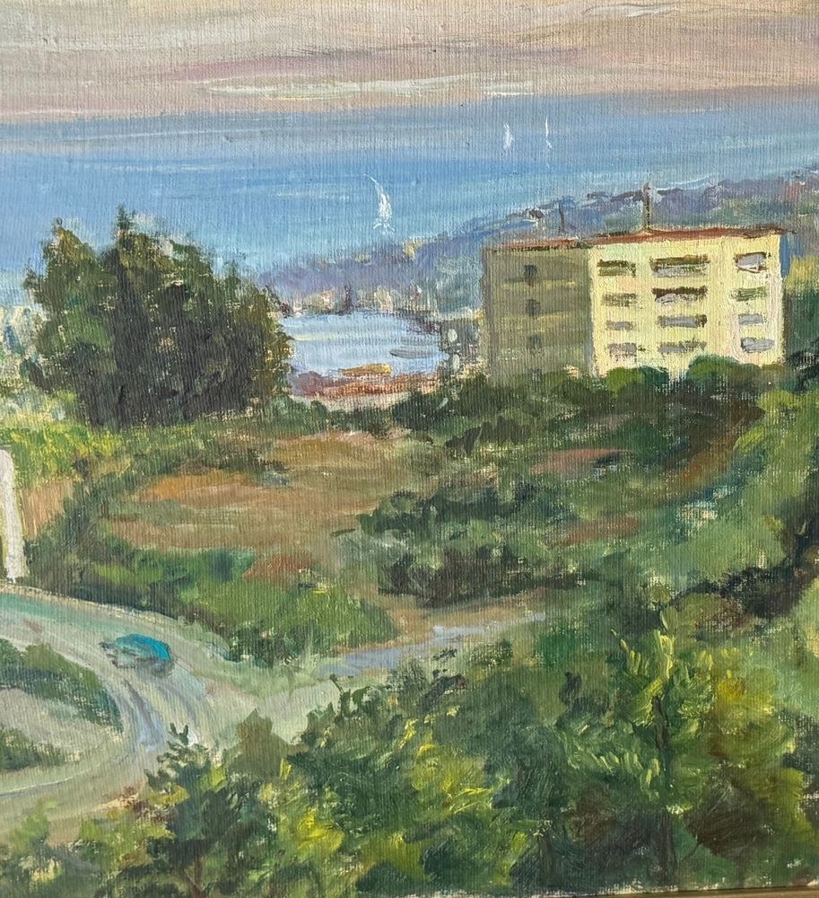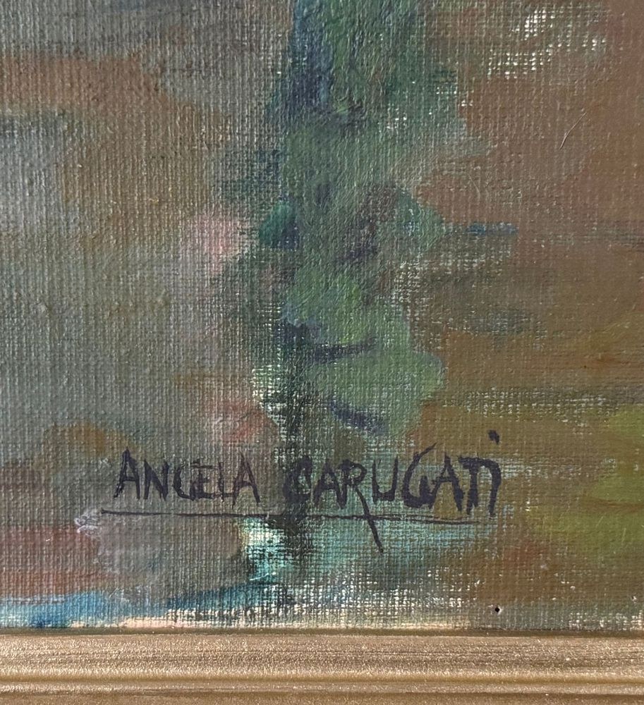 Oil painting on canvas mounted on panel, 20th century period, Italian school, depicting a Street in Posillipo. Dimensions including frame: 78x58 cm. Dimensions without frame: 60x40 cm. Signed in the lower right corner by Angela Carugati. The work is in good condition.