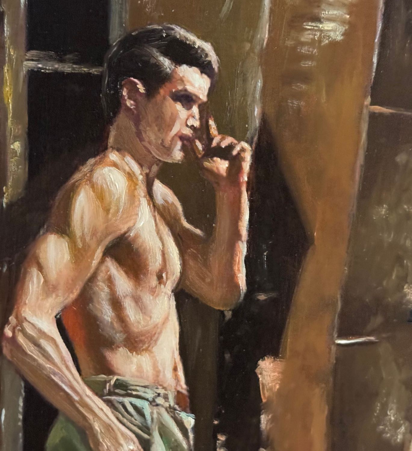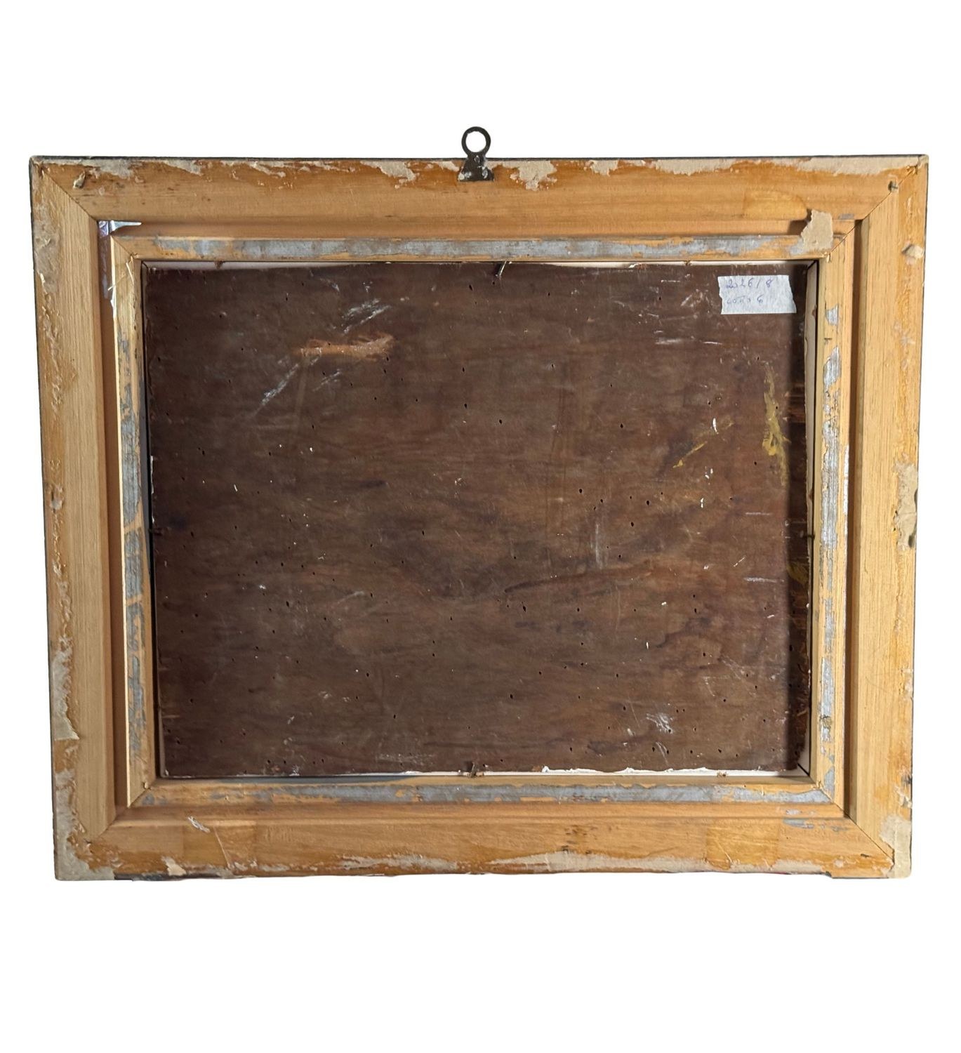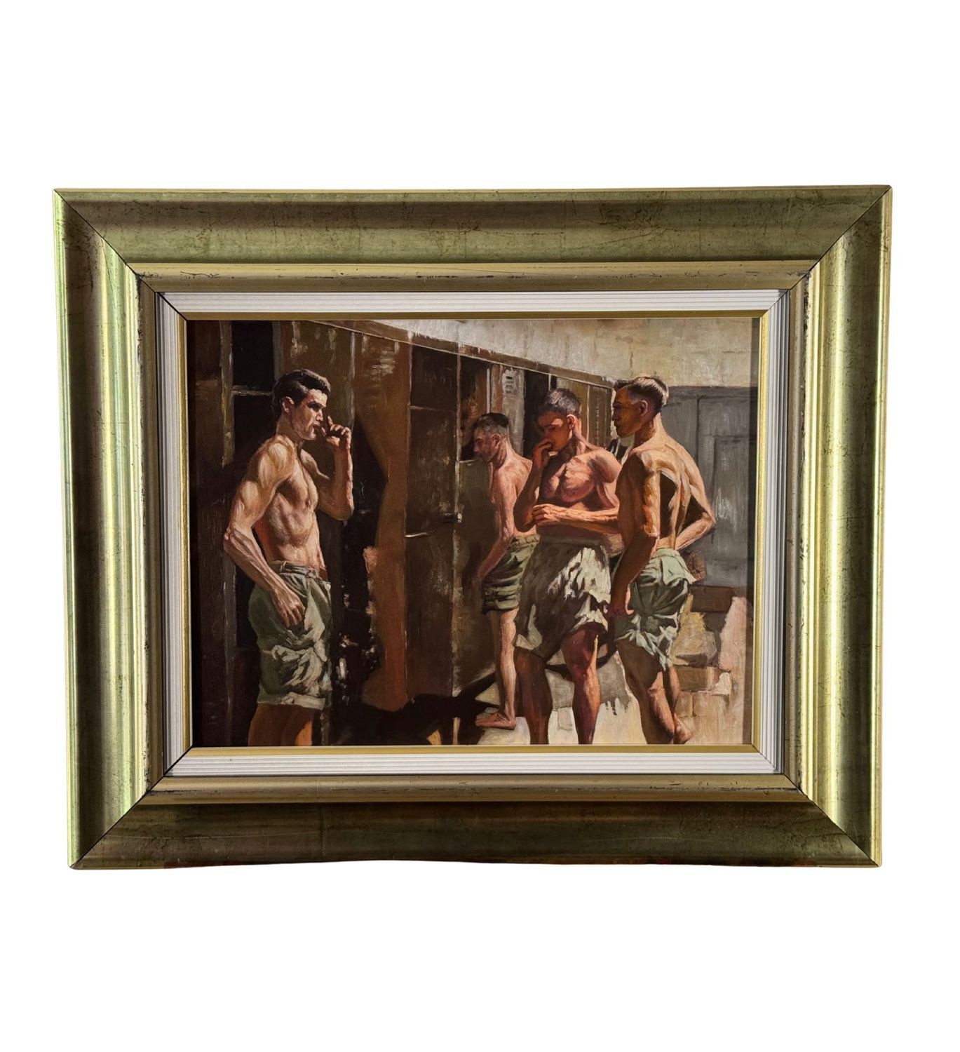 Oil painting on board, 20th century period, Italian school, depicting Athletes in a Locker Room. Dimensions including frame: 59 x 49 cm. Dimensions inside the frame: 45 x 35 cm. Anonymous artist. Artwork in good condition.