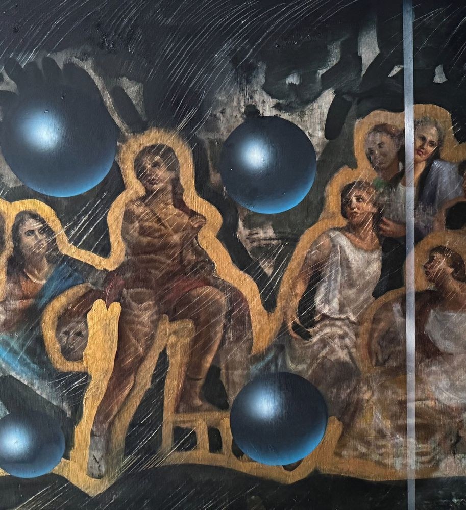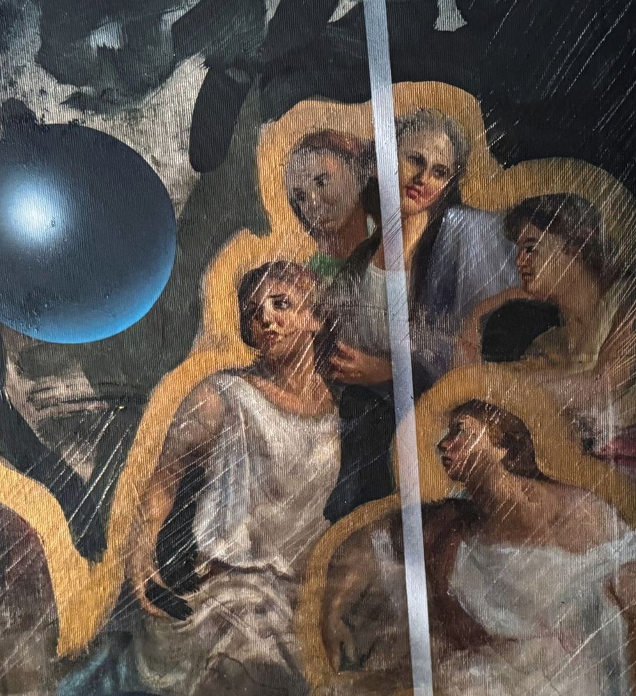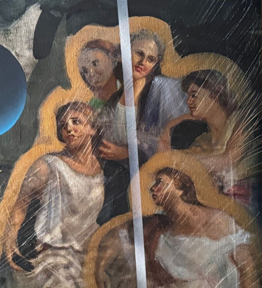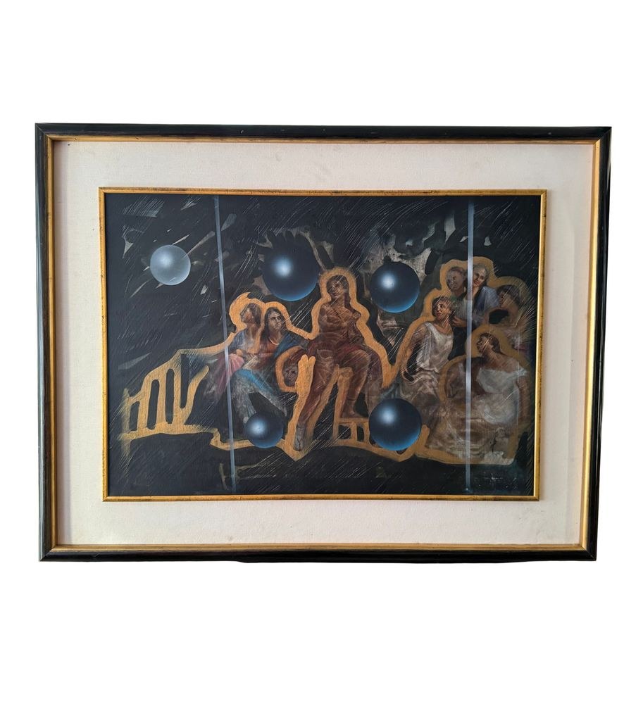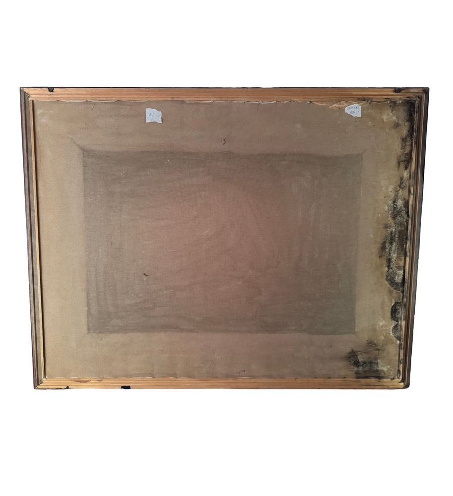 Oil painting on canvas, Italian school, 20th century, depicting a Biblical scene in a modern style. Dimensions including frame: 101x132 cm. Dimensions inside the frame: 70x100 cm. By an anonymous artist. The artwork is in good condition with minor signs of wear, as shown in the attached photos.