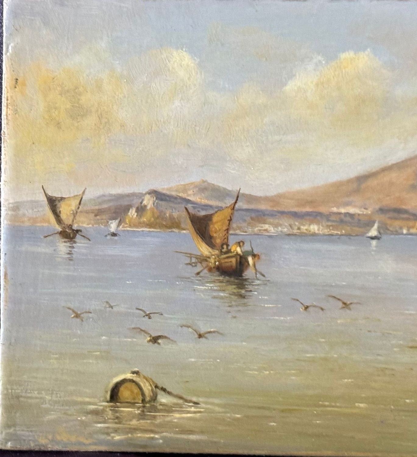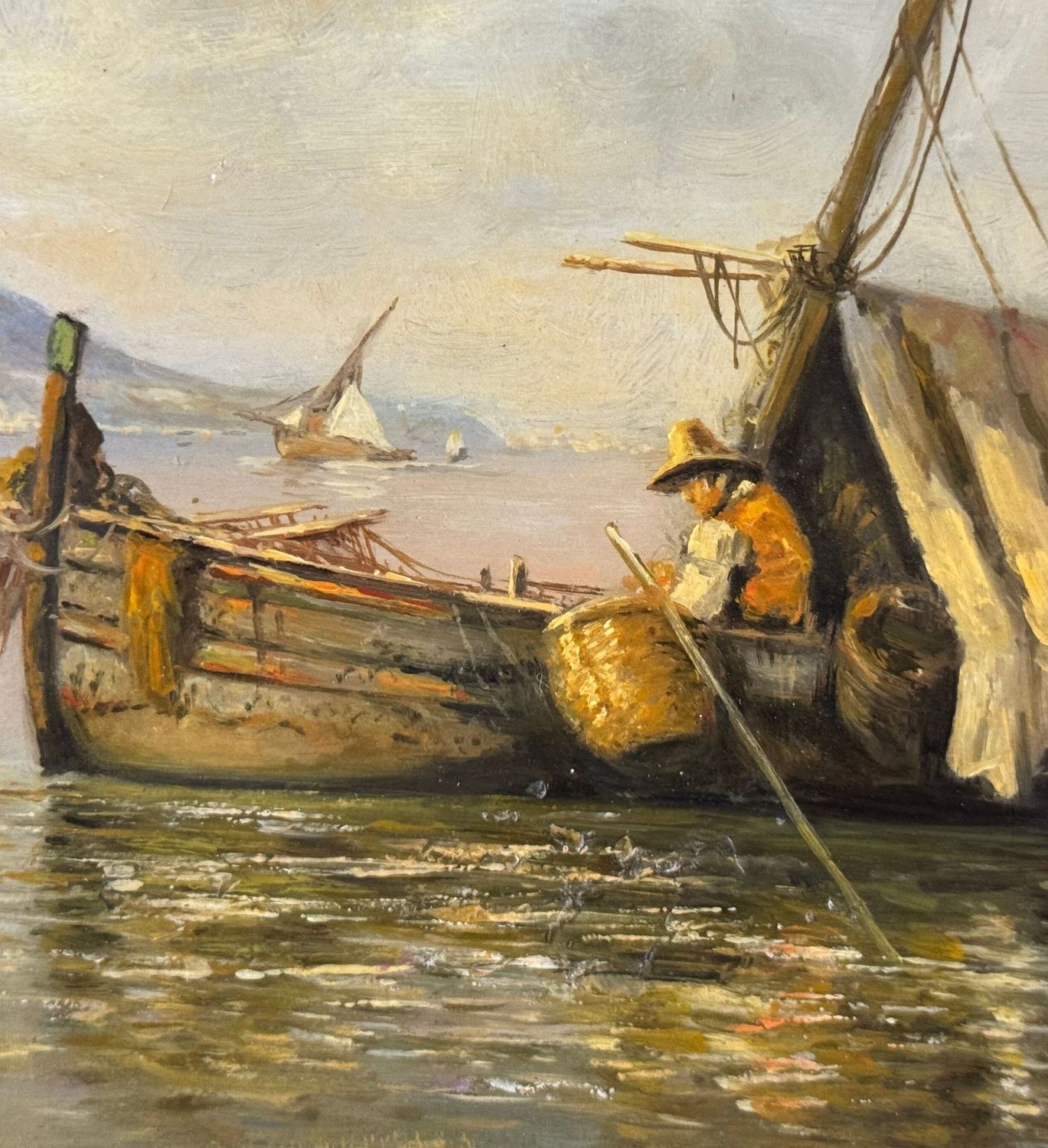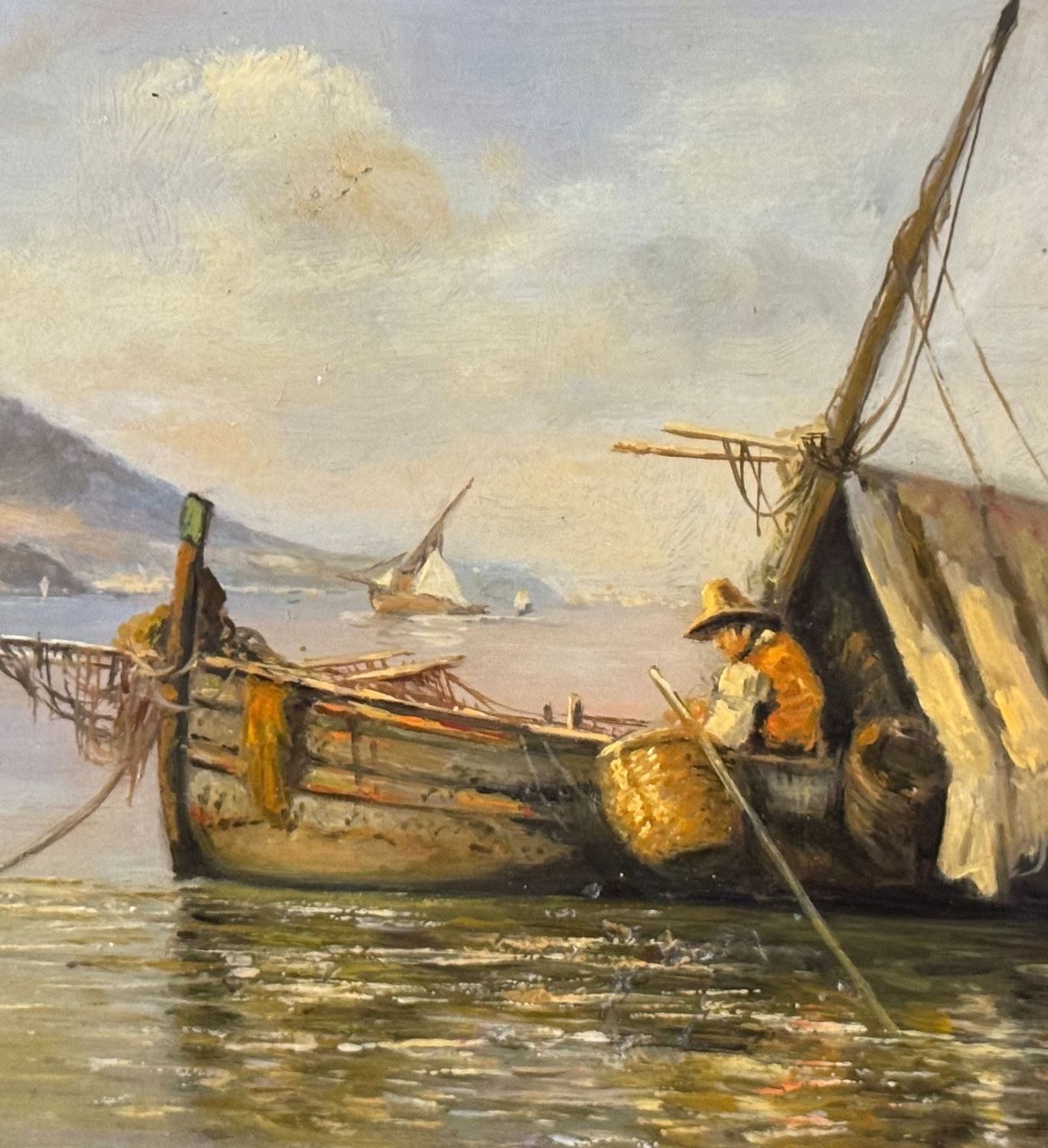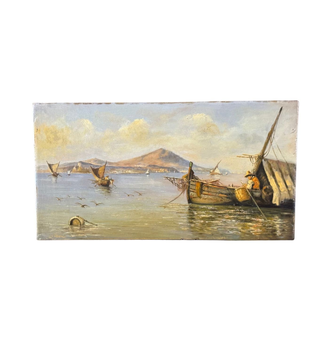 Oil painting on board, 20th century period, Italian school, depicting Boats with Fishermen. Dimensions: 30x17 cm. By an anonymous artist. The work is in good condition.