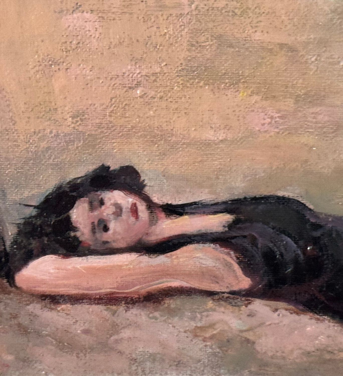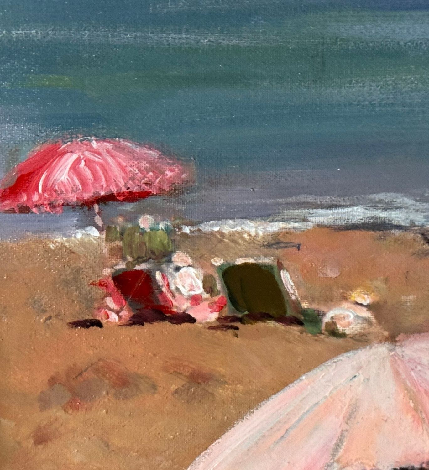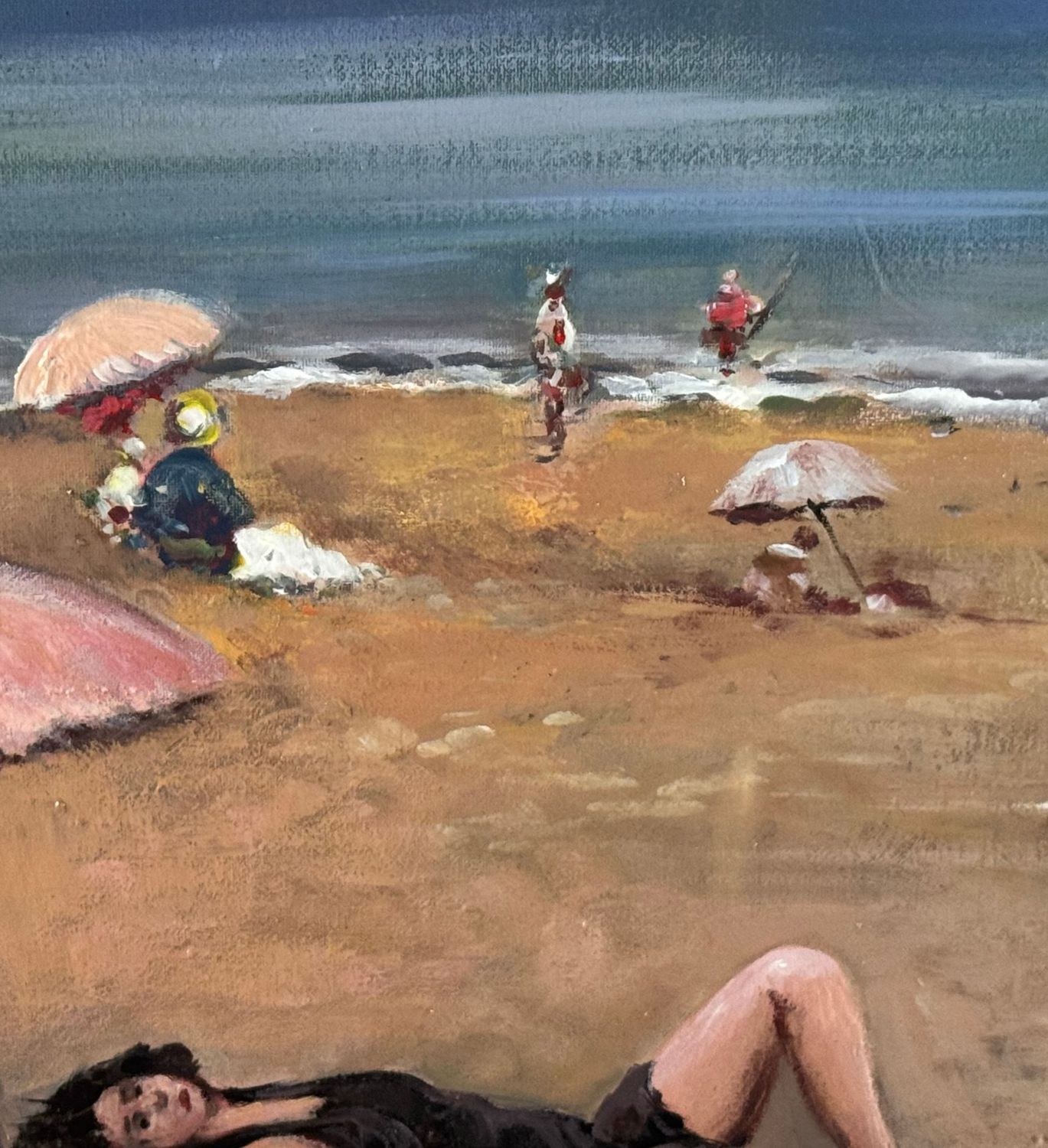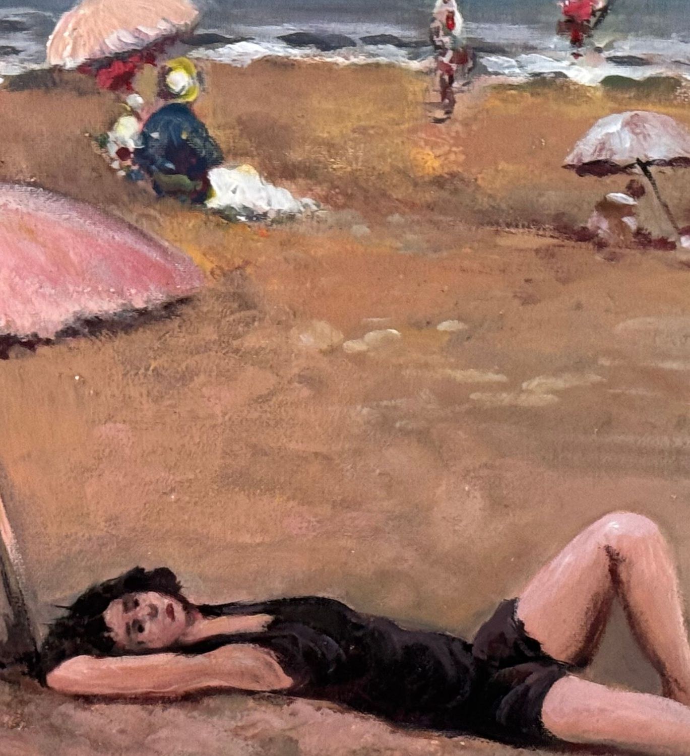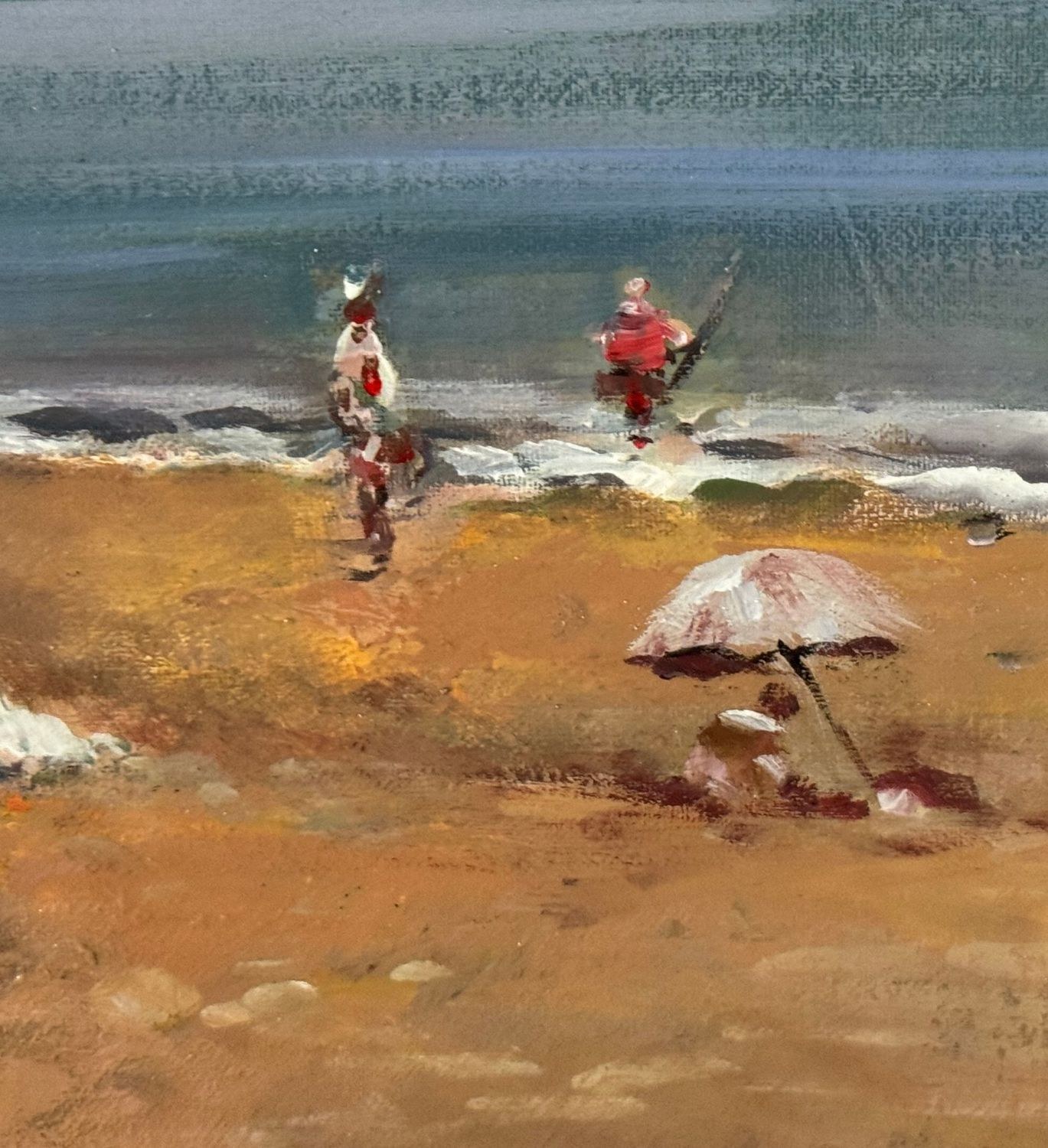 Oil painting on canvas board, 20th century period, Italian school, depicting a coastal scene with bathers. Dimensions including frame: 51x41 cm. Inner frame dimensions: 30x40 cm. Anonymous artist. Artwork in good condition.