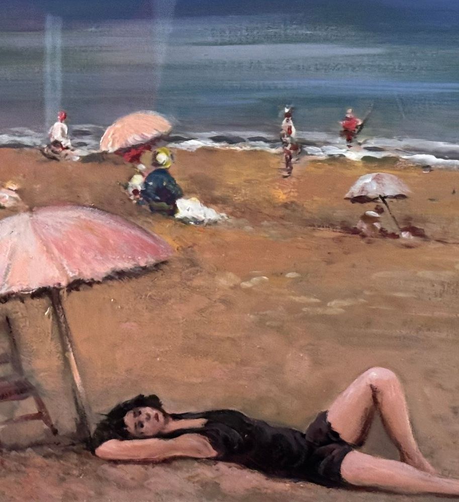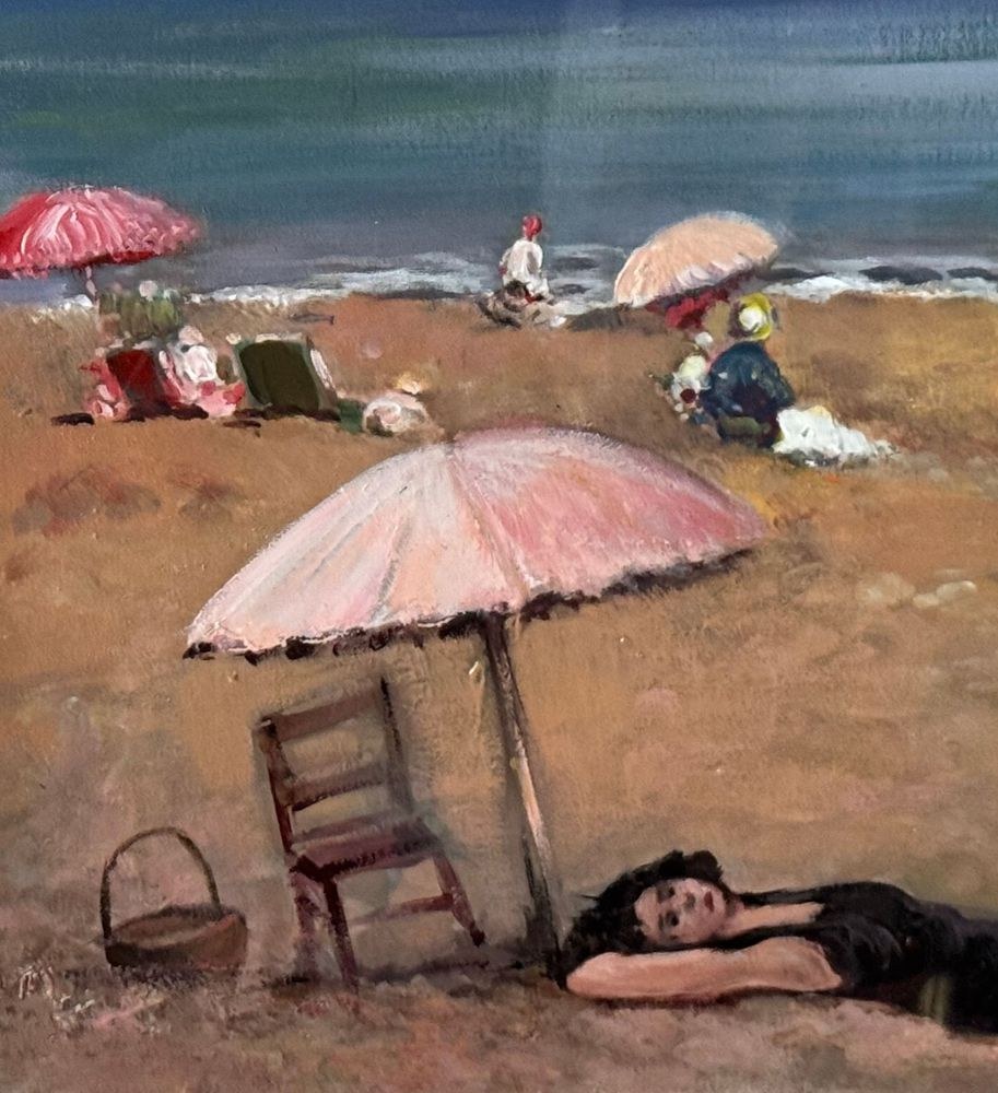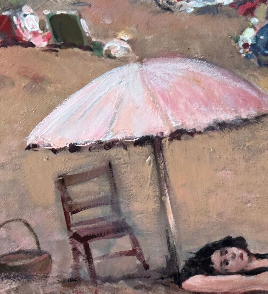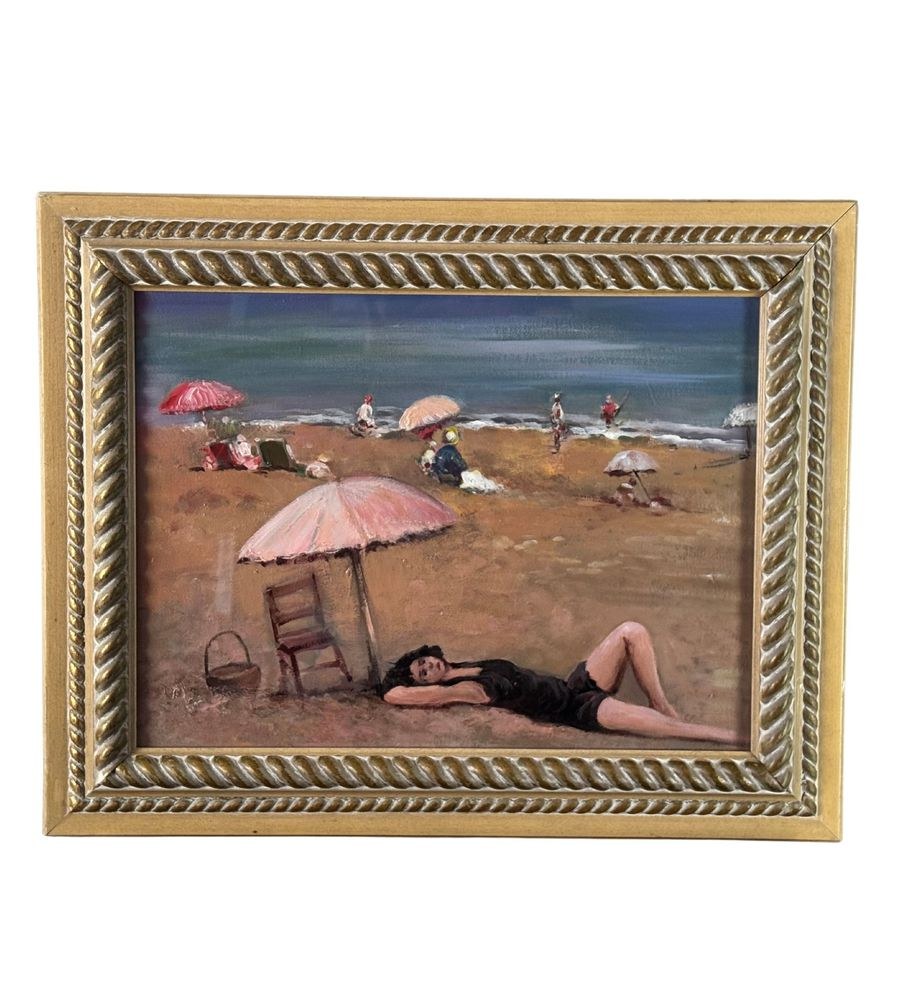 Oil painting on canvas board, 20th century period, Italian school, depicting a coastal scene with bathers. Dimensions including frame: 51x41 cm. Inner frame dimensions: 30x40 cm. Anonymous artist. Artwork in good condition.