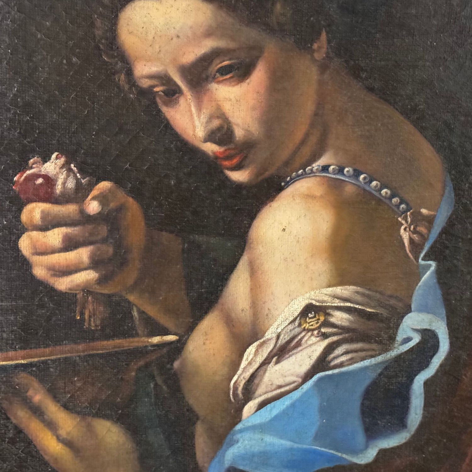 Oil painting on canvas, 19th/20th century Italian school, copy by Bernardino Mei (1650 - 1659), depicting Ghismonda with the heart of Guiscardo. Dimensions: 52x63 cm. By anonymous artist. It is in fair condition as shown in the attached photos. An old relining is worth mentioning.
