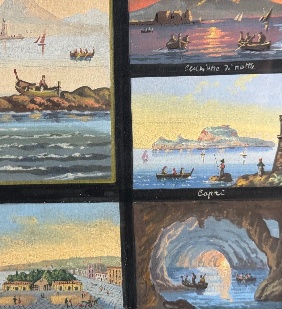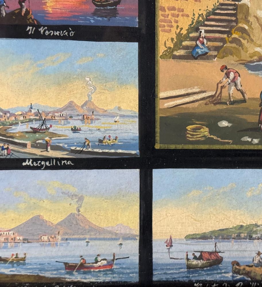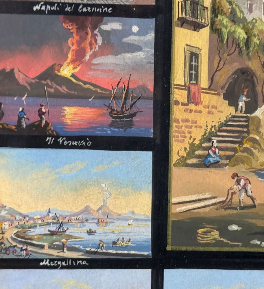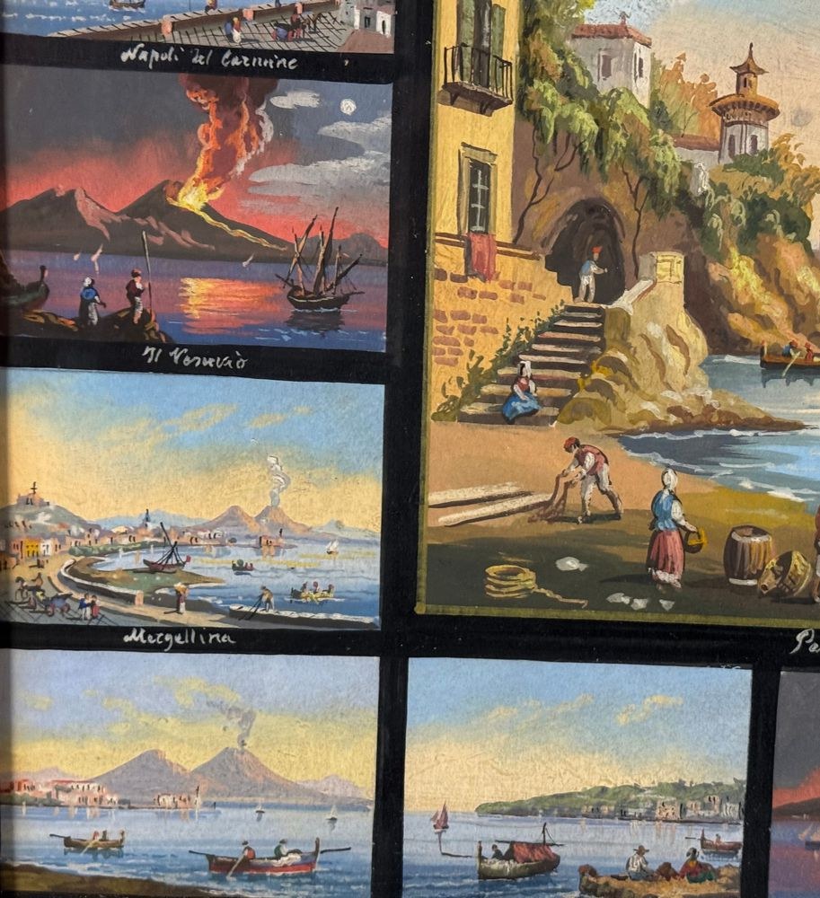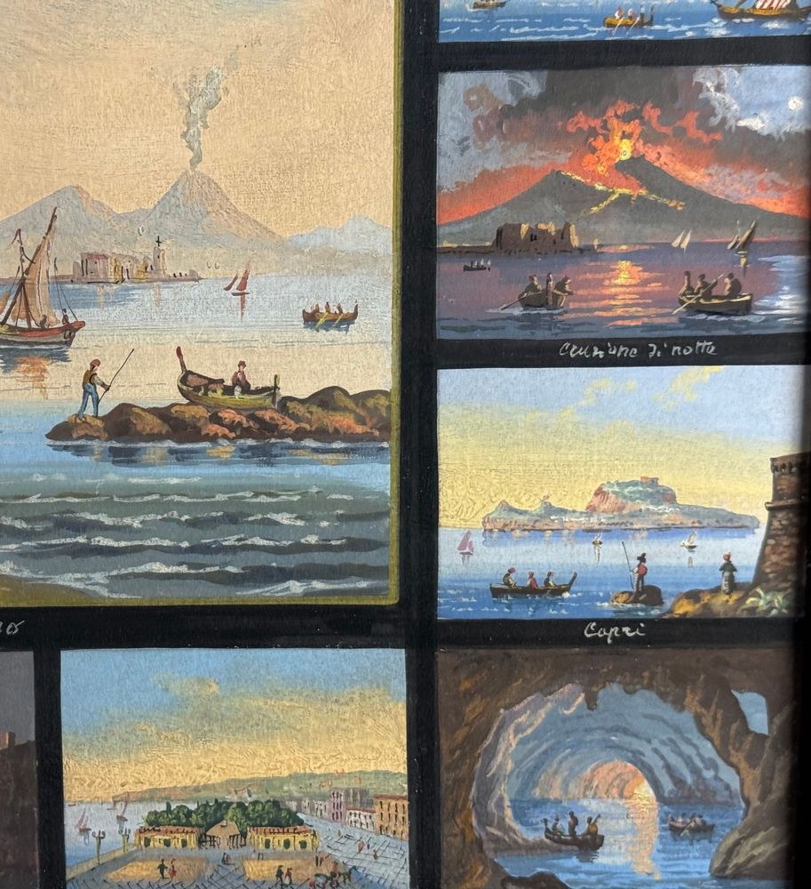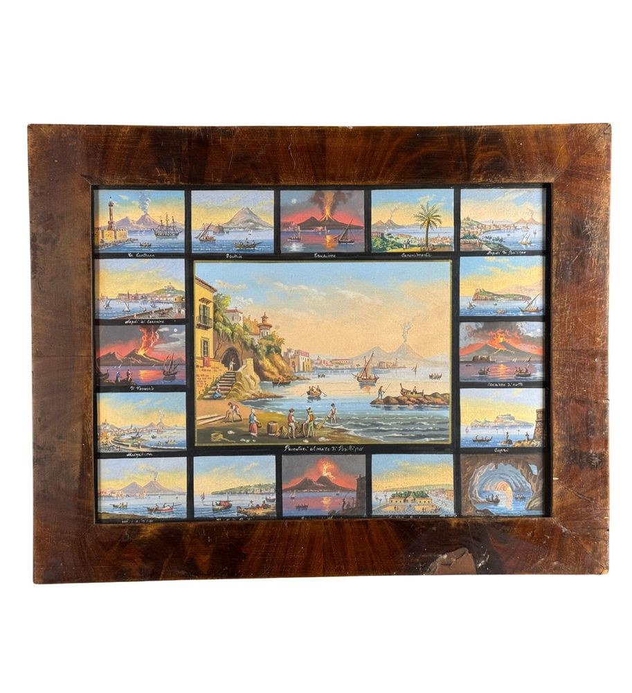 Gouache (tempera on paper) painting, early 19th/20th century, Italian school, depicting a grouping of 17 views of various Neapolitan locations. Dimensions including frame: 55.5×43.5 cm. Inner frame dimensions: 44×32 cm. By an anonymous artist. Artwork in good condition. Frame with defects and missing parts.