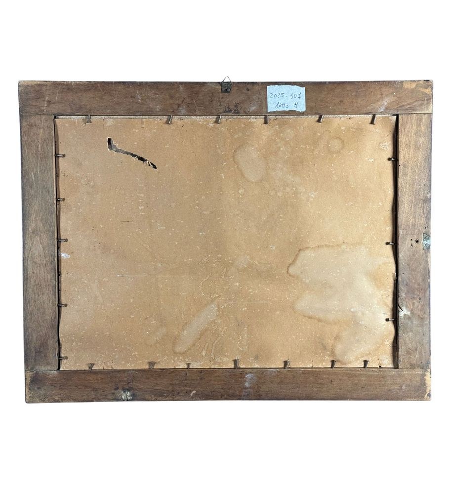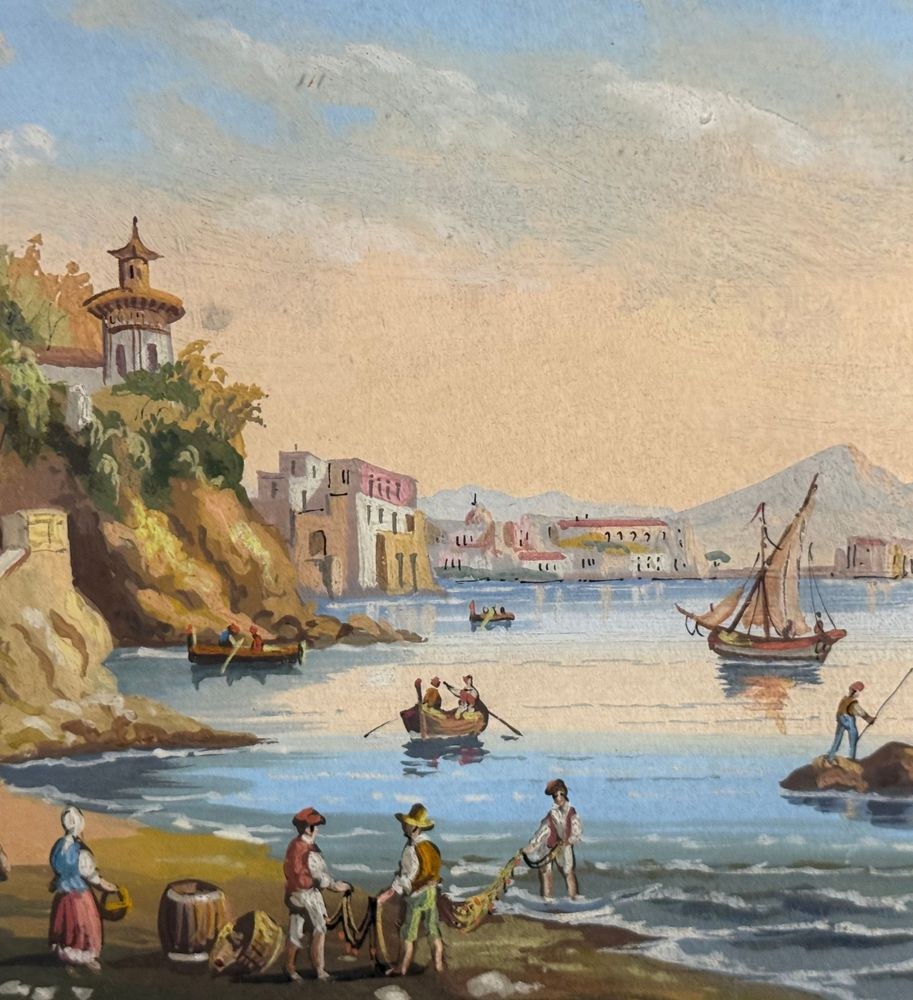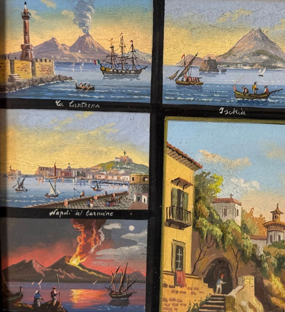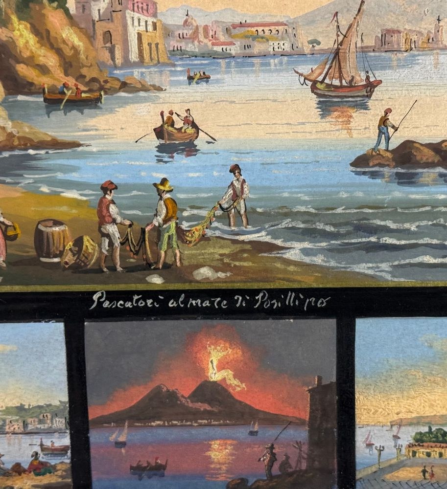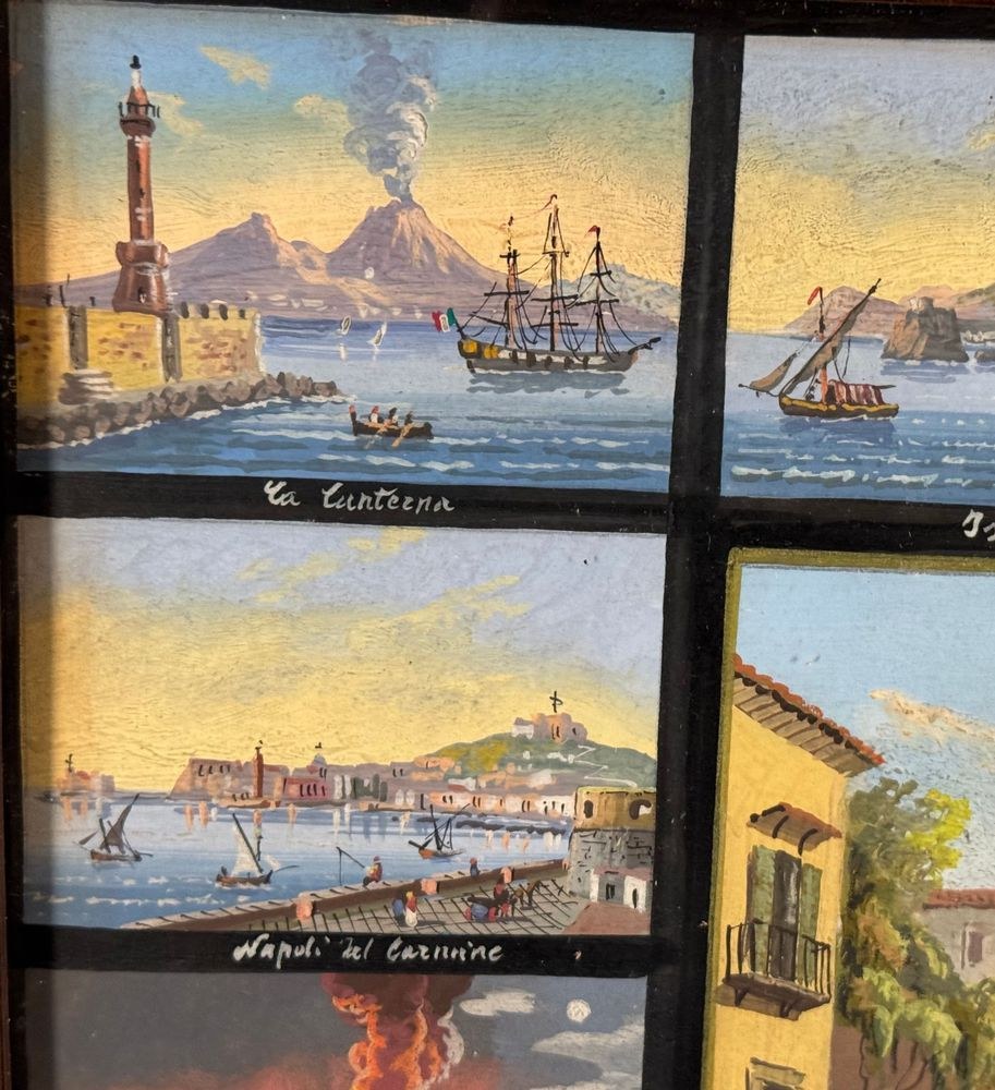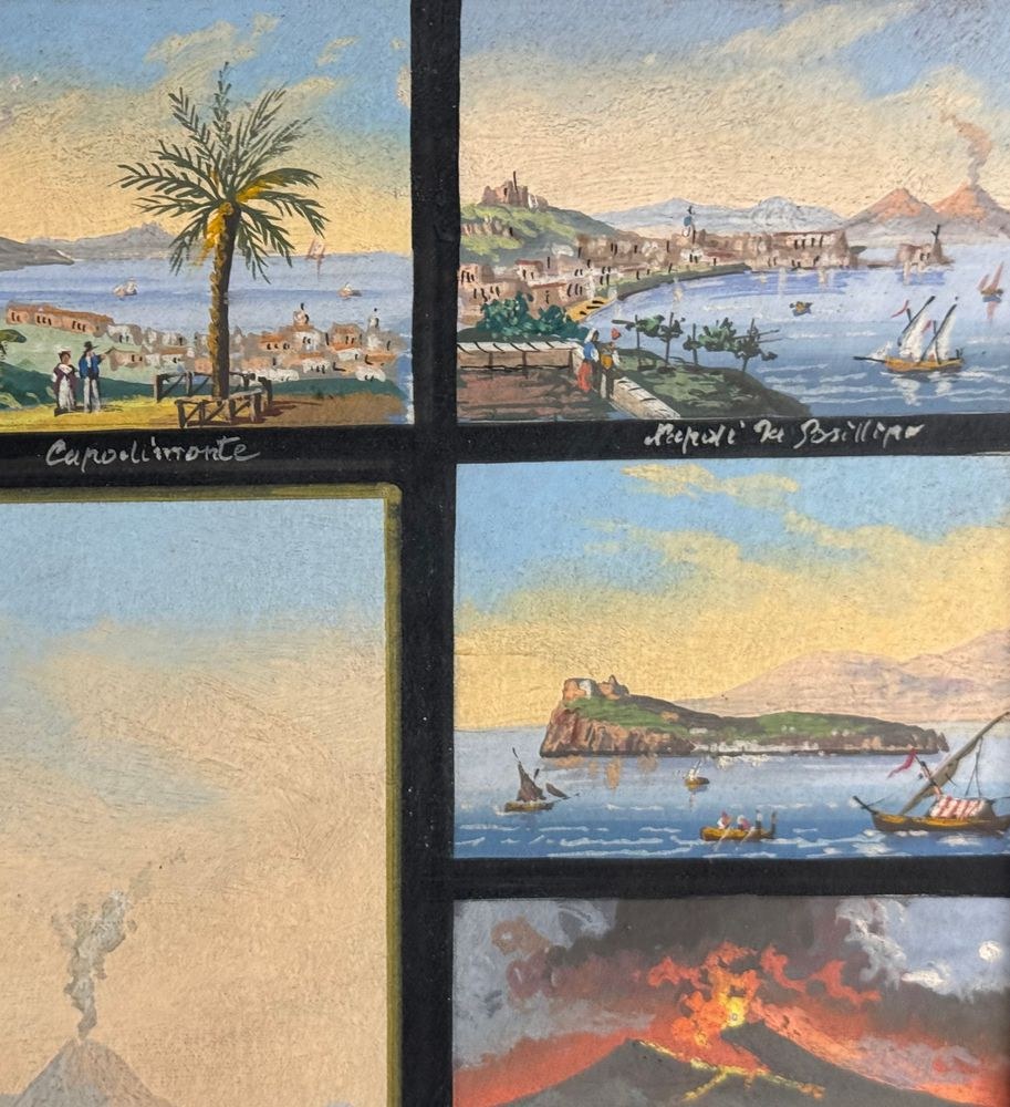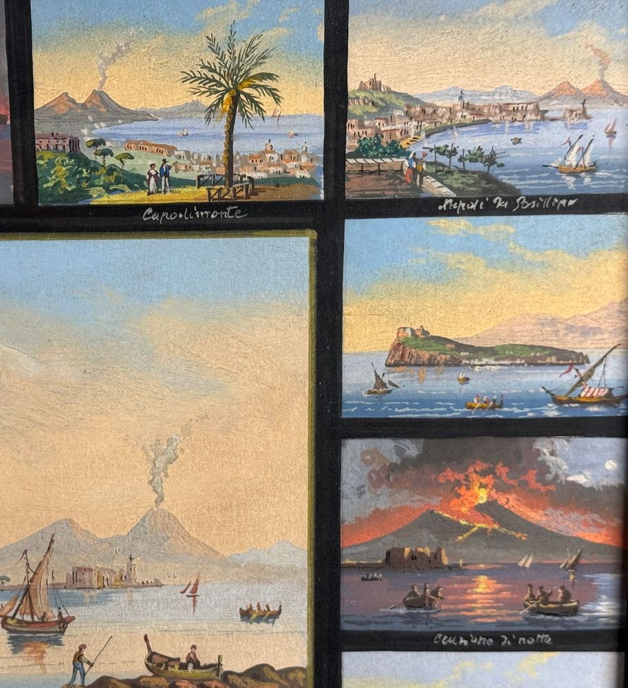 Gouache (tempera on paper) painting, early 19th/20th century, Italian school, depicting a grouping of 17 views of various Neapolitan locations. Dimensions including frame: 55.5×43.5 cm. Inner frame dimensions: 44×32 cm. By an anonymous artist. Artwork in good condition. Frame with defects and missing parts.