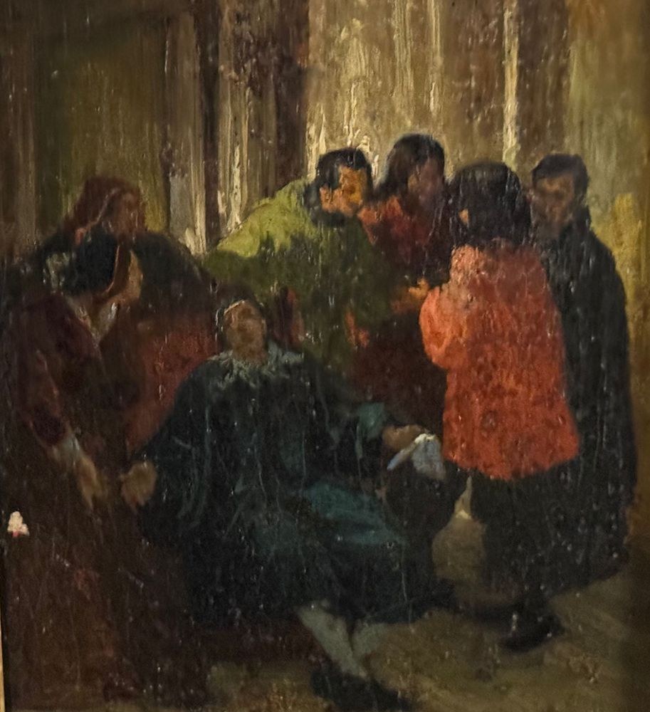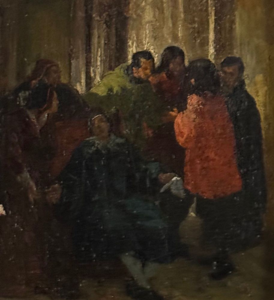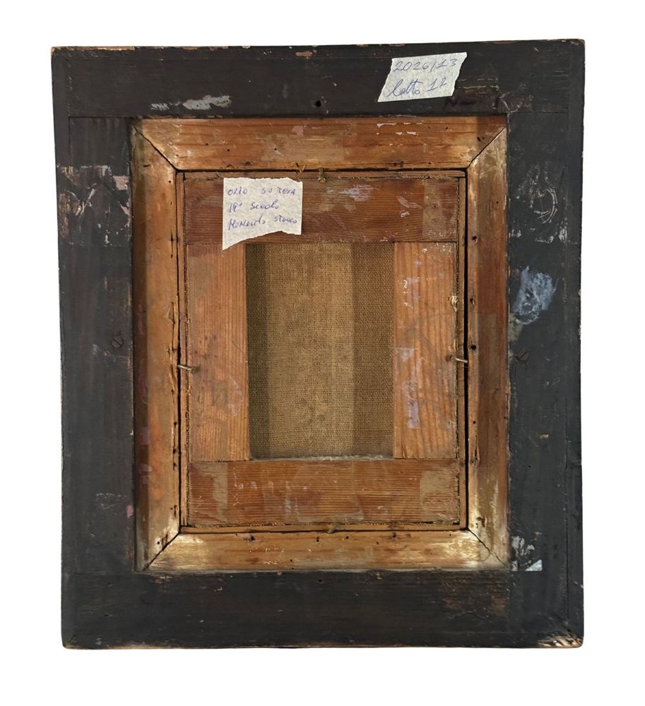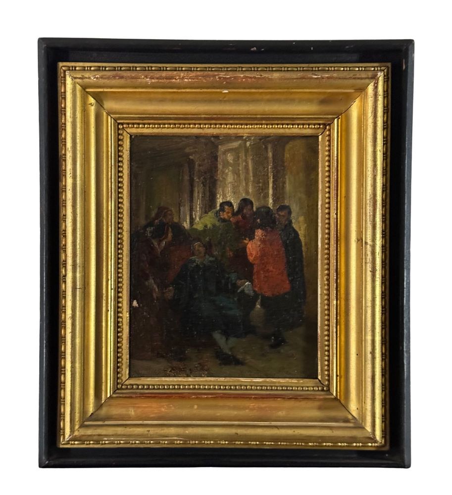 Oil on canvas painting, 19th century, Italian school, depicting a historical scene. Dimensions including frame: 37 × 32 cm. Inner frame dimensions: 17 × 22 cm. Anonymous artist. The artwork is in fair condition, as shown in the attached photos.