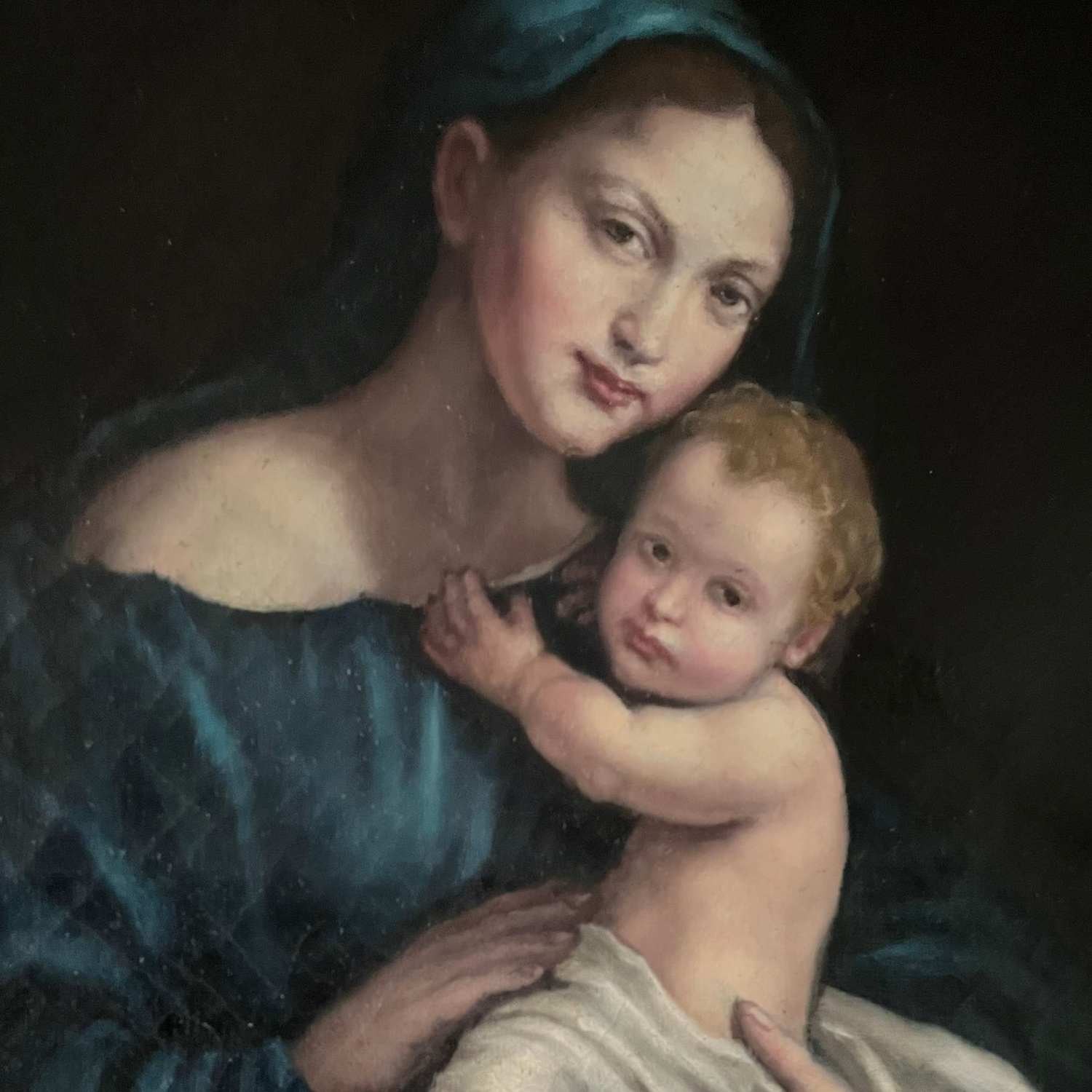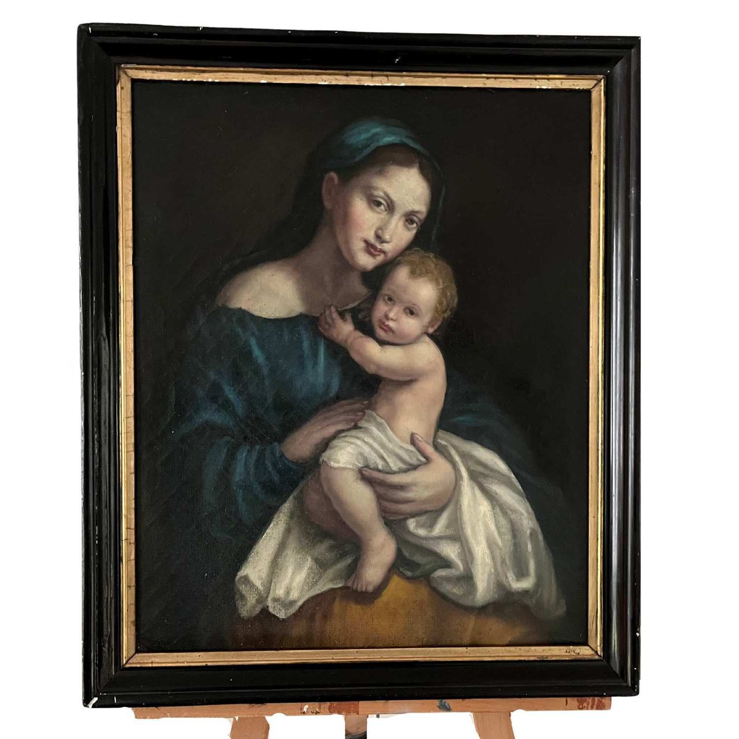 Oil painting on canvas, French School, 19th/20th century, depicting the Madonna with Child. (Relined). Dimensions: 63x75 cm including frame (defects and missing parts).