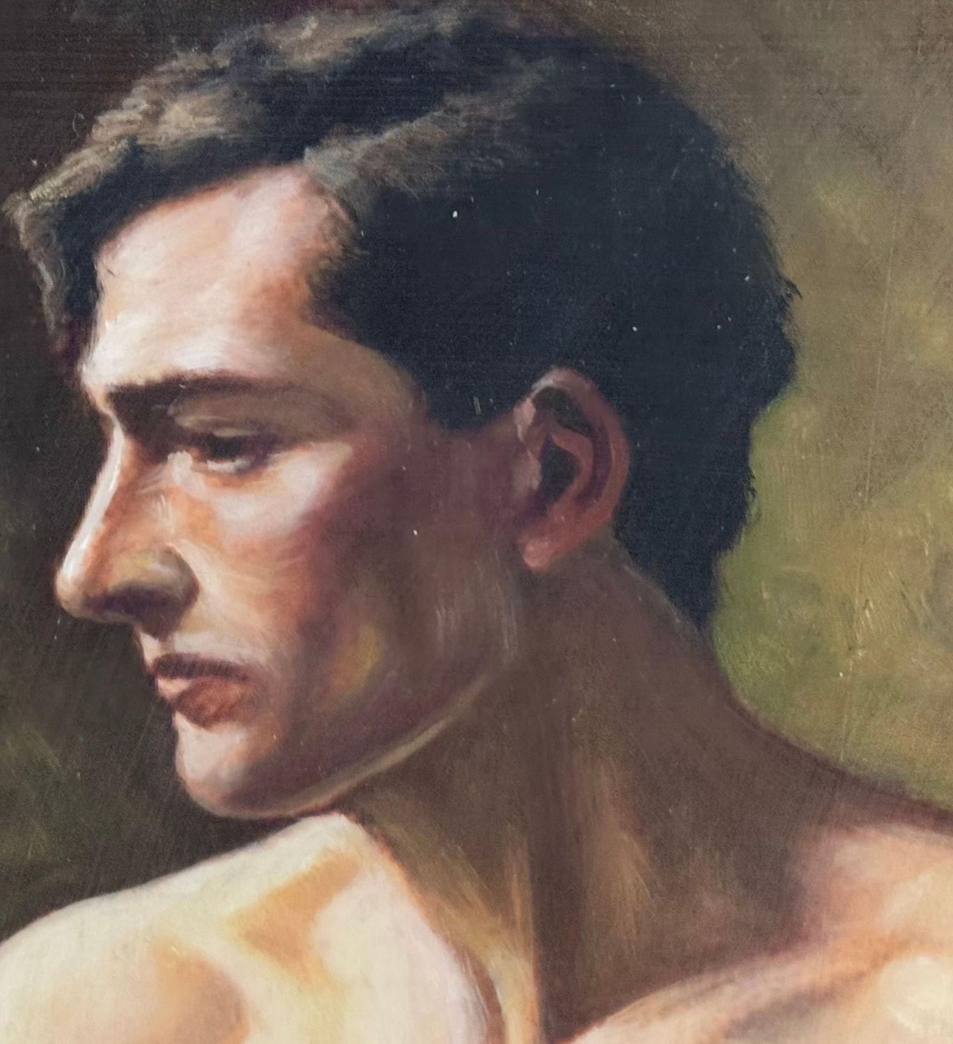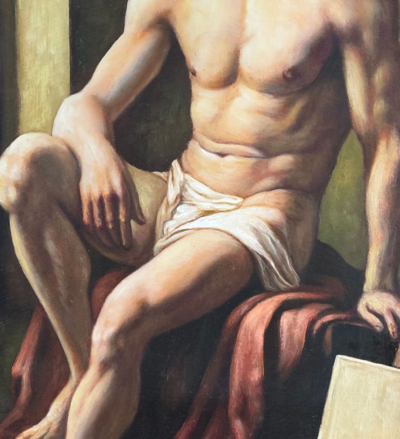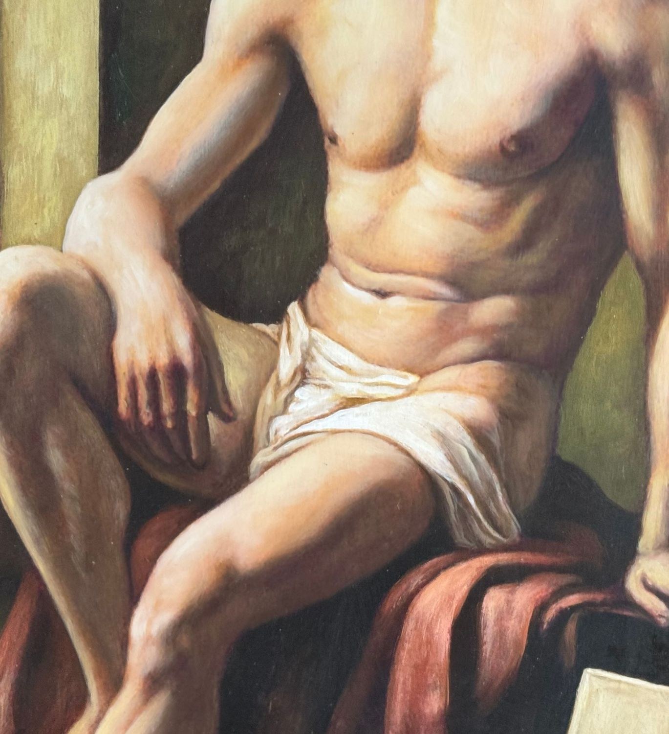 Oil painting on panel, 20th century period, Italian school, depicting Male Nude. Dimensions including frame: 50 x 62 cm. Dimensions inside the frame: 38 x 50 cm. Anonymous artist. Artwork in good condition.