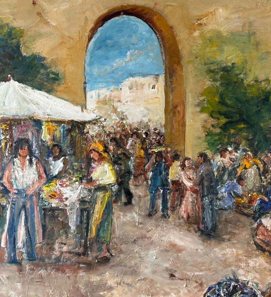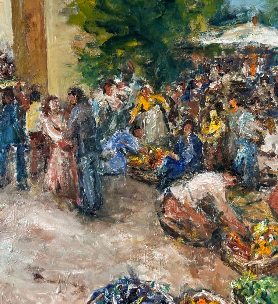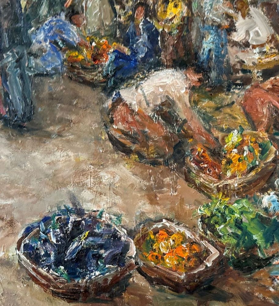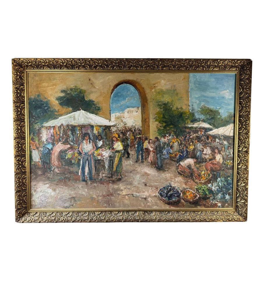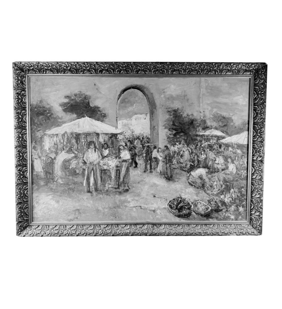 Oil painting on canvas, from the 20th century, Italian school, depicting a market scene. Dimensions including the frame: 102x147 cm. Internal frame dimensions: 90x135 cm. By an anonymous artist. The artwork is in good condition and of great quality.