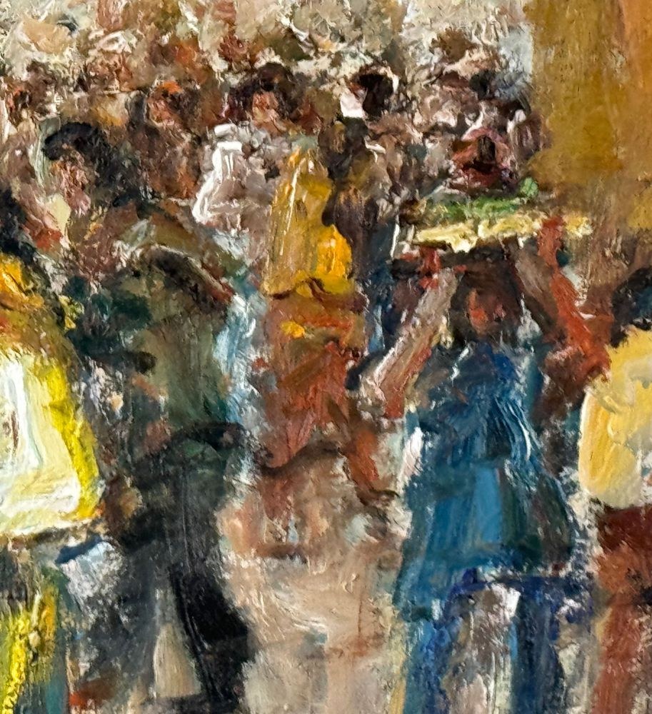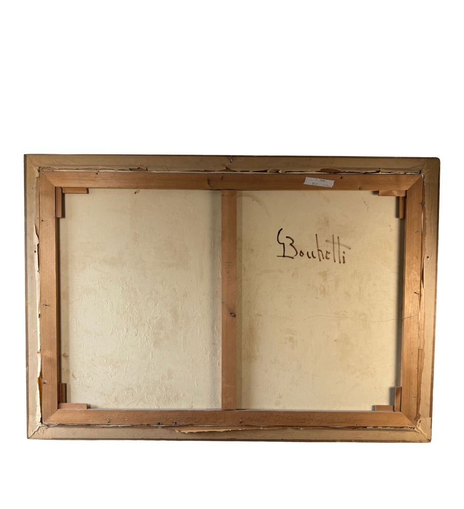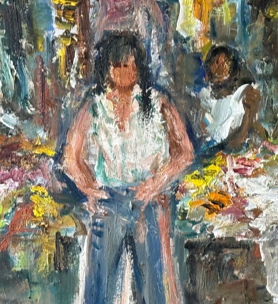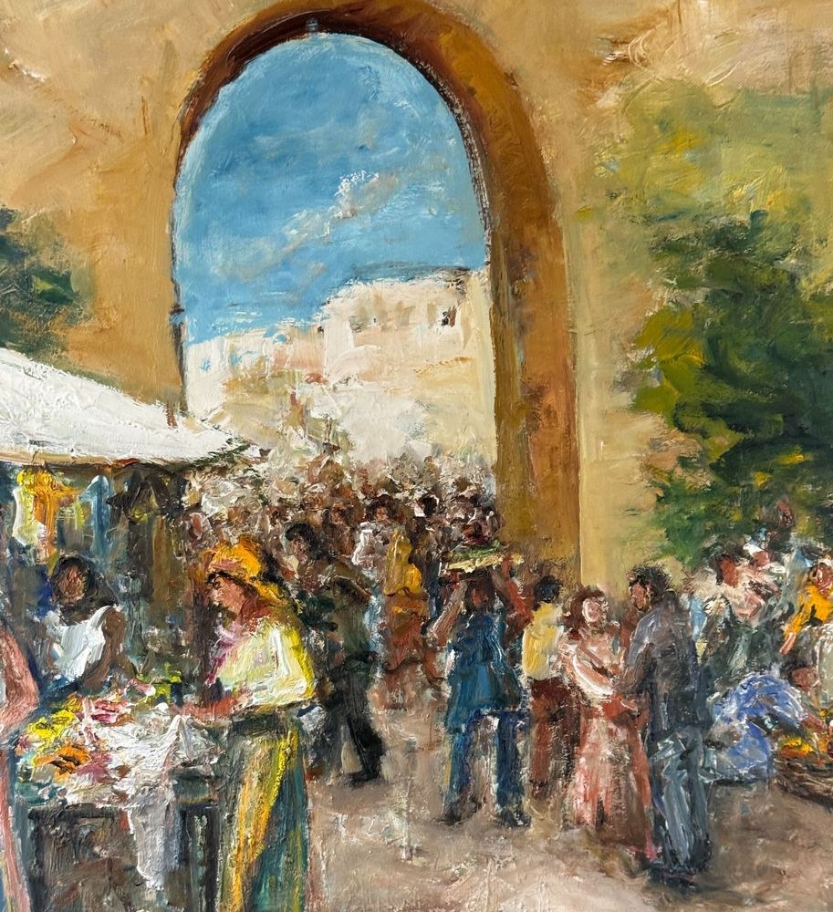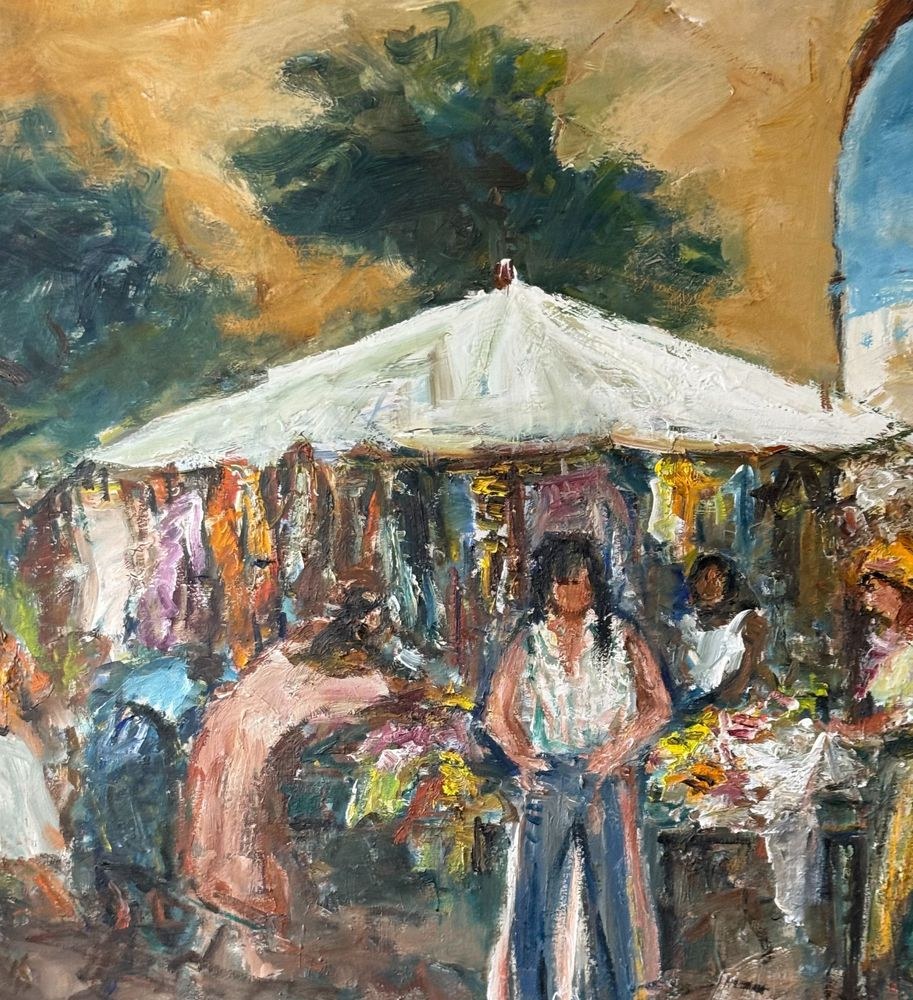 Oil painting on canvas, from the 20th century, Italian school, depicting a market scene. Dimensions including the frame: 102x147 cm. Internal frame dimensions: 90x135 cm. By an anonymous artist. The artwork is in good condition and of great quality.