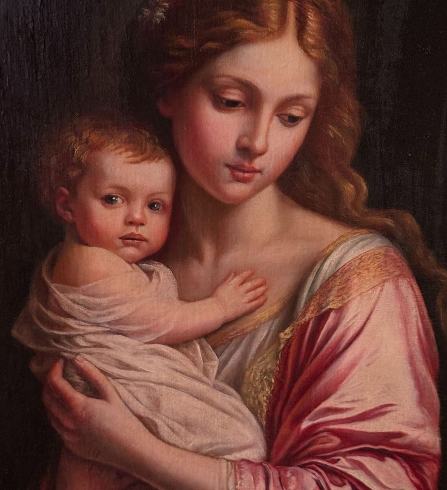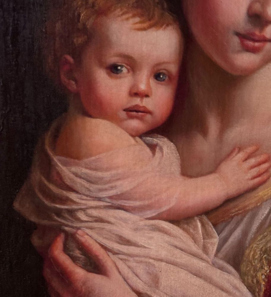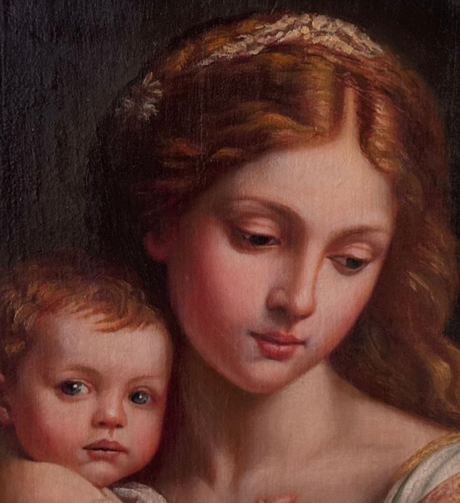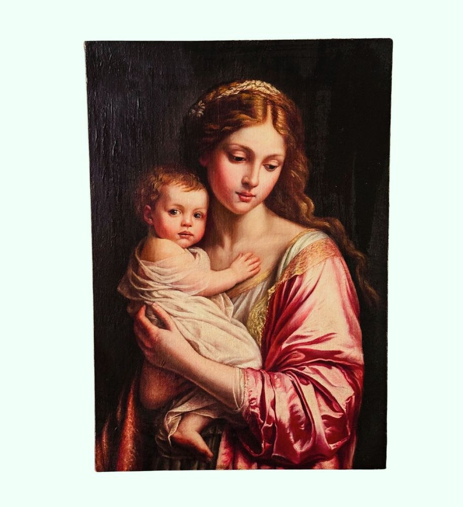 Oil on canvas painting, early 20th century, Italian school, depicting a maternal scene. Dimensions: 36x52 cm. By an anonymous artist. Artwork in excellent condition.