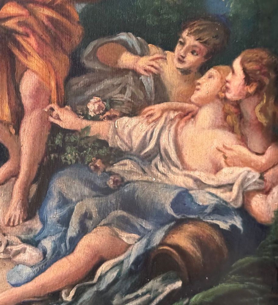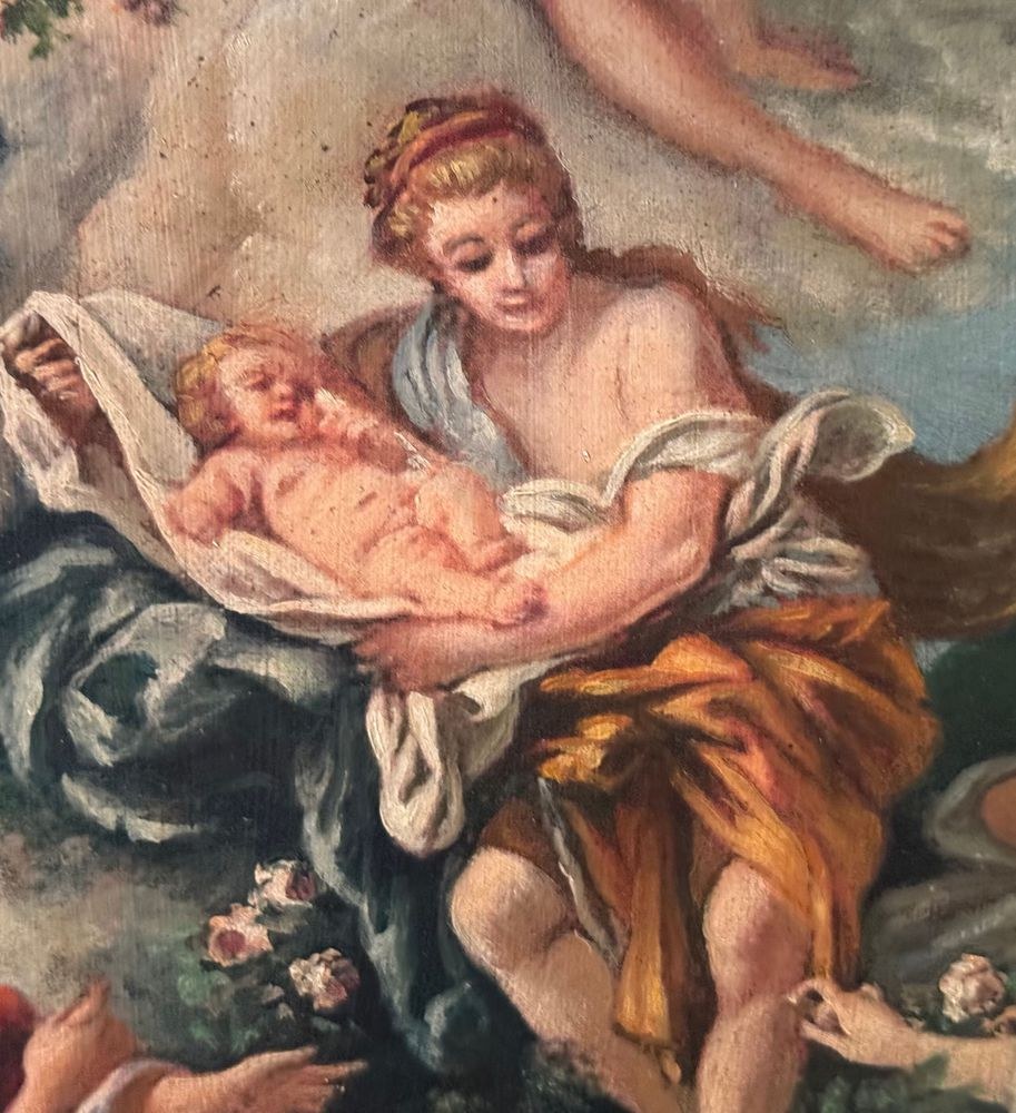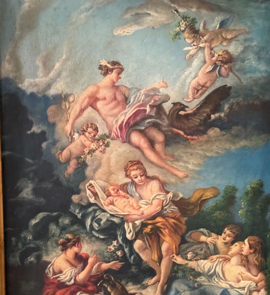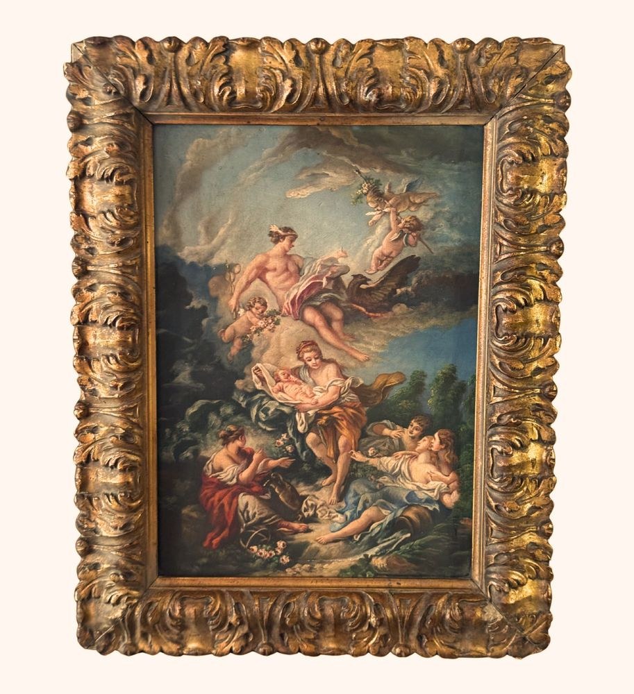 Oil on canvas painting, 19th/20th century, Italian school after François Boucher, depicting Mercury entrusting the infant Bacchus to the Nymphs of Nysa. Dimensions including frame: 43x55 cm. Inner frame dimensions: 31x43 cm. By an anonymous artist. Artwork in good condition with minor signs of age, as shown in the attached photos.