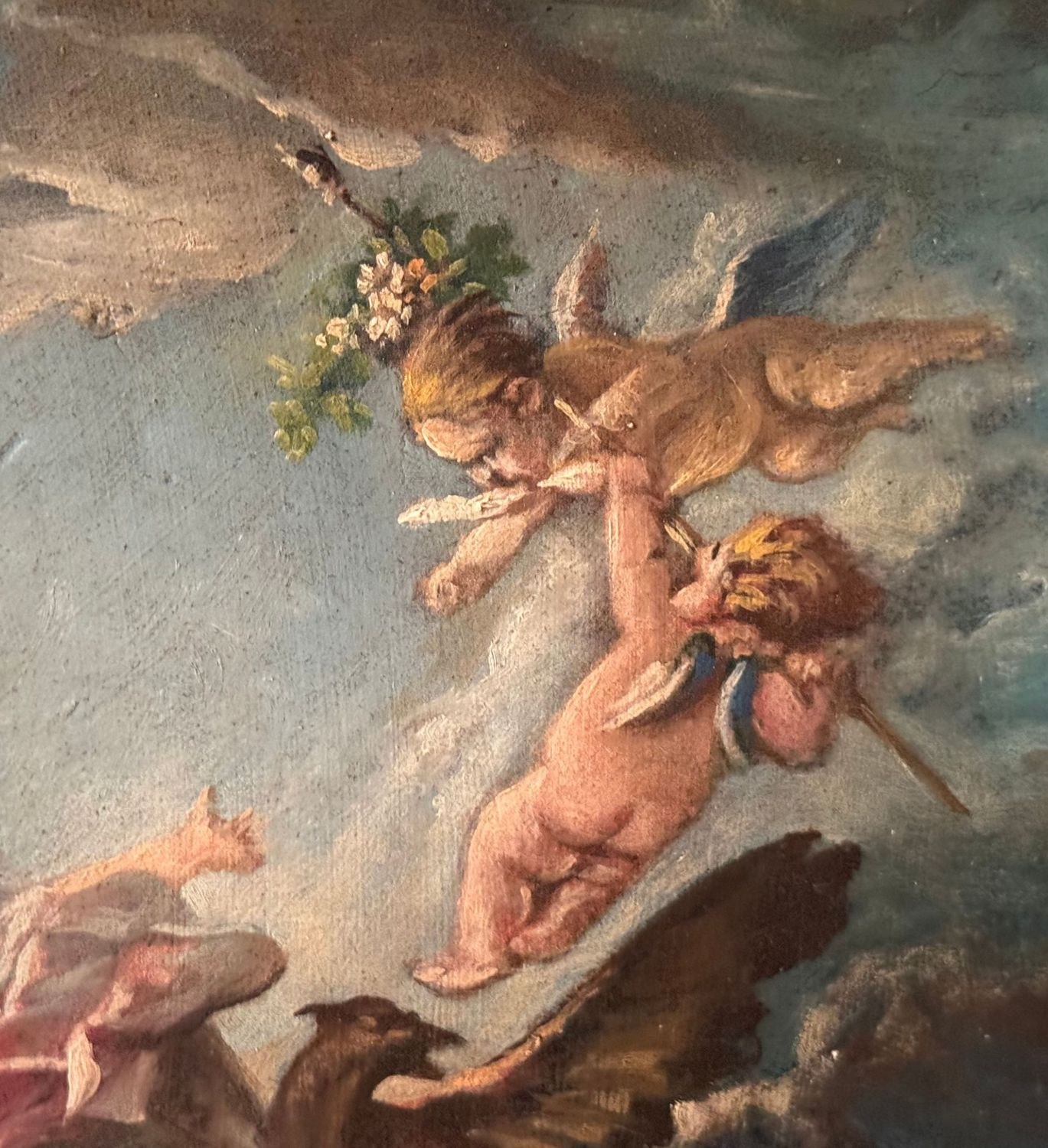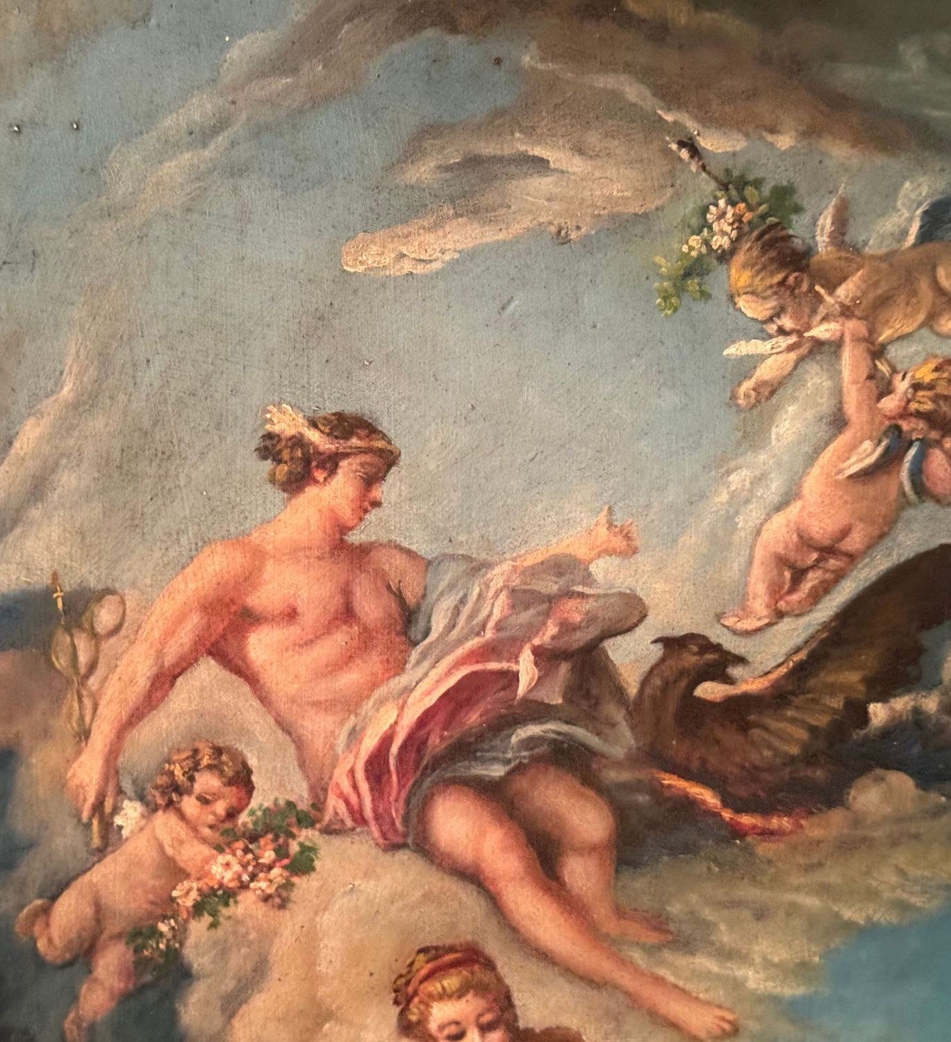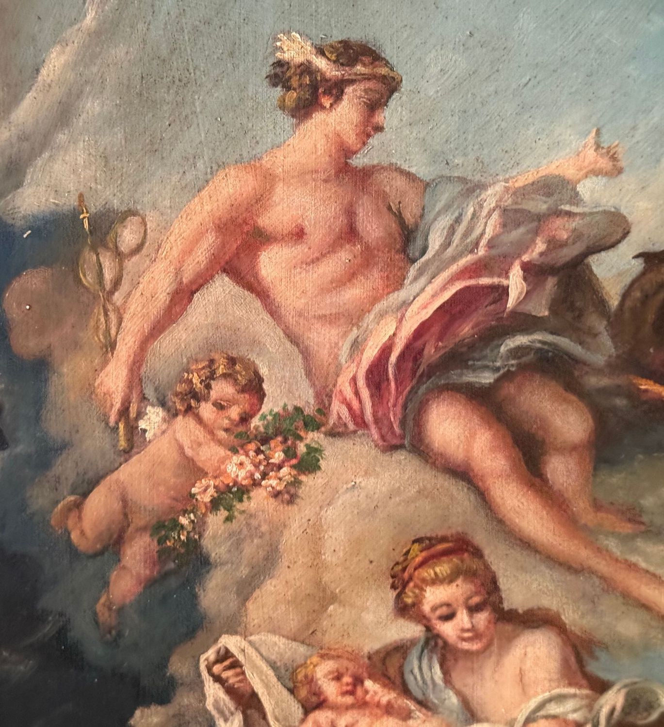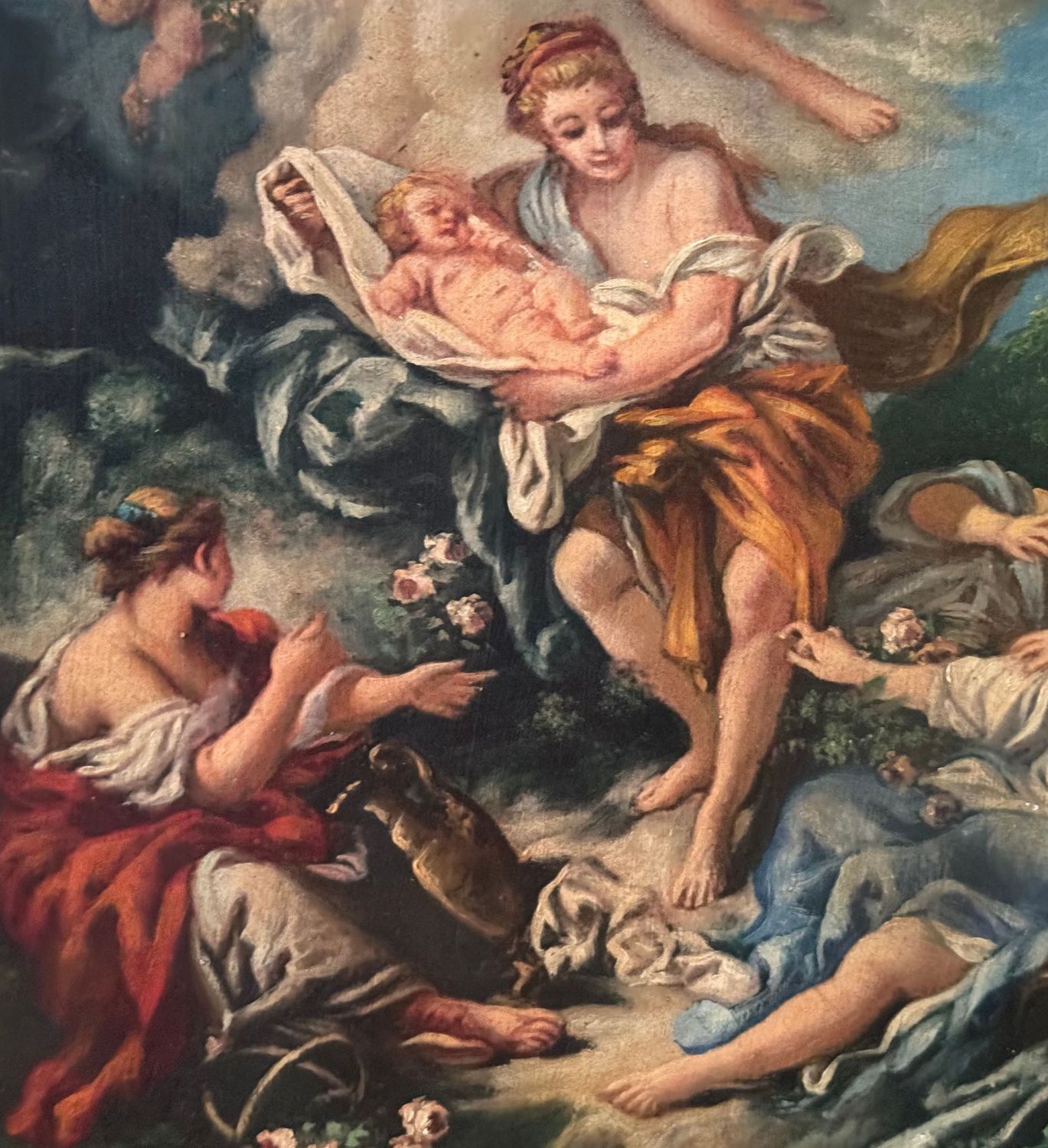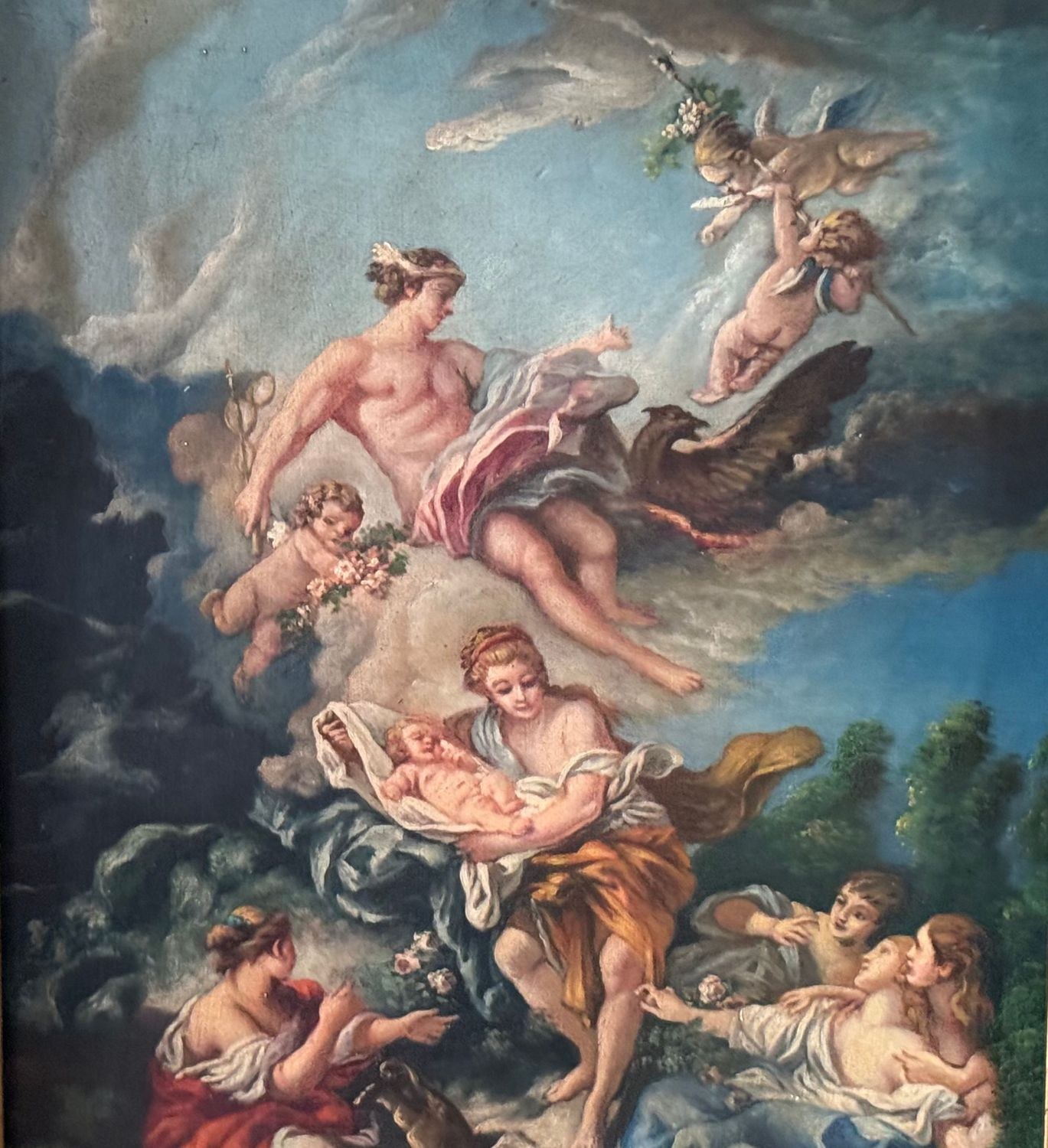 Oil on canvas painting, 19th/20th century, Italian school after François Boucher, depicting Mercury entrusting the infant Bacchus to the Nymphs of Nysa. Dimensions including frame: 43x55 cm. Inner frame dimensions: 31x43 cm. By an anonymous artist. Artwork in good condition with minor signs of age, as shown in the attached photos.