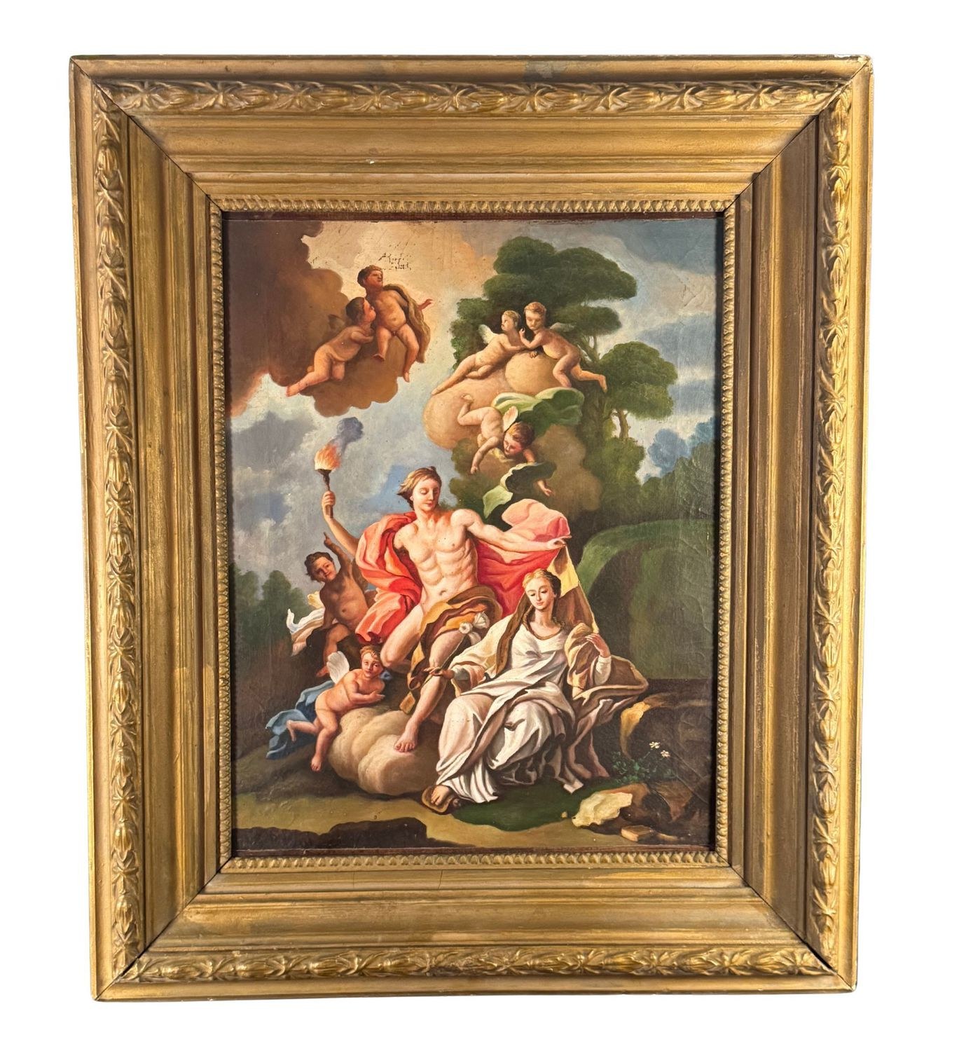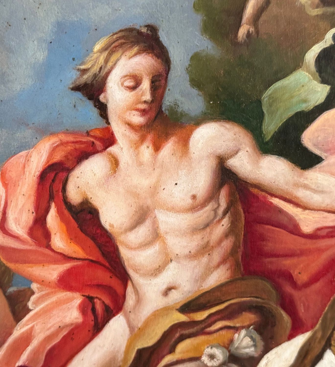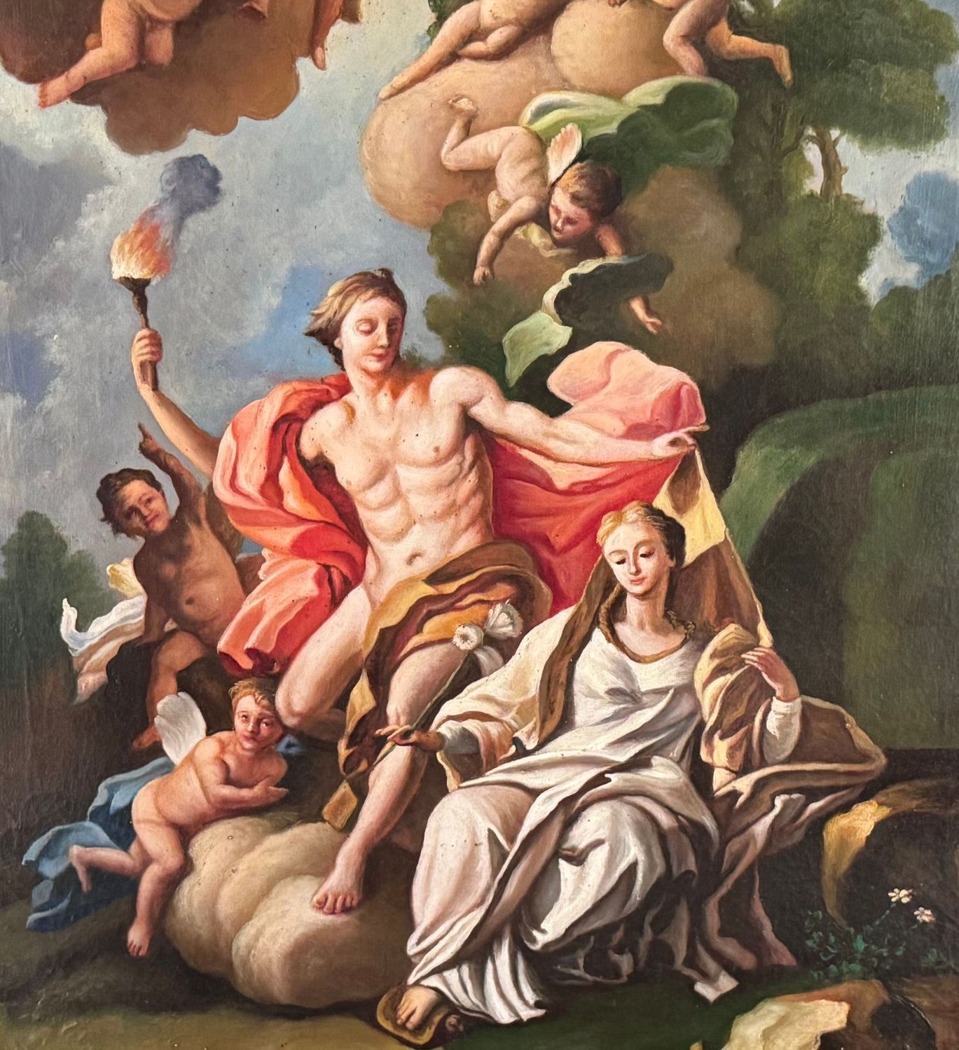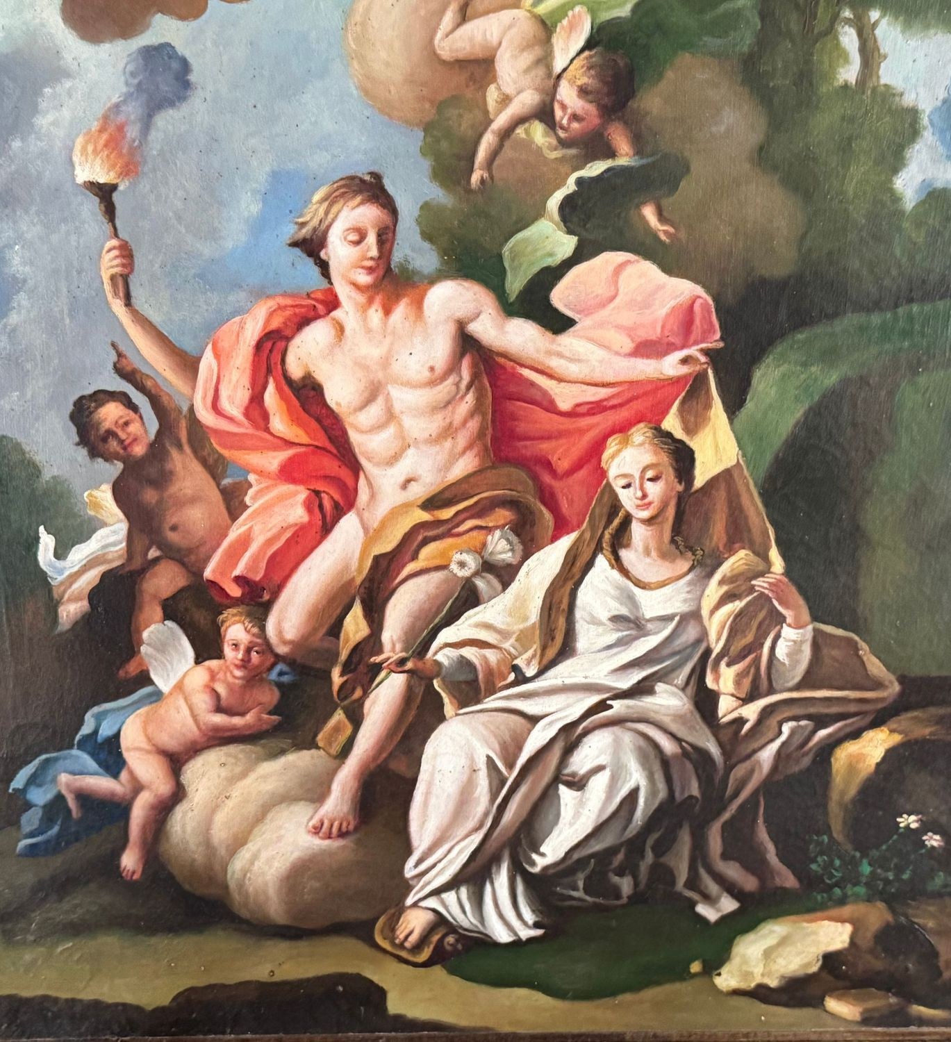 Oil on canvas painting, 20th century, Italian school, depicting a Mythological Scene. Dimensions including frame: 76x92 cm. Inner frame dimensions: 50x63 cm. By an anonymous artist, after a work by Giulio Carpioni (17th-century artist). The artwork is in good condition with slight signs of age, as shown in the attached photos, and of excellent artistic quality.