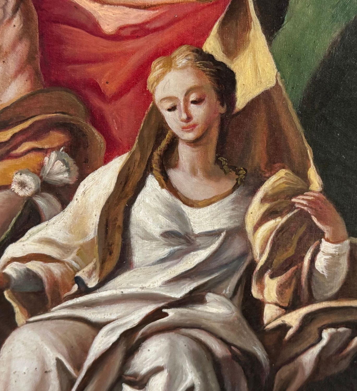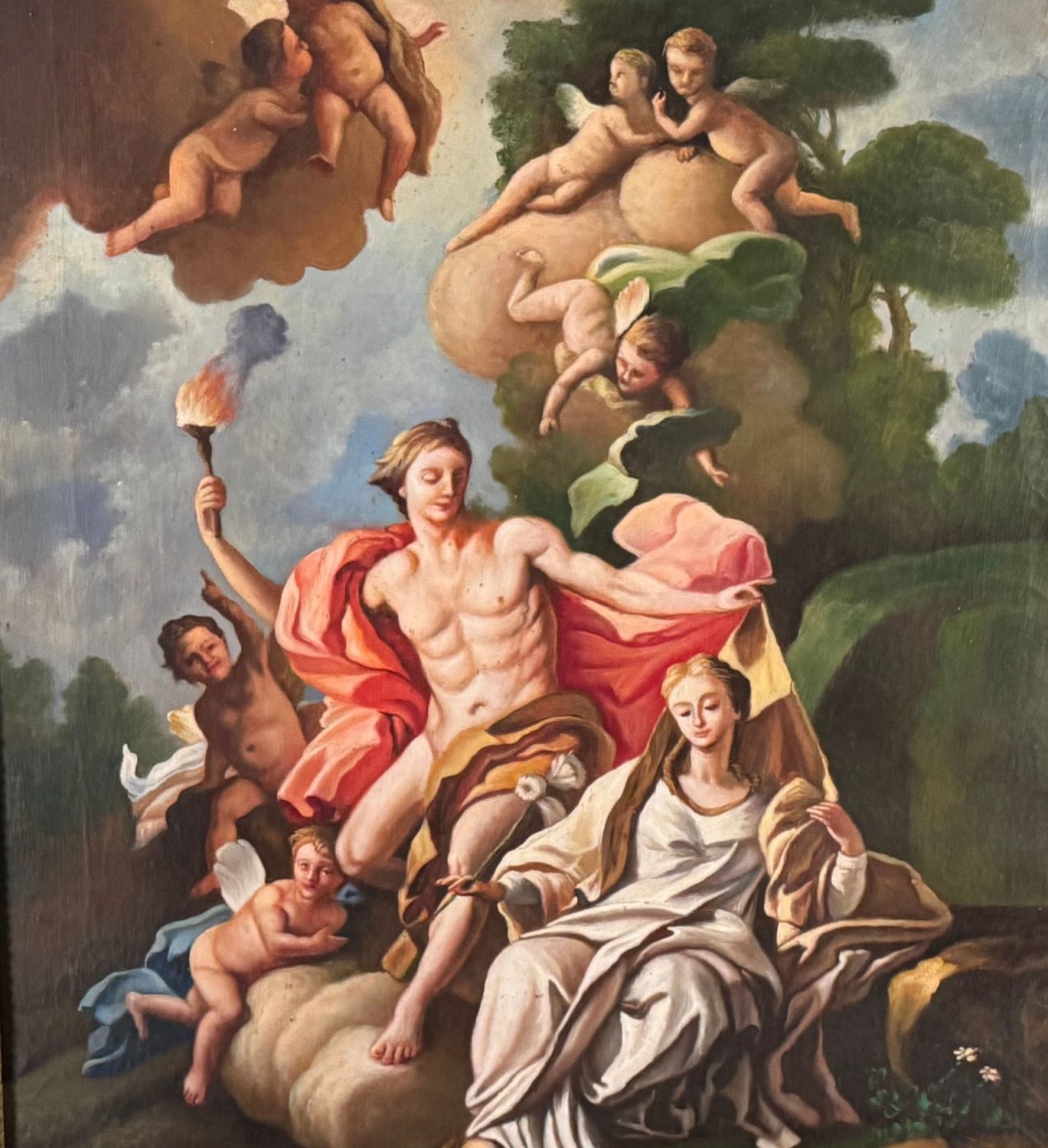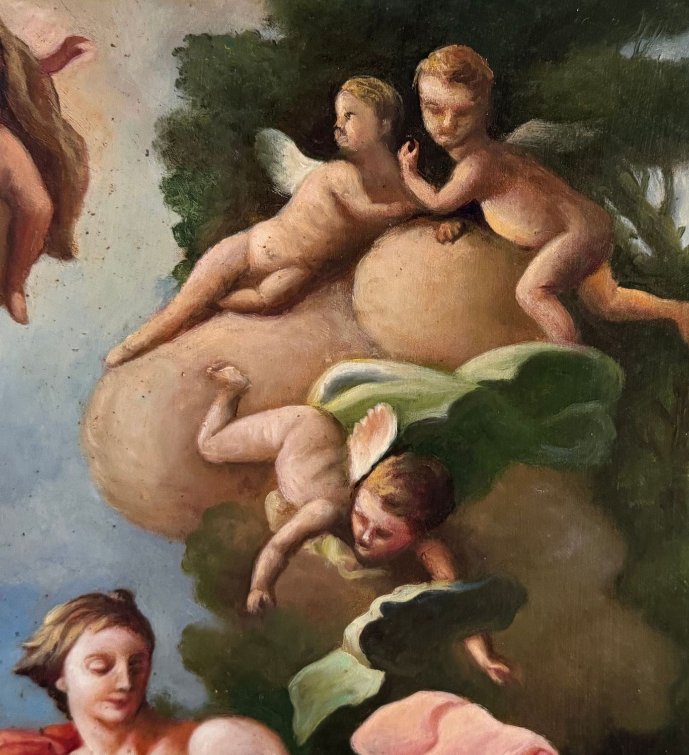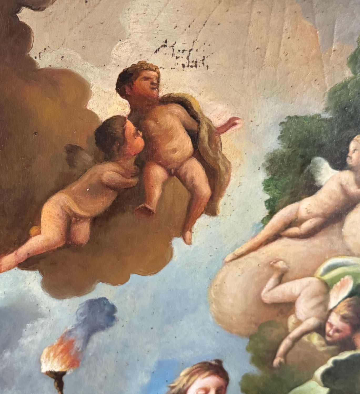 Oil on canvas painting, 20th century, Italian school, depicting a Mythological Scene. Dimensions including frame: 76x92 cm. Inner frame dimensions: 50x63 cm. By an anonymous artist, after a work by Giulio Carpioni (17th-century artist). The artwork is in good condition with slight signs of age, as shown in the attached photos, and of excellent artistic quality.