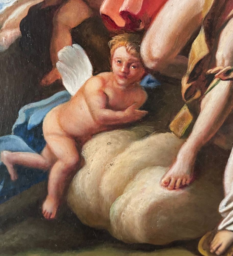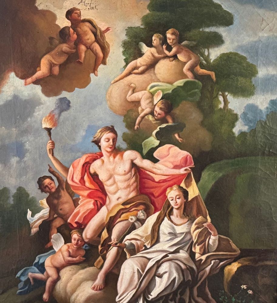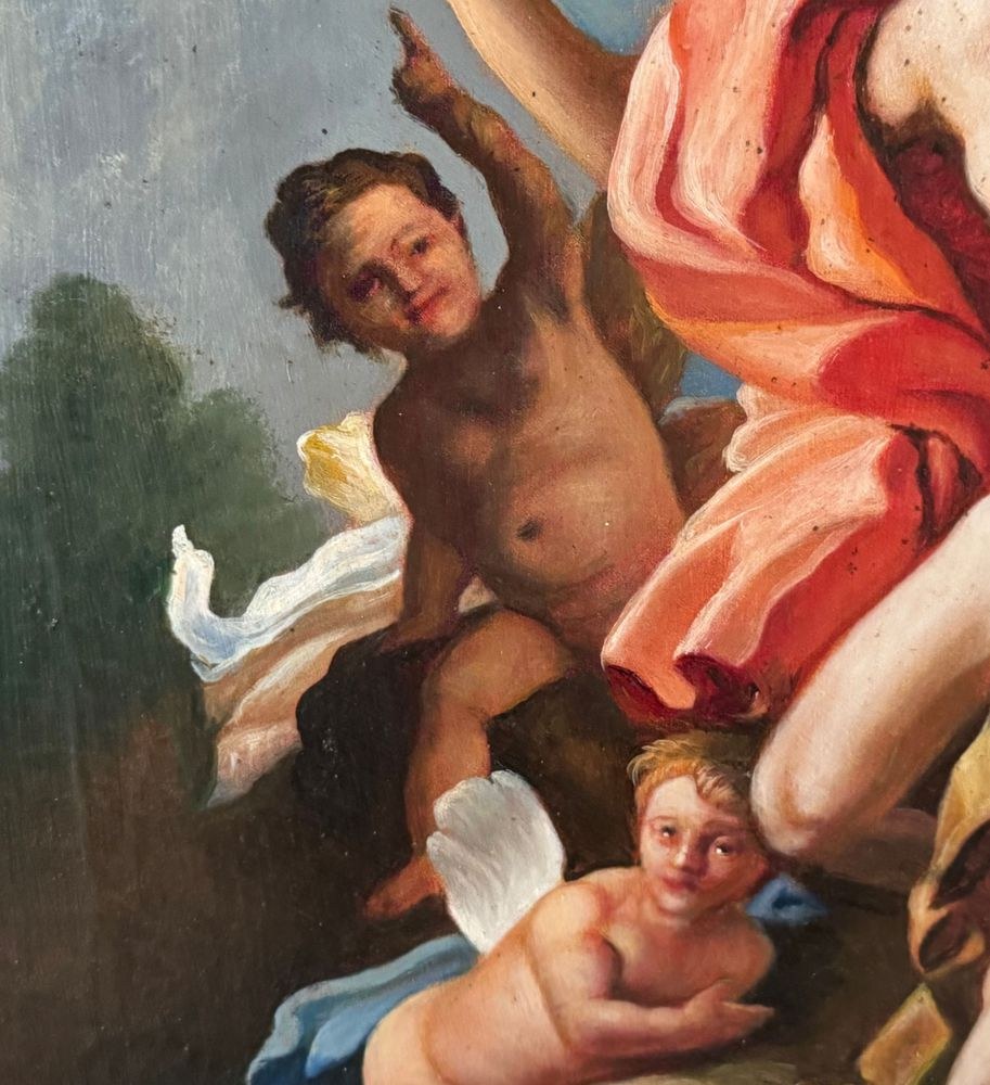 Oil on canvas painting, 20th century, Italian school, depicting a Mythological Scene. Dimensions including frame: 76x92 cm. Inner frame dimensions: 50x63 cm. By an anonymous artist, after a work by Giulio Carpioni (17th-century artist). The artwork is in good condition with slight signs of age, as shown in the attached photos, and of excellent artistic quality.