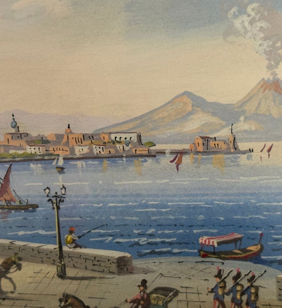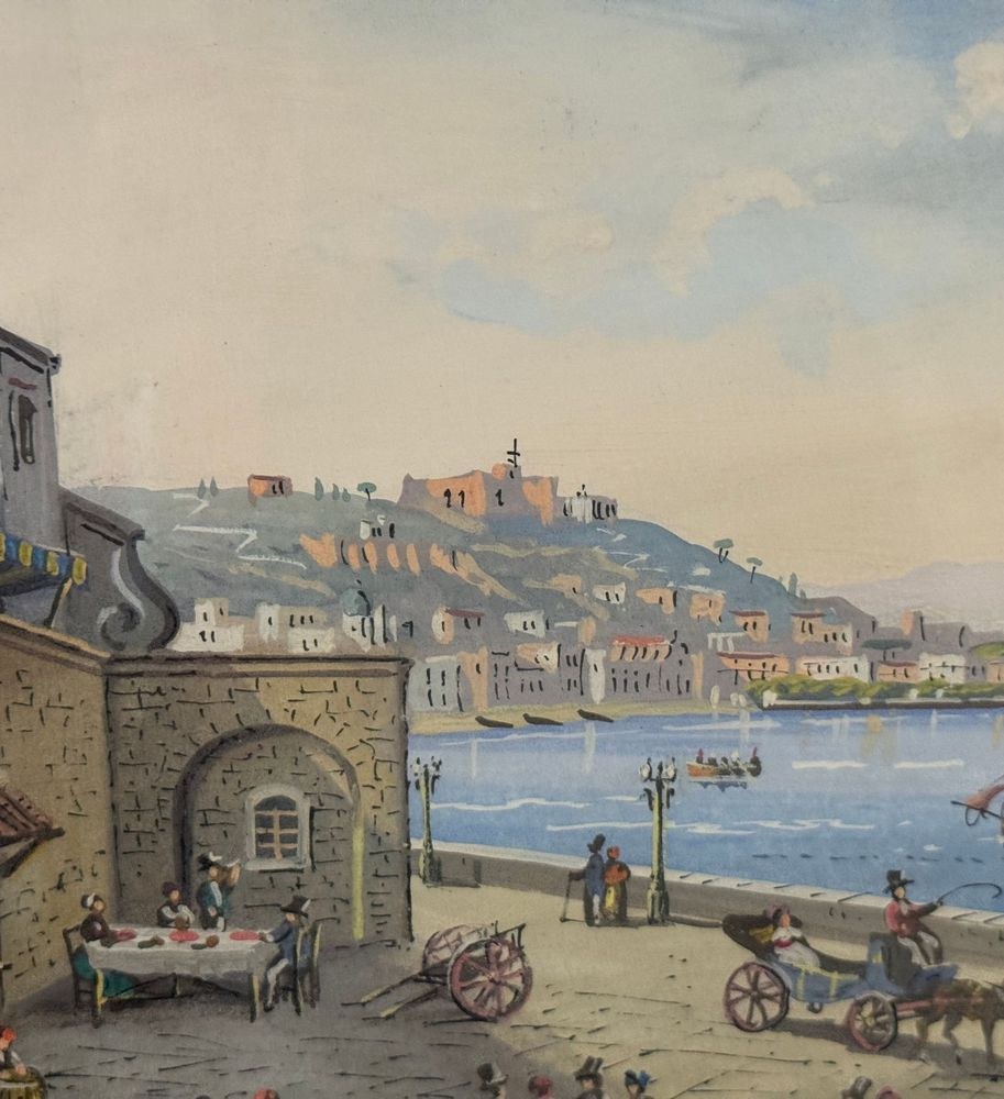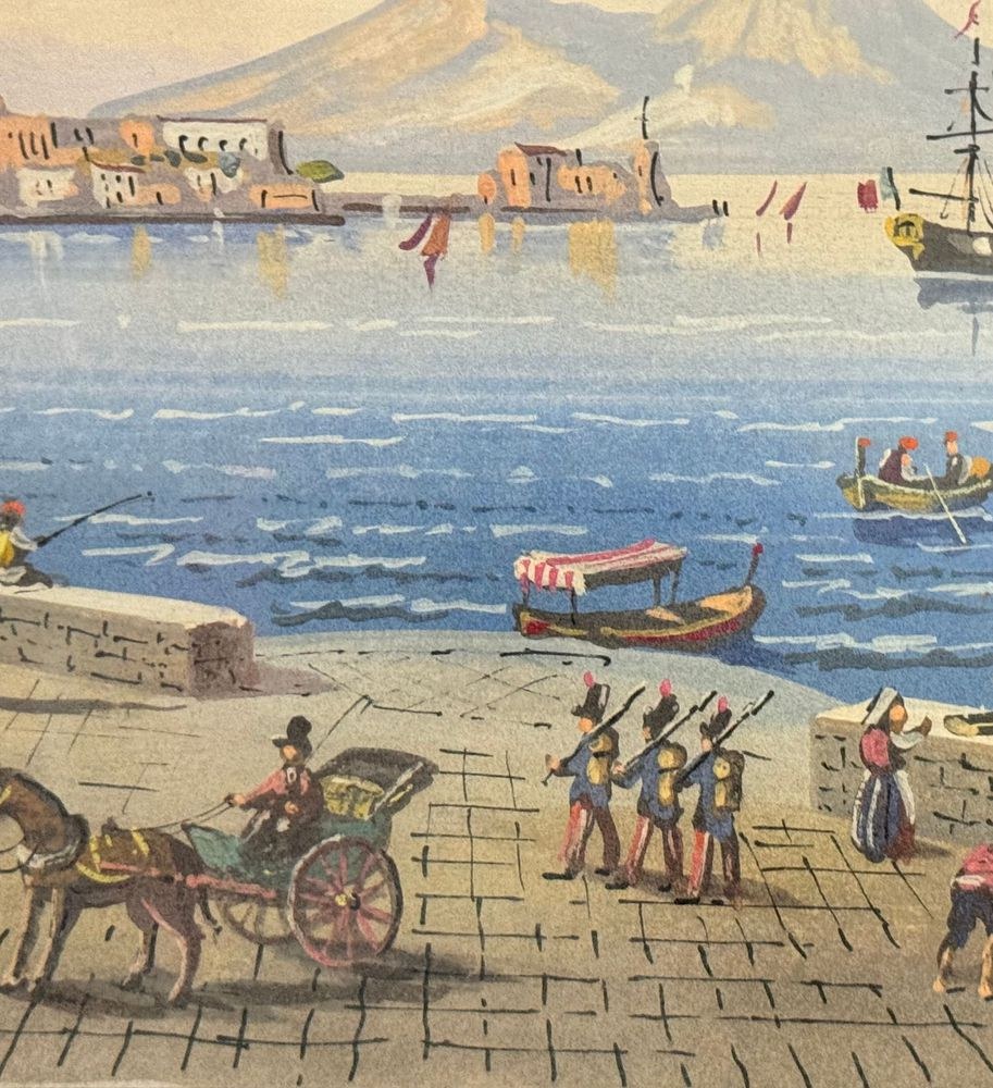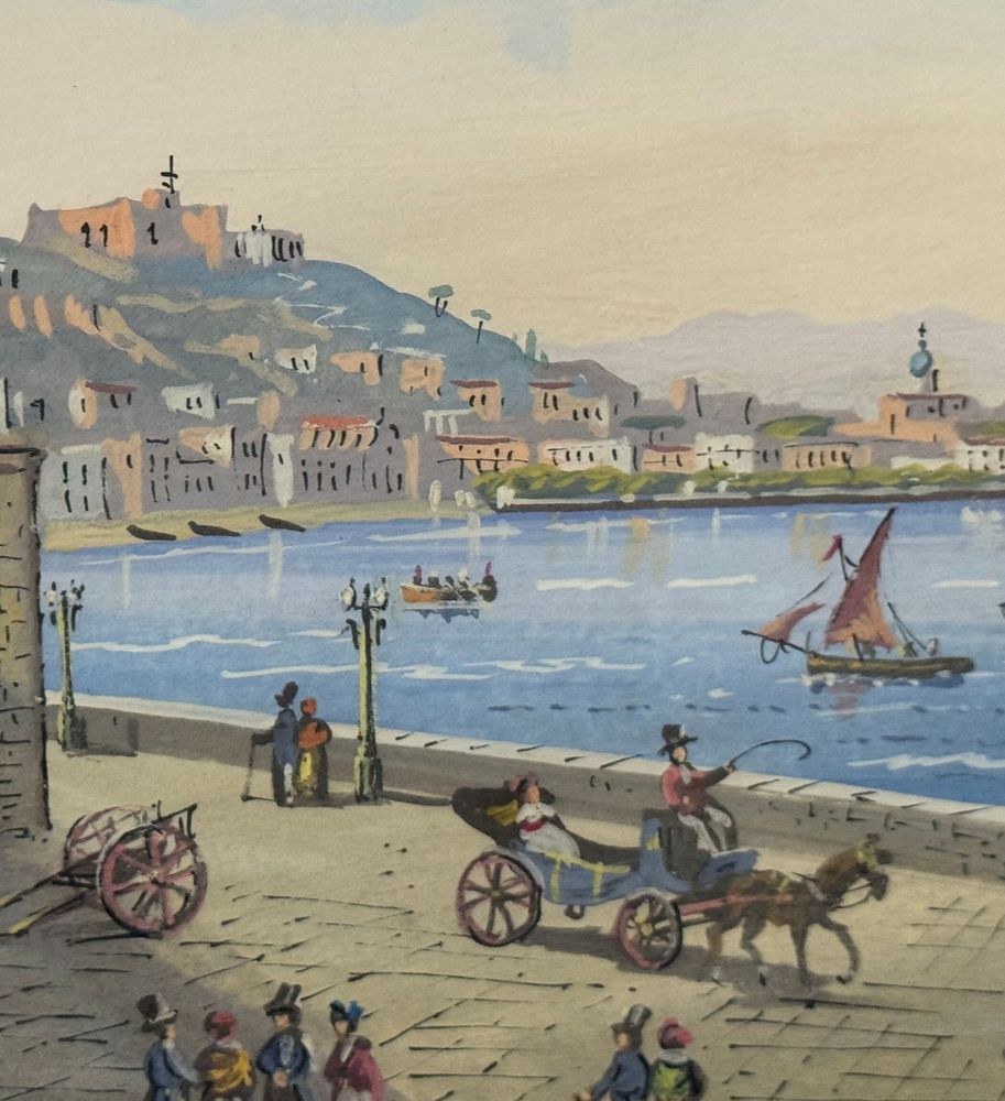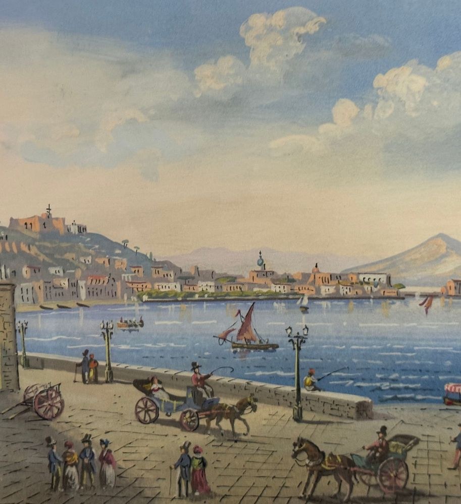 Gouache painting (tempera on paper), 20th century, Italian school, depicting Naples from Mergellina. Dimensions including frame: 45x33 cm. Dimensions inside the frame: 38x26 cm. By an anonymous artist. Artwork in good condition.