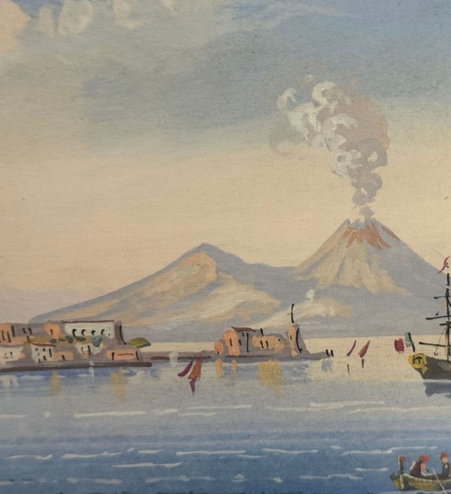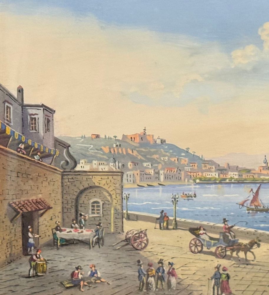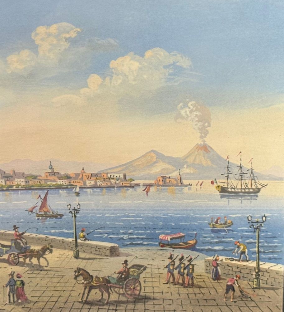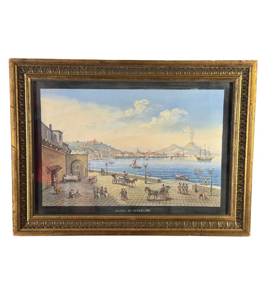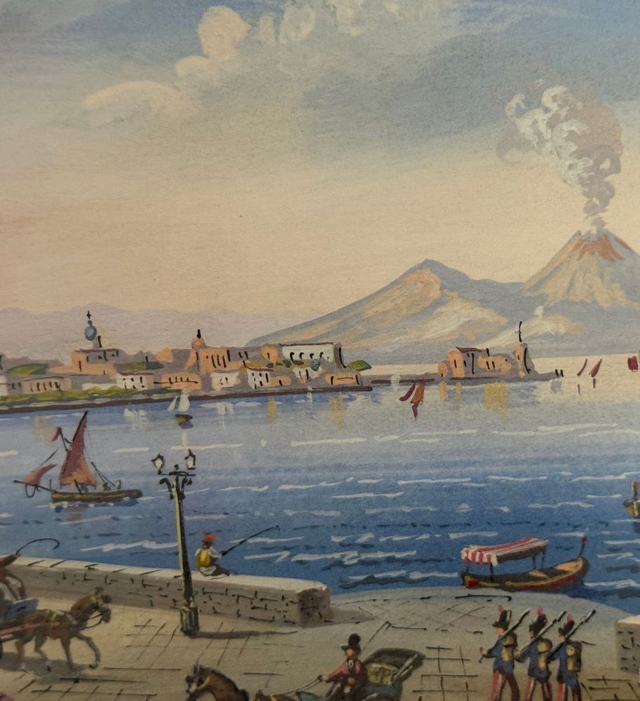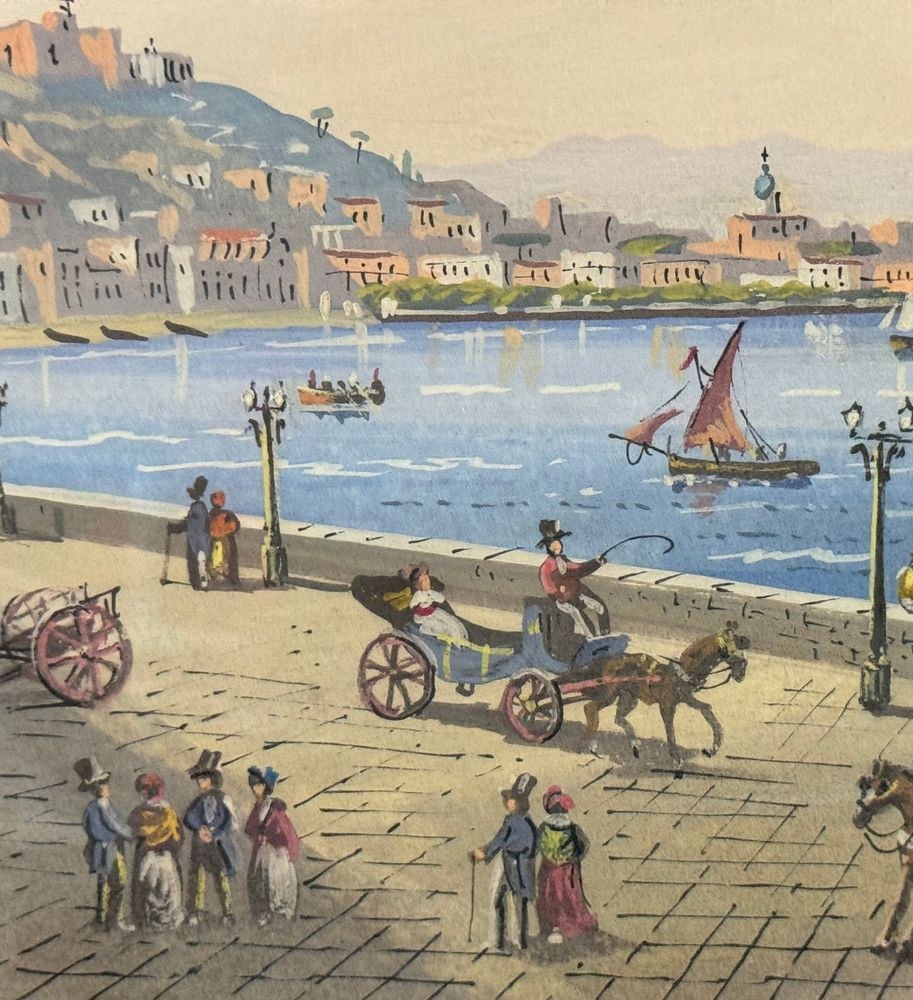 Gouache painting (tempera on paper), 20th century, Italian school, depicting Naples from Mergellina. Dimensions including frame: 45x33 cm. Dimensions inside the frame: 38x26 cm. By an anonymous artist. Artwork in good condition.