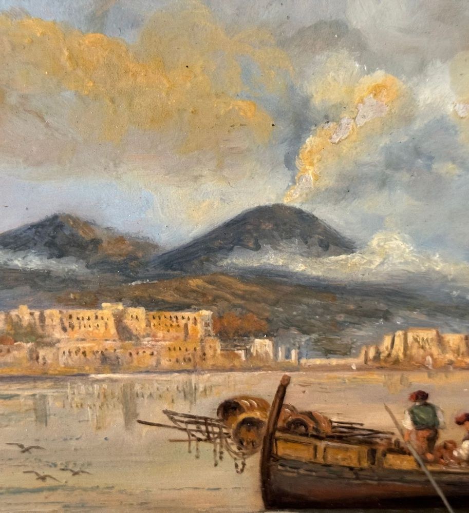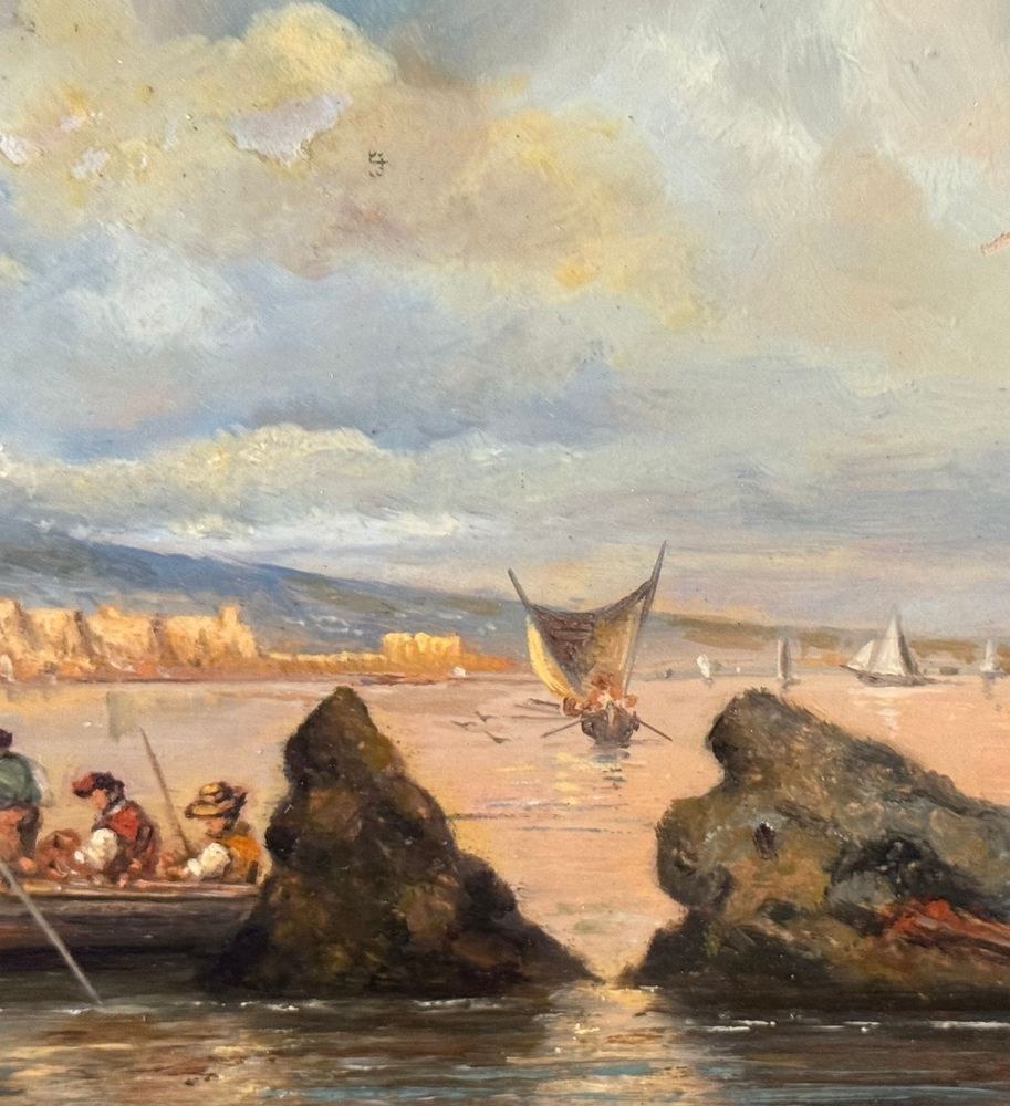 Oil painting on board, 20th century period, Italian school, depicting a Neapolitan Seascape with Boats and Fishermen. Dimensions: 30x17 cm. By an anonymous artist. The work is in good condition.