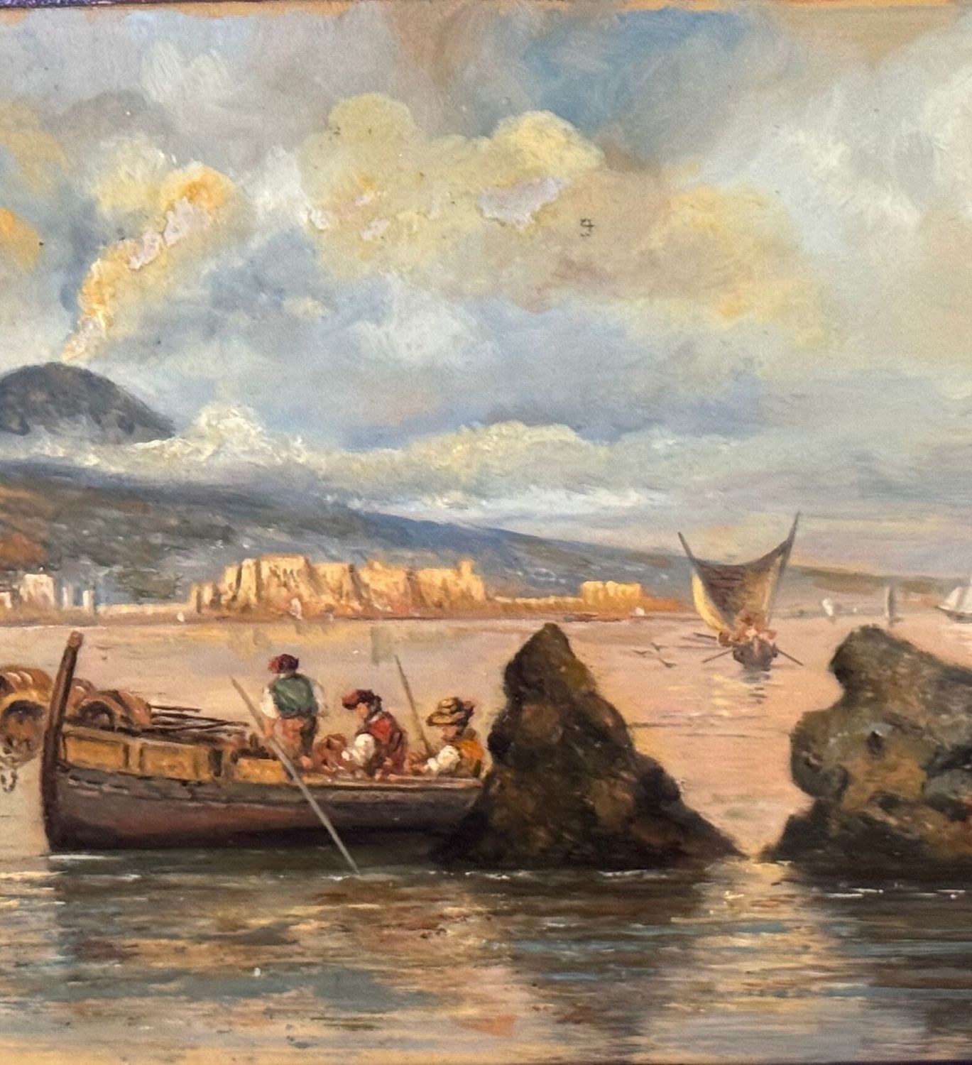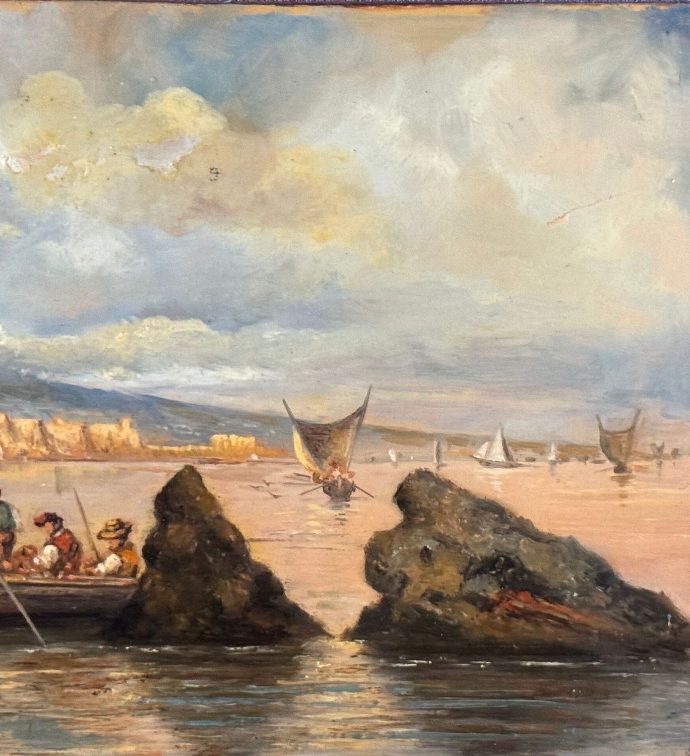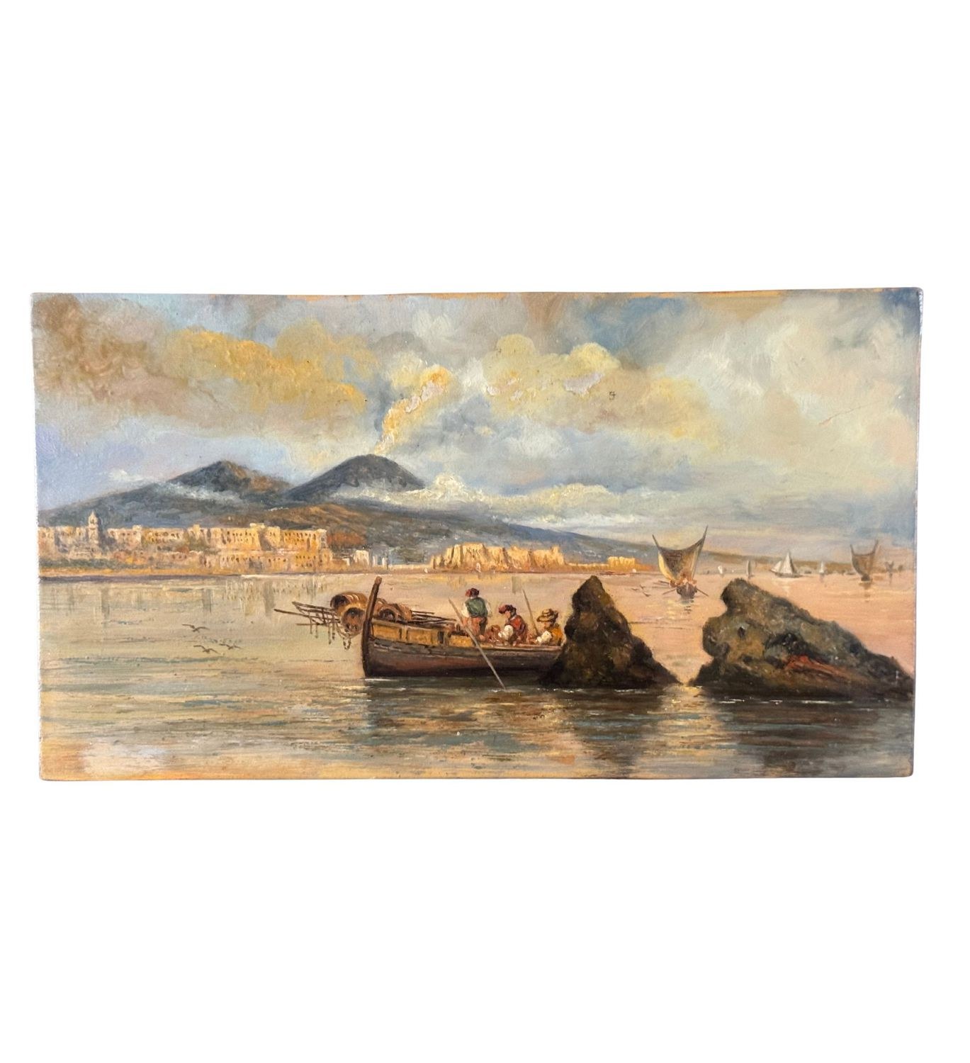 Oil painting on board, 20th century period, Italian school, depicting a Neapolitan Seascape with Boats and Fishermen. Dimensions: 30x17 cm. By an anonymous artist. The work is in good condition.