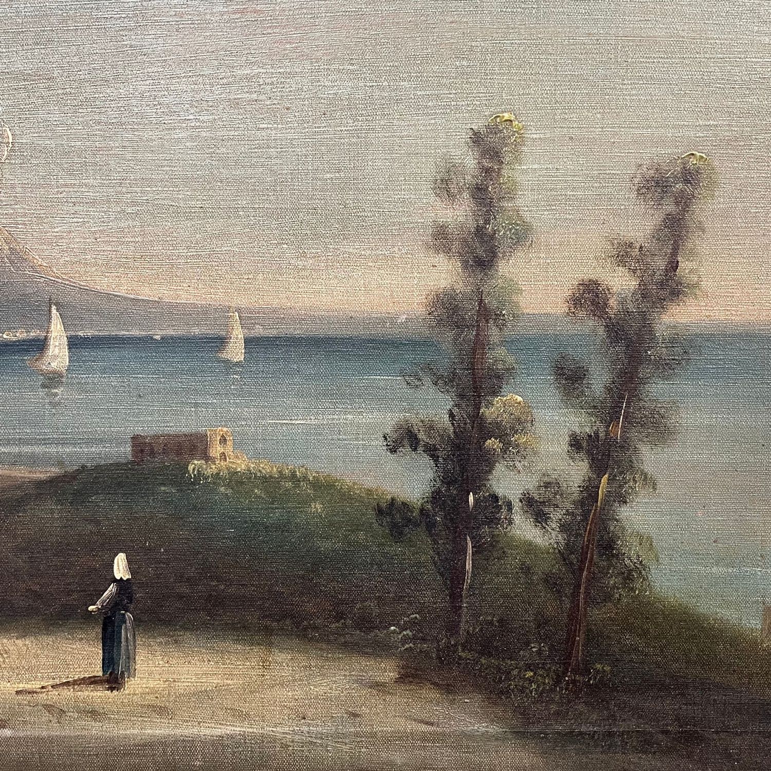 Oil painting on canvas, 19th/20th century period, Italian school (Naples), depicting a glimpse of the Neapolitan seaside and Mount Vesuvius. Small defects on the canvas. Interior frame dimensions: 53x28 cm. Artist: Anonymous.