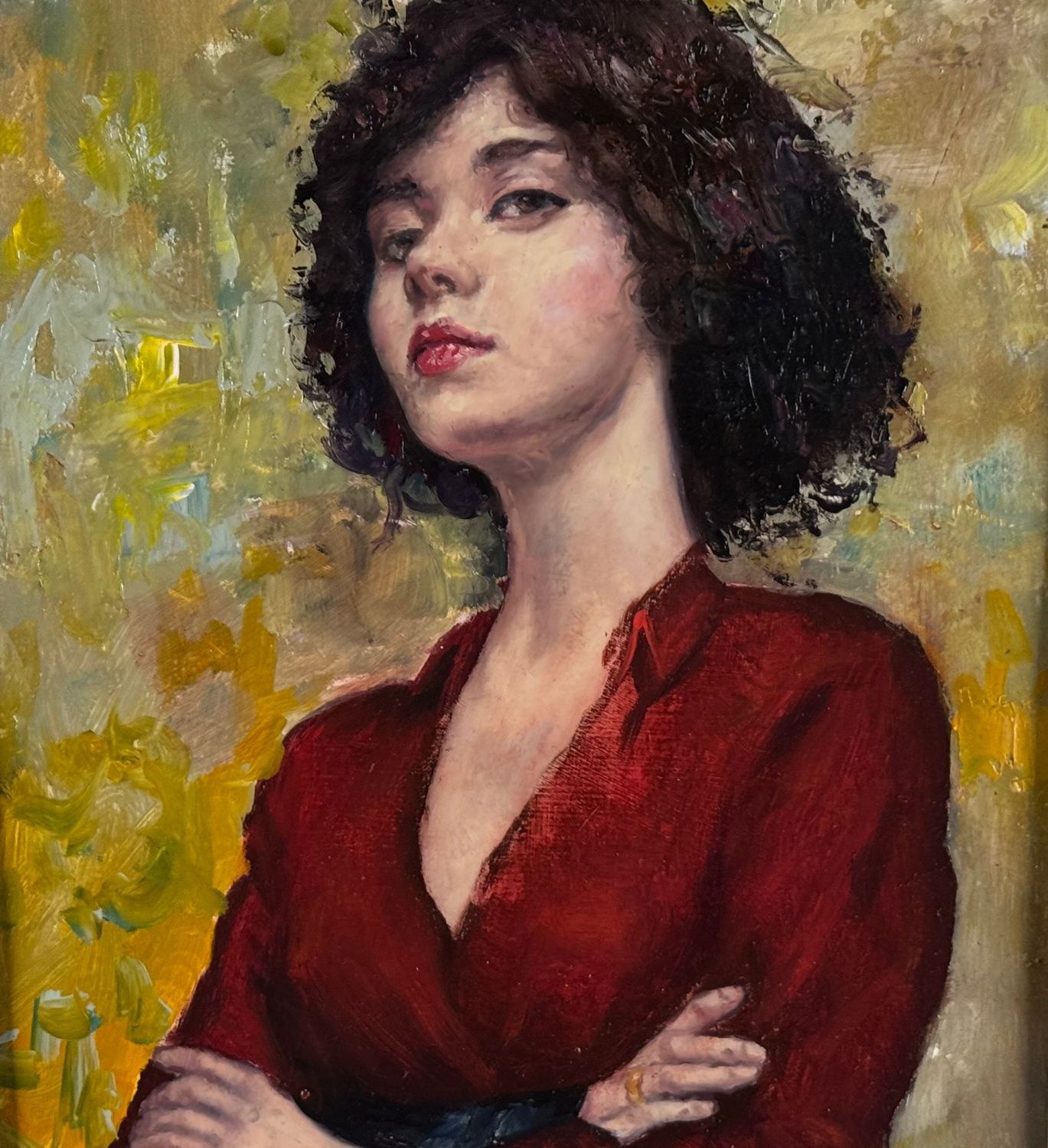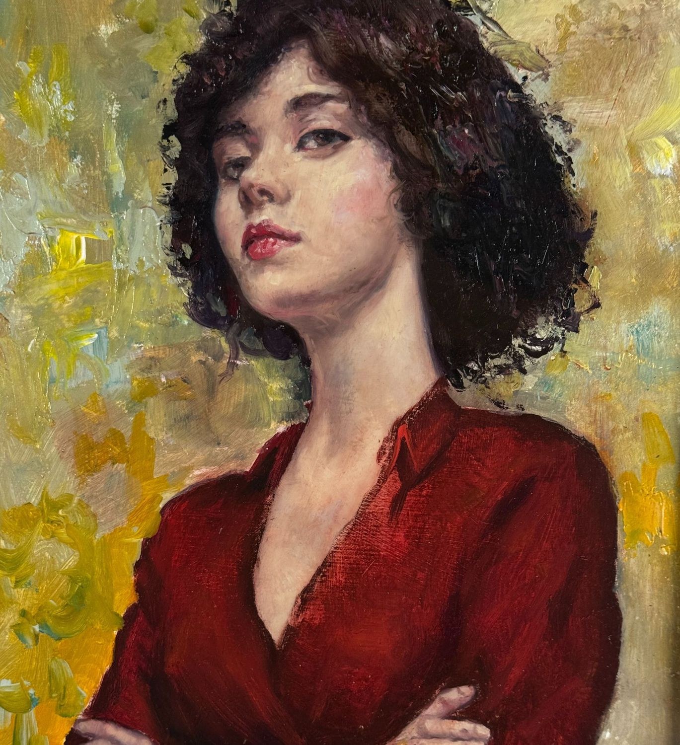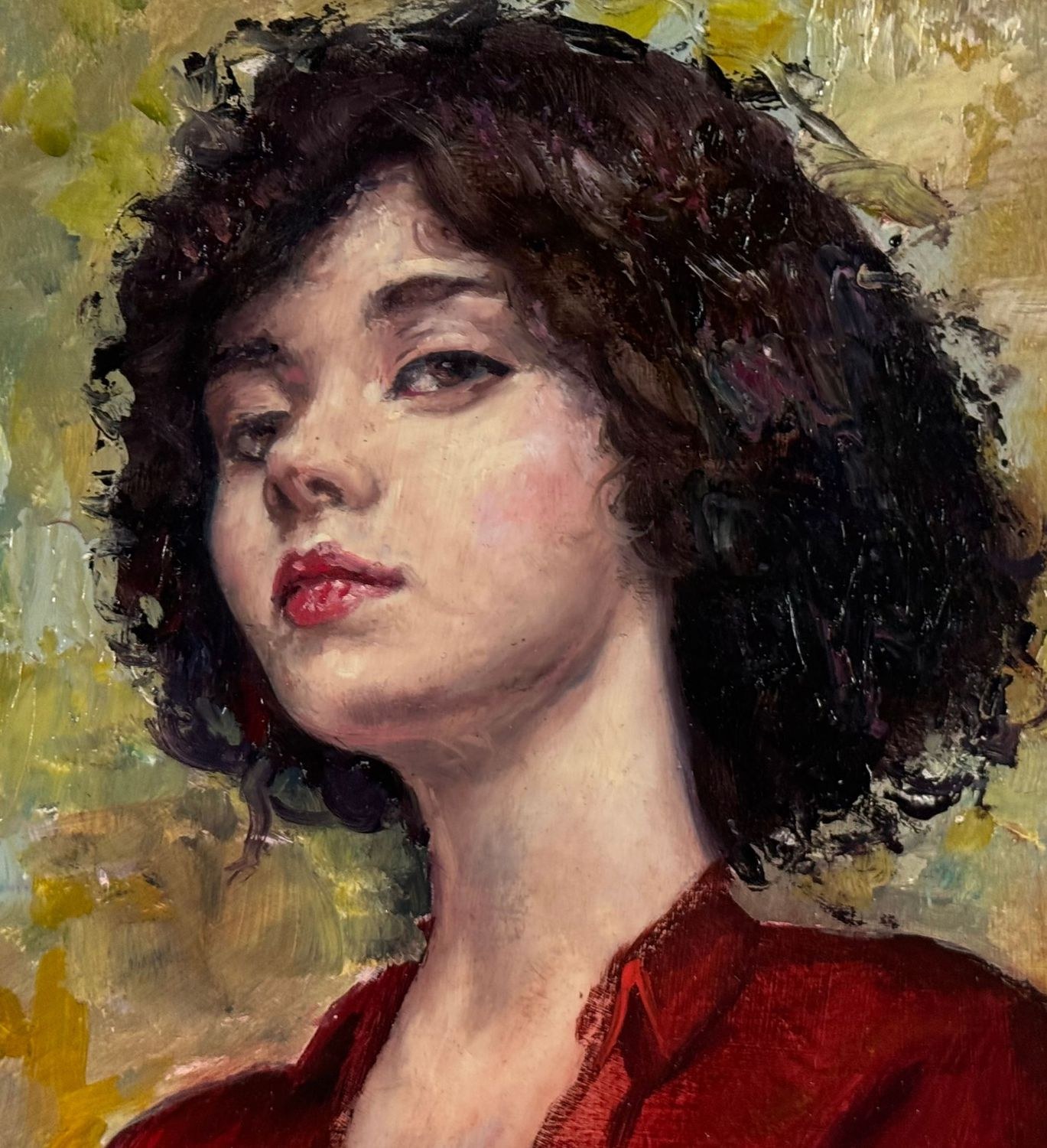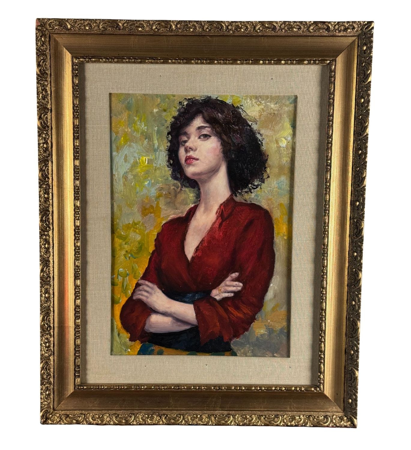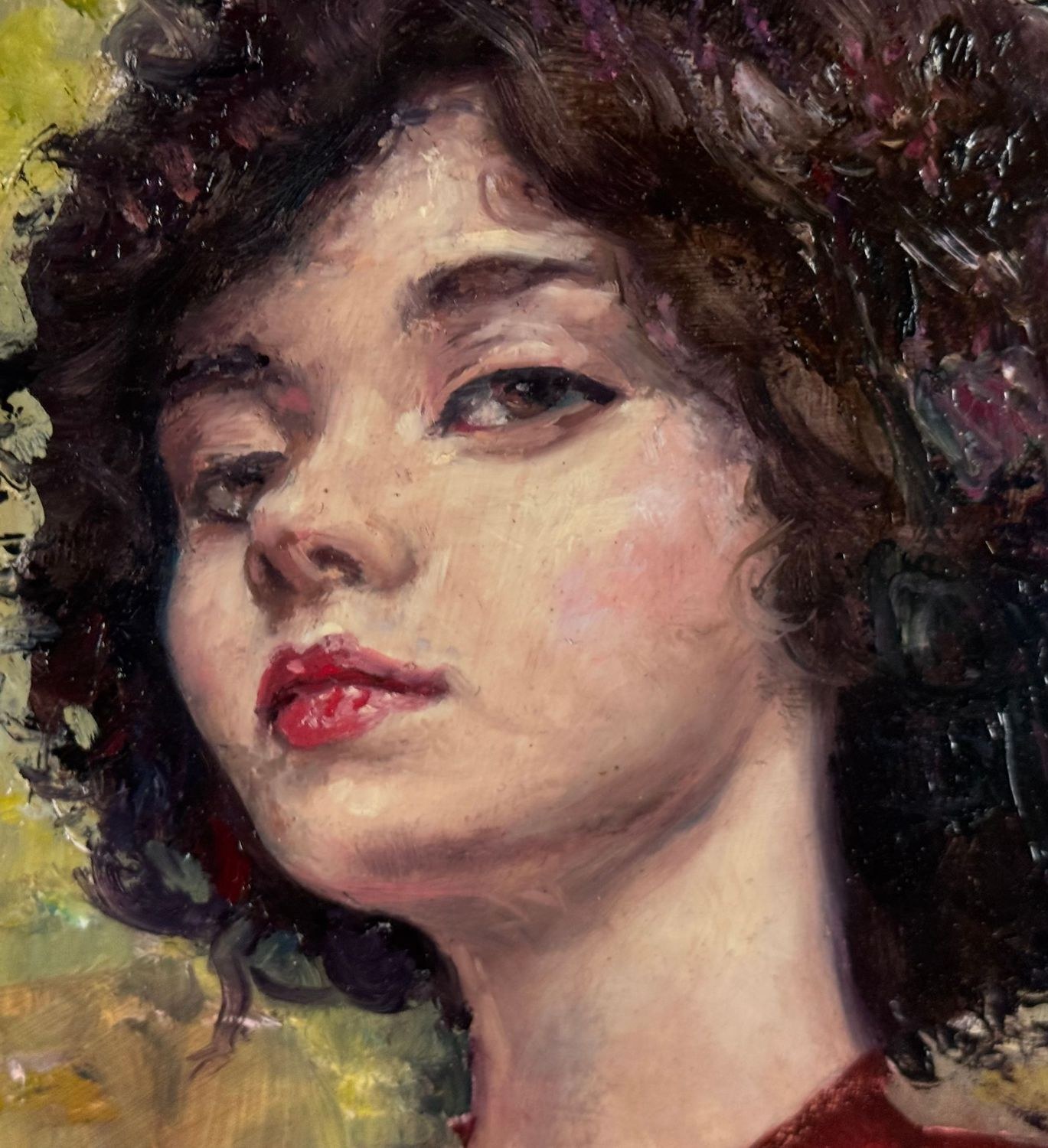 Oil painting on panel, 20th-century period, Italian school, depicting *Portrait of a Woman in a Red Dress*. Dimensions including frame: 54 × 67 cm; inner frame dimensions: 38 × 48.7 cm. By an anonymous artist. The artwork is in good condition.