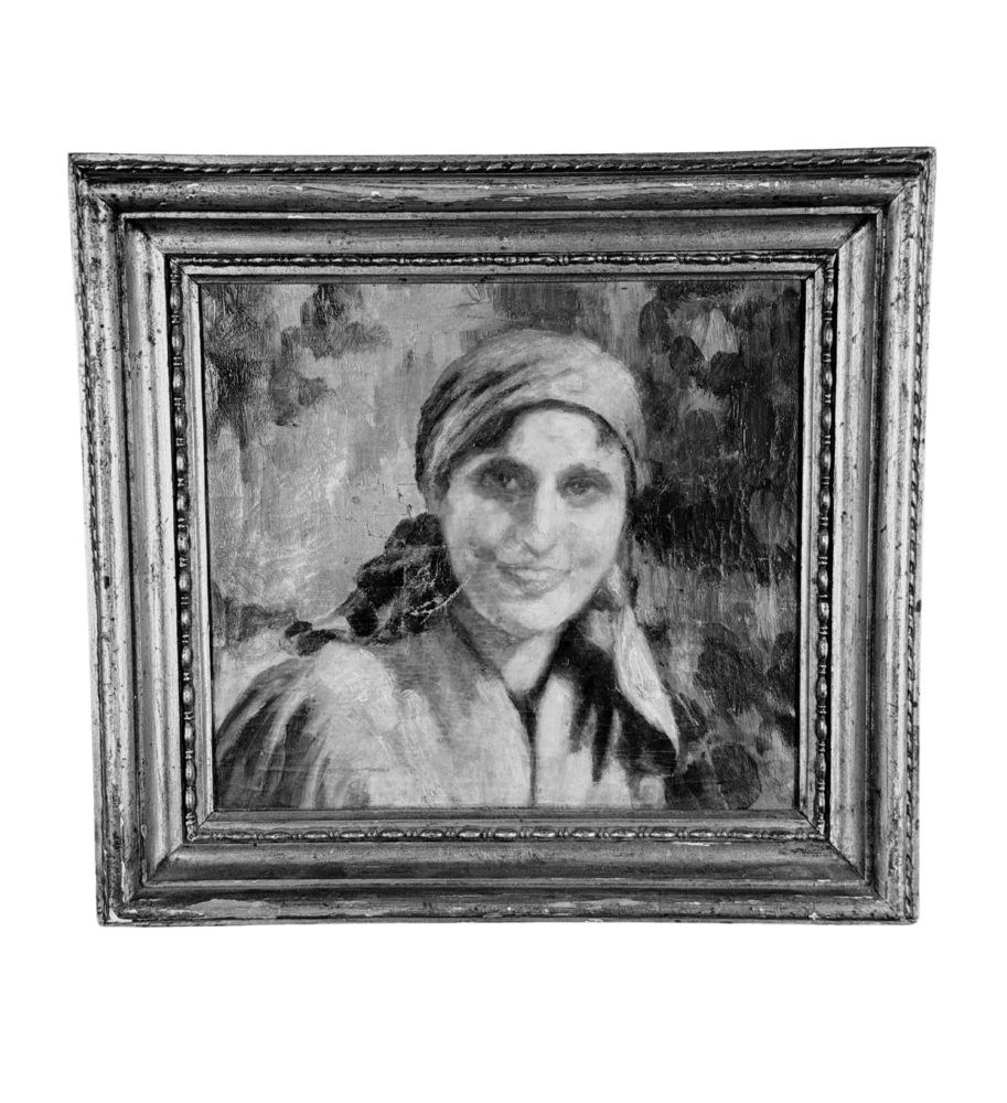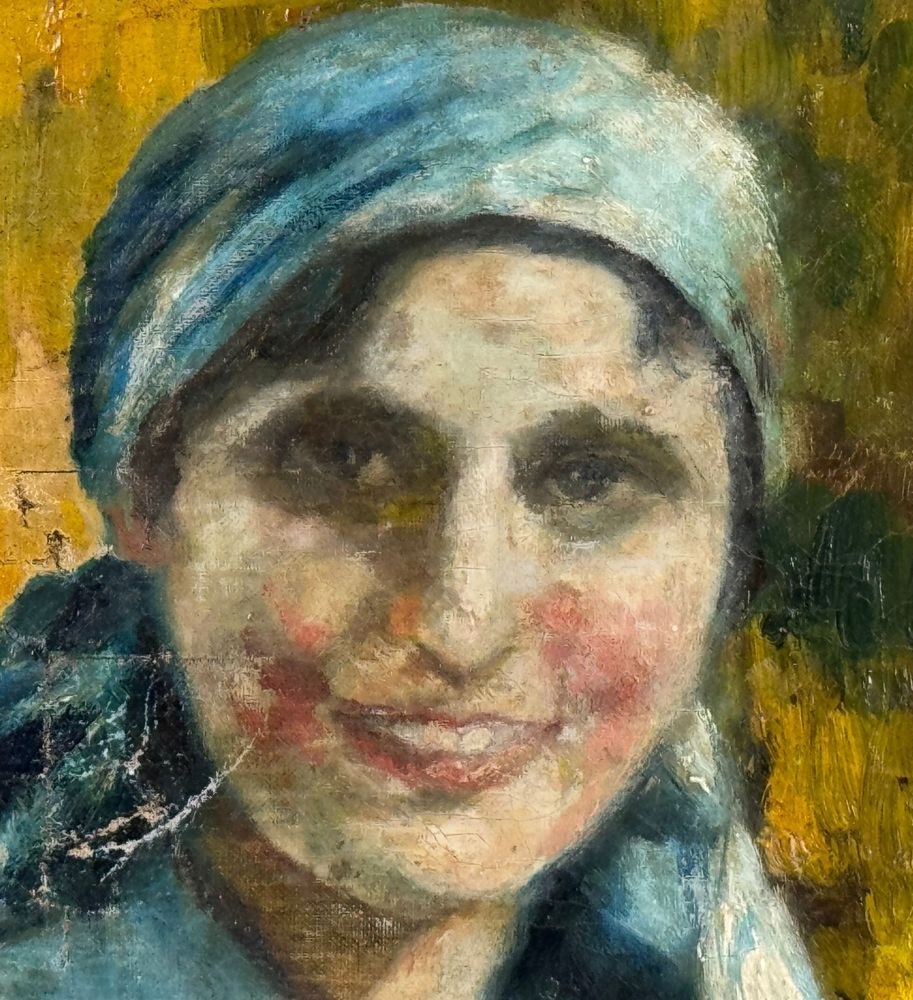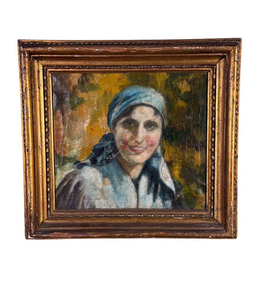 Oil painting on canvas, first half of the 20th century, Italian school, depicting a portrait of a woman with a headpiece. Dimensions including frame: 41x38 cm. Dimensions of the image within the frame: 30x27 cm. Anonymous artist. The work is in good condition with small restoration points.