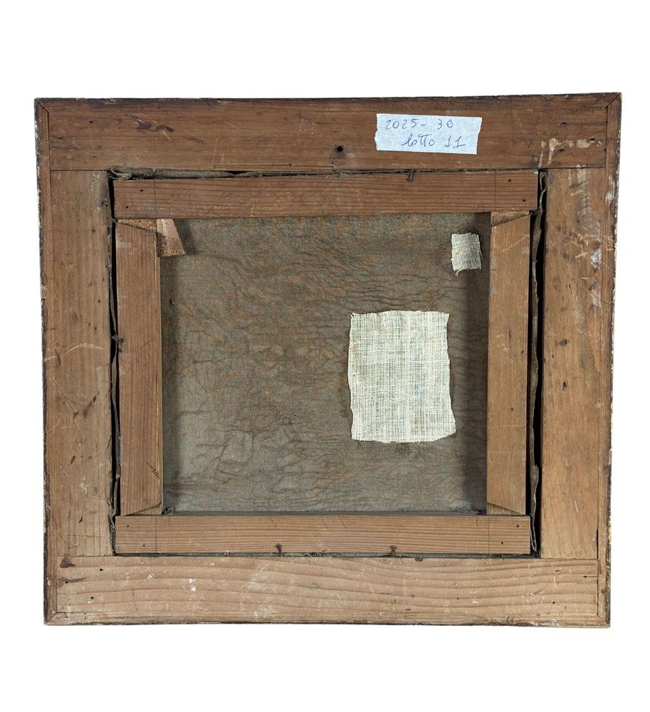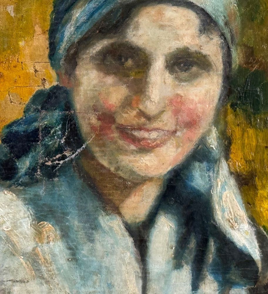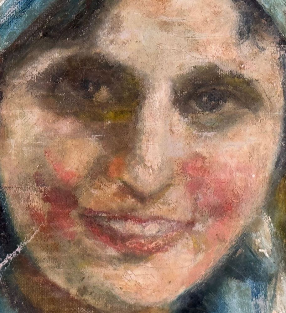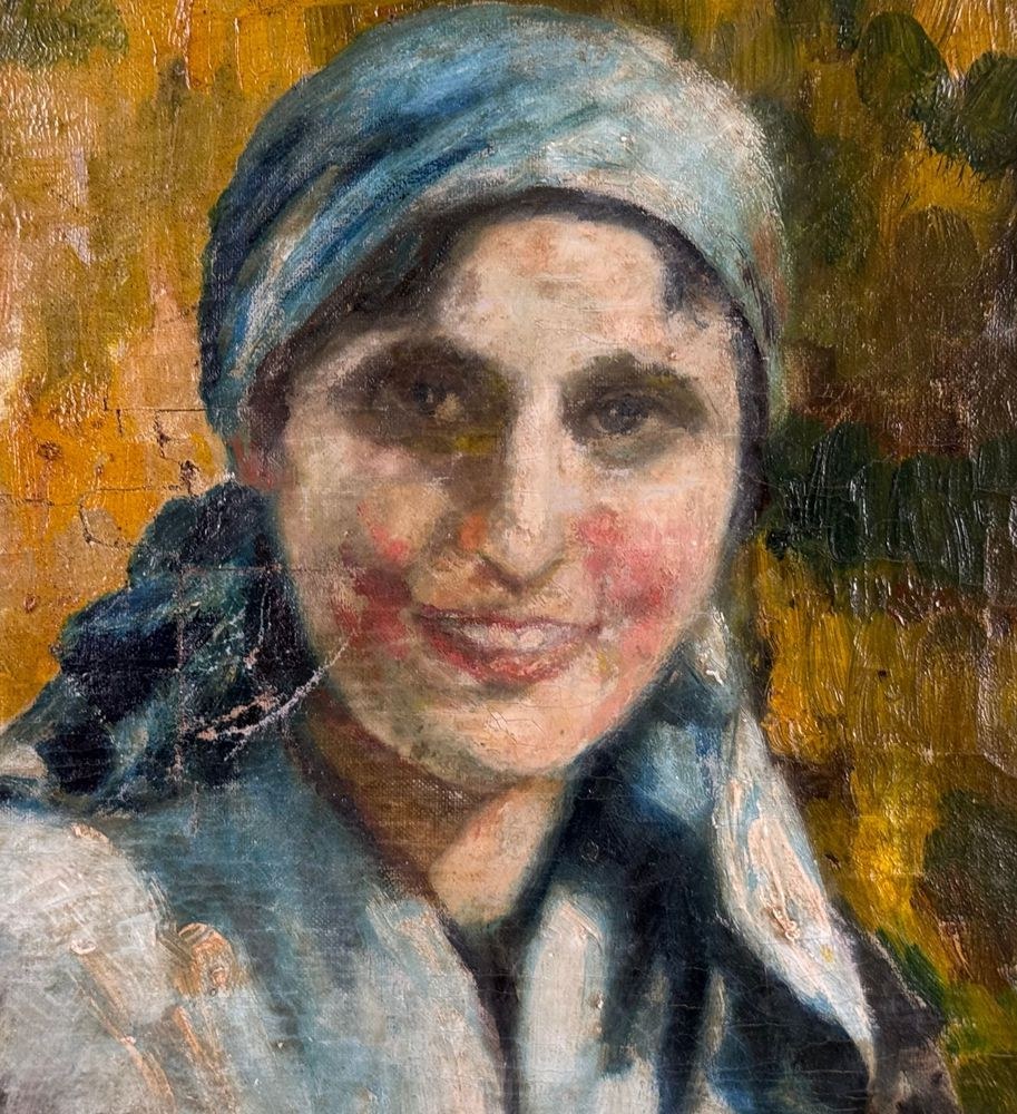 Oil painting on canvas, first half of the 20th century, Italian school, depicting a portrait of a woman with a headpiece. Dimensions including frame: 41x38 cm. Dimensions of the image within the frame: 30x27 cm. Anonymous artist. The work is in good condition with small restoration points.