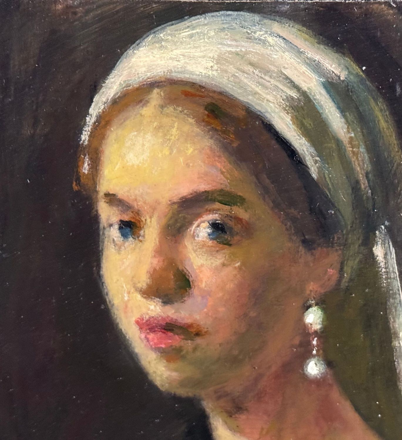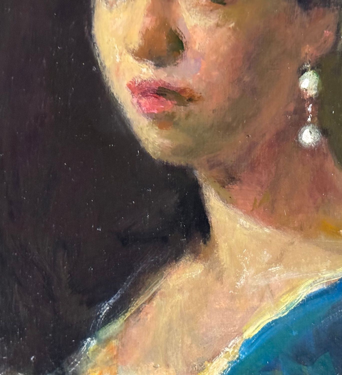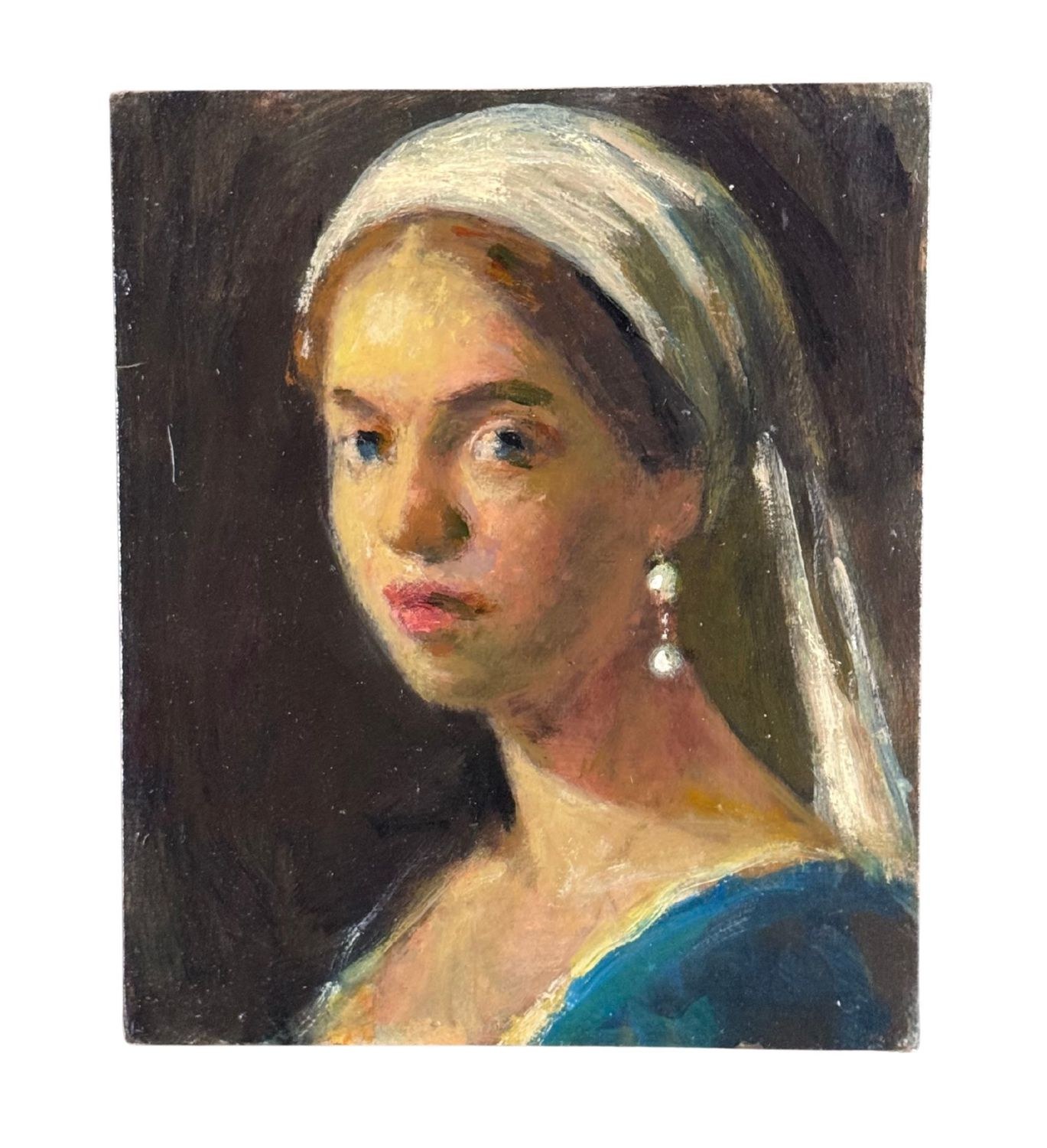 Oil on board painting, 20th-century period, Italian school depicting a Portrait of a Woman with Headgear. Dimensions: 16x19 cm. By an anonymous artist. Work in good condition.