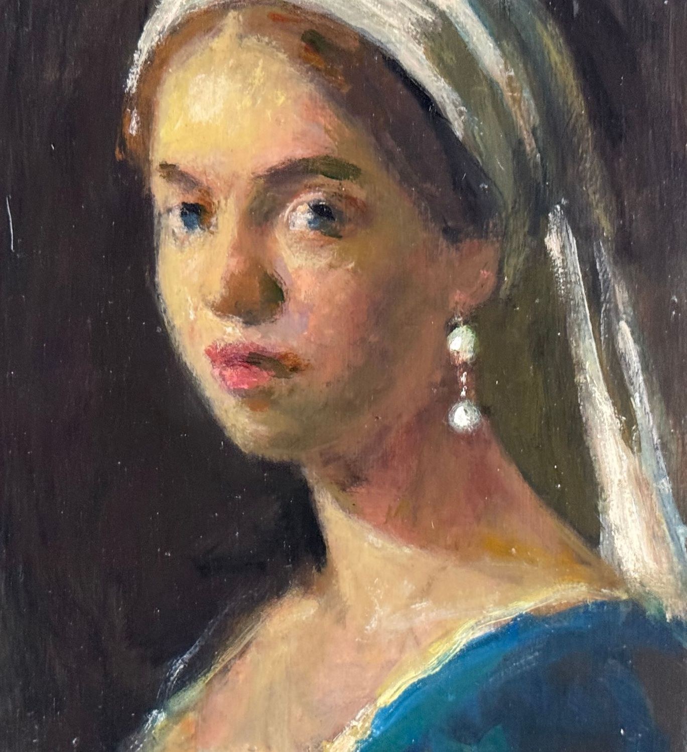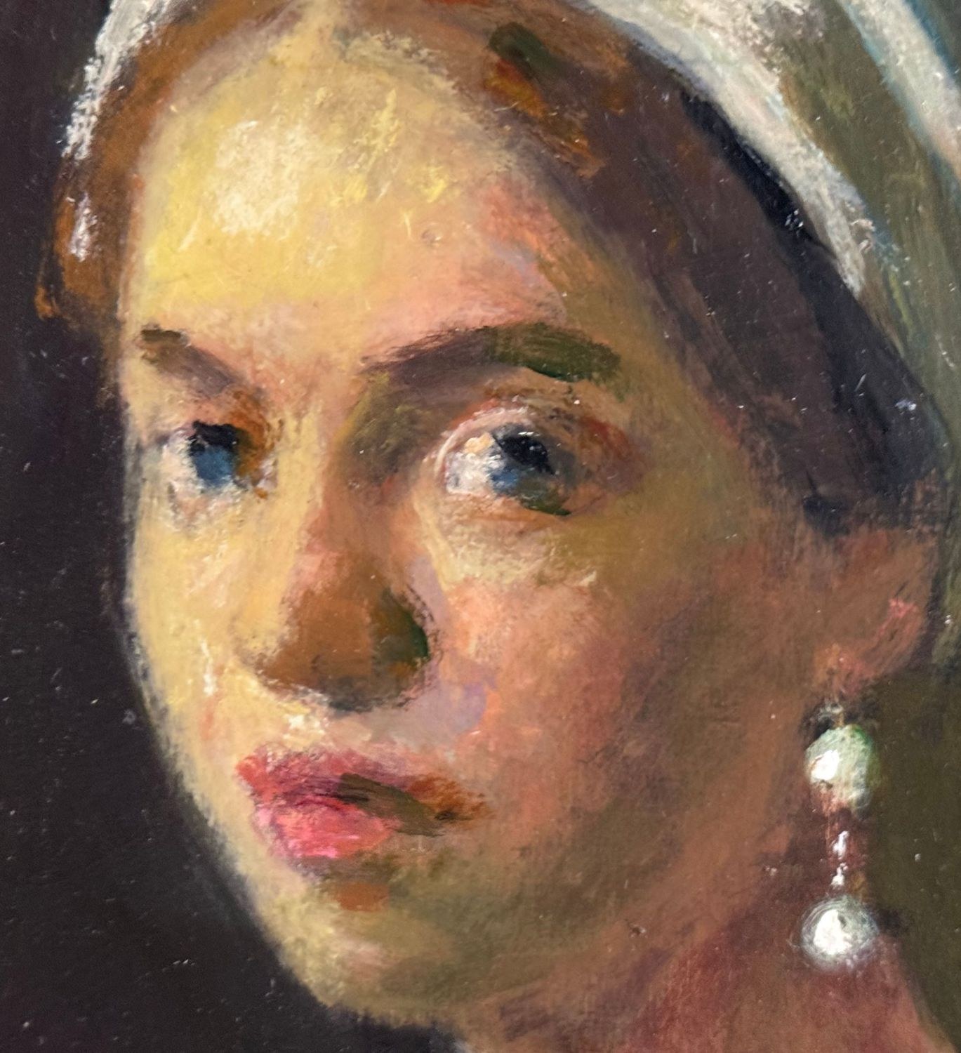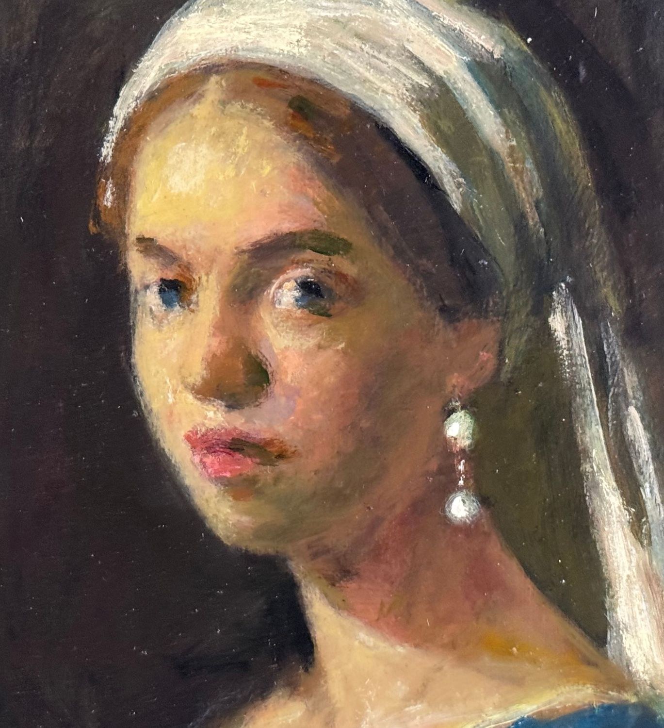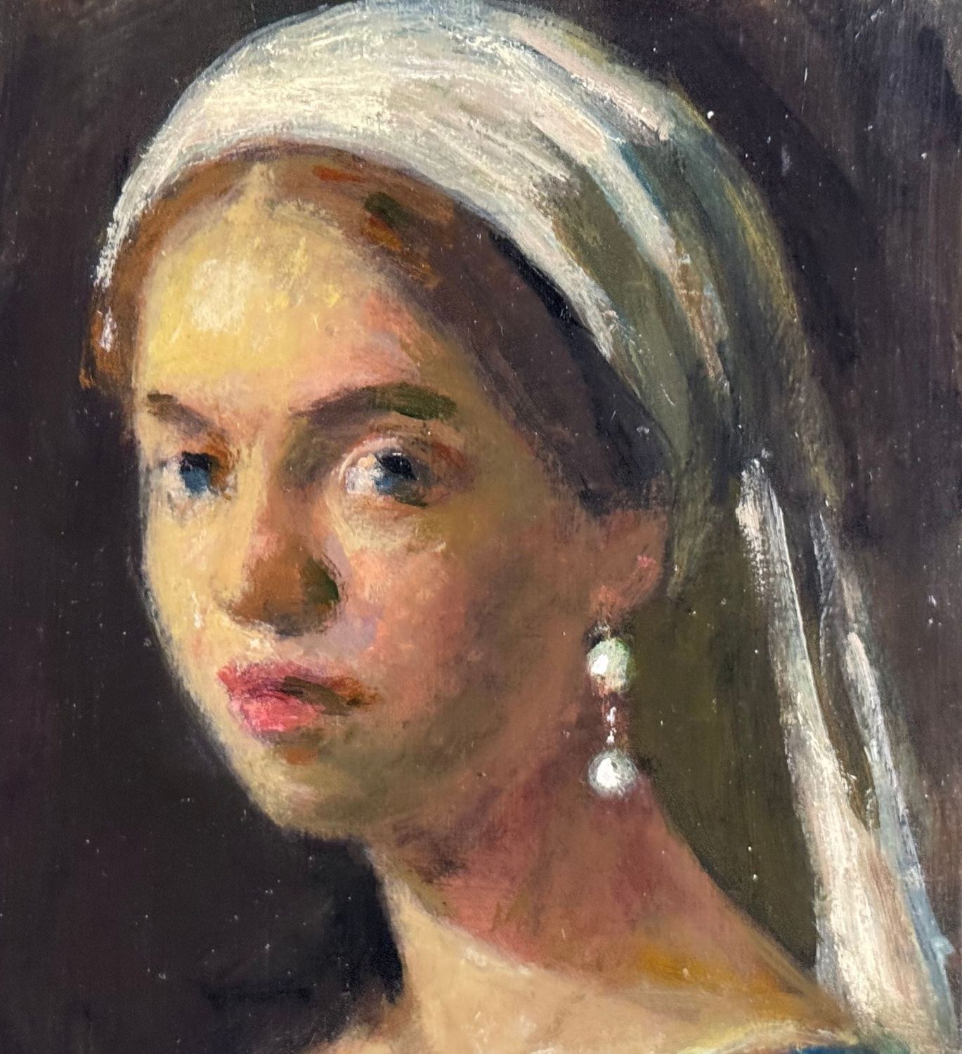 Oil on board painting, 20th-century period, Italian school depicting a Portrait of a Woman with Headgear. Dimensions: 16x19 cm. By an anonymous artist. Work in good condition.