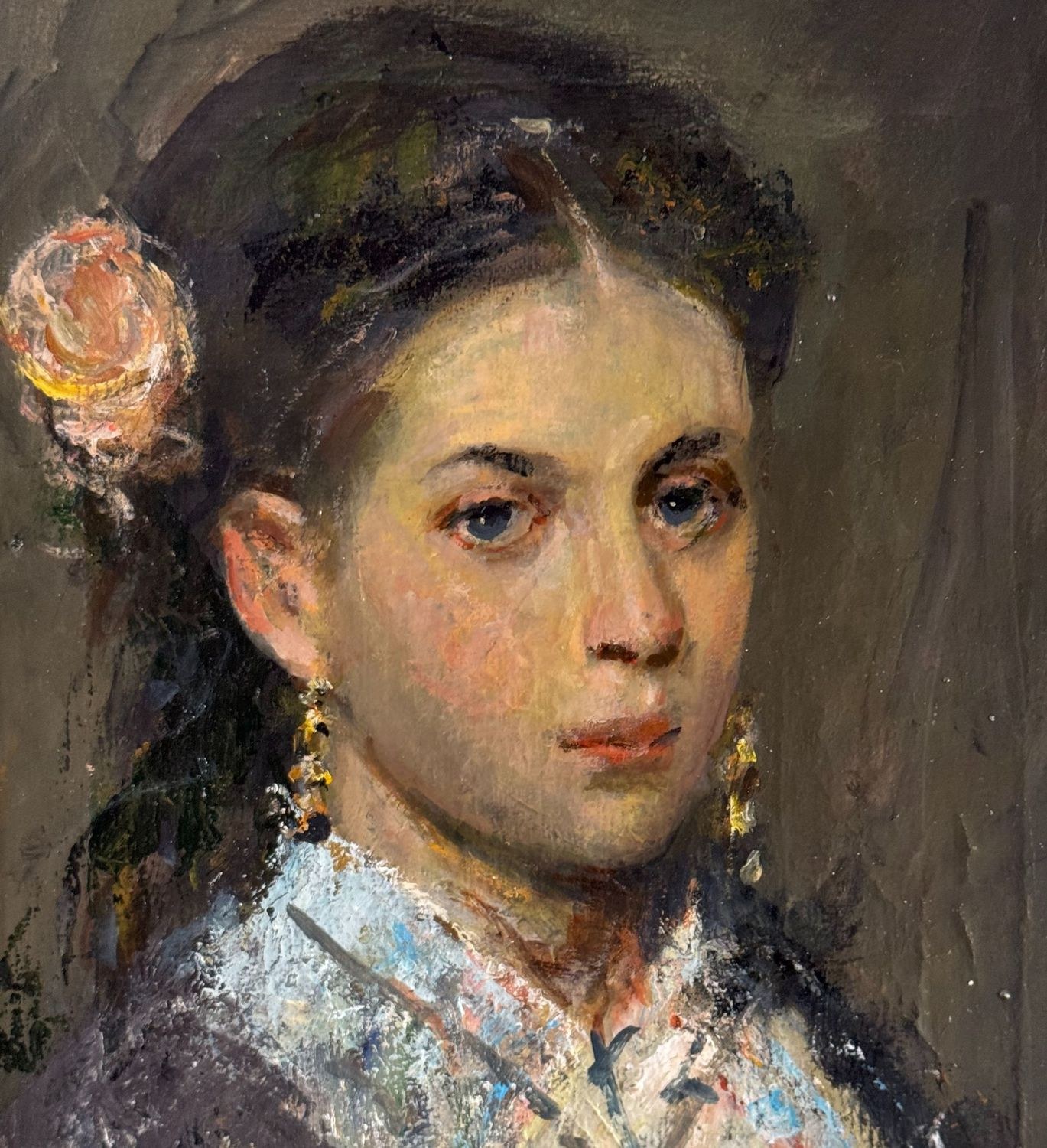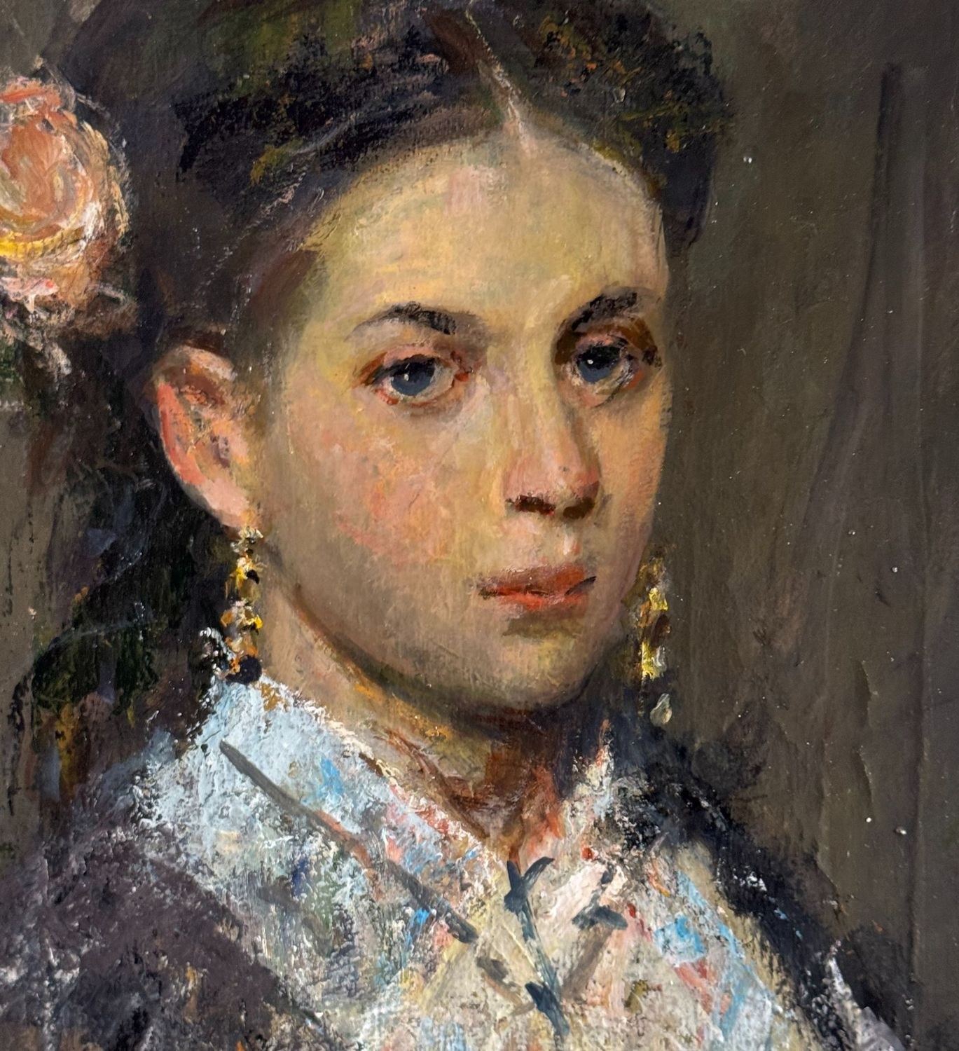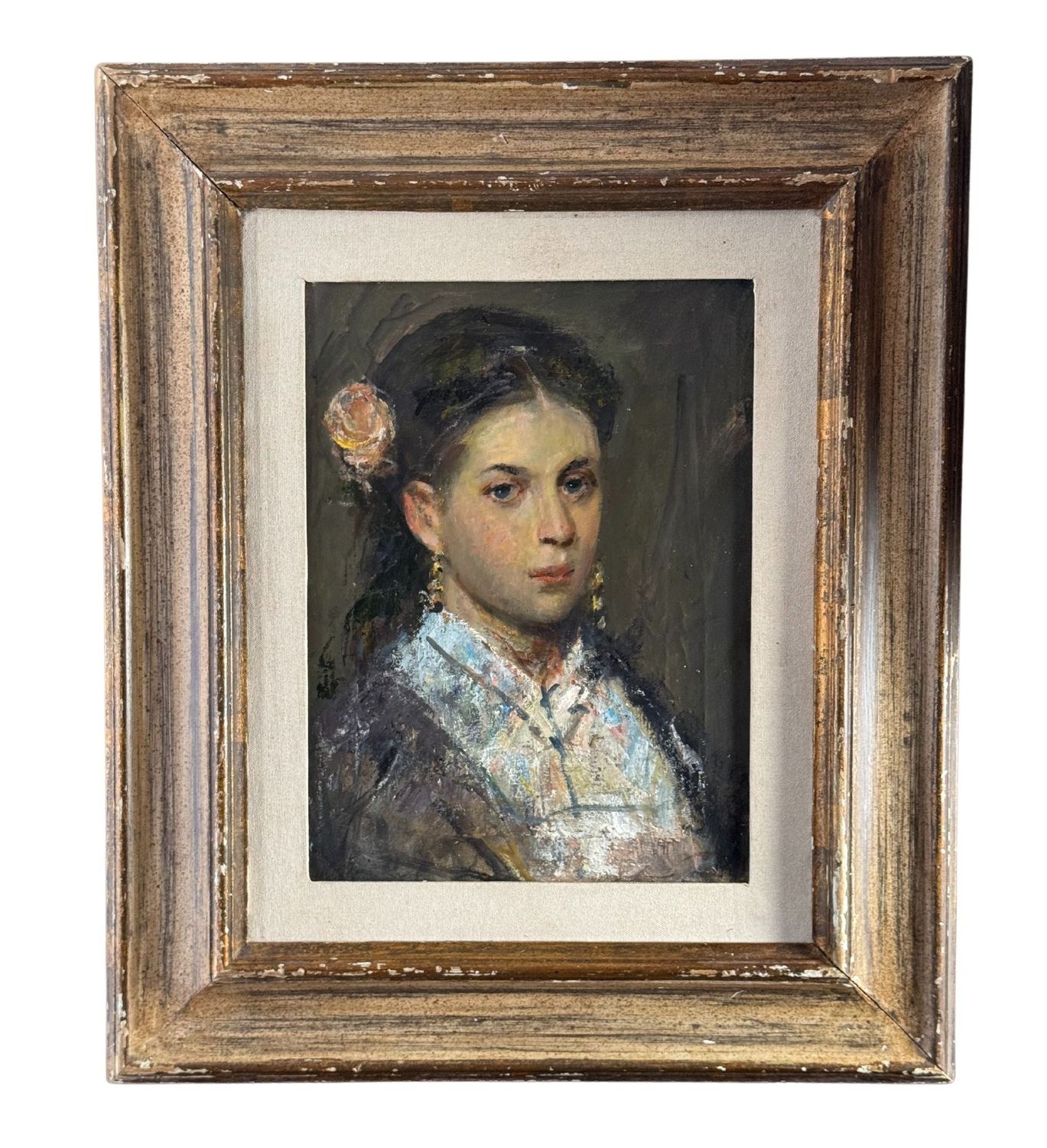 Oil painting on canvas, 20th century, Italian school, depicting a portrait of a young woman. Dimensions including frame: 56x66 cm. Inner frame dimensions: 30x40 cm. Anonymous artist. The artwork is in good condition.