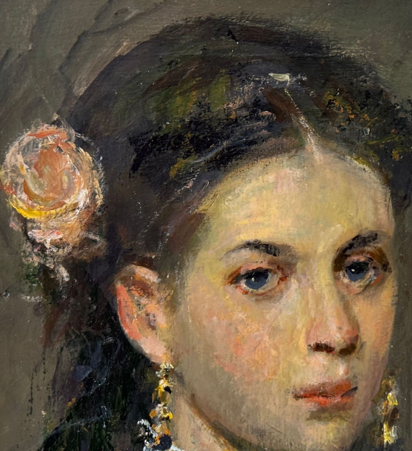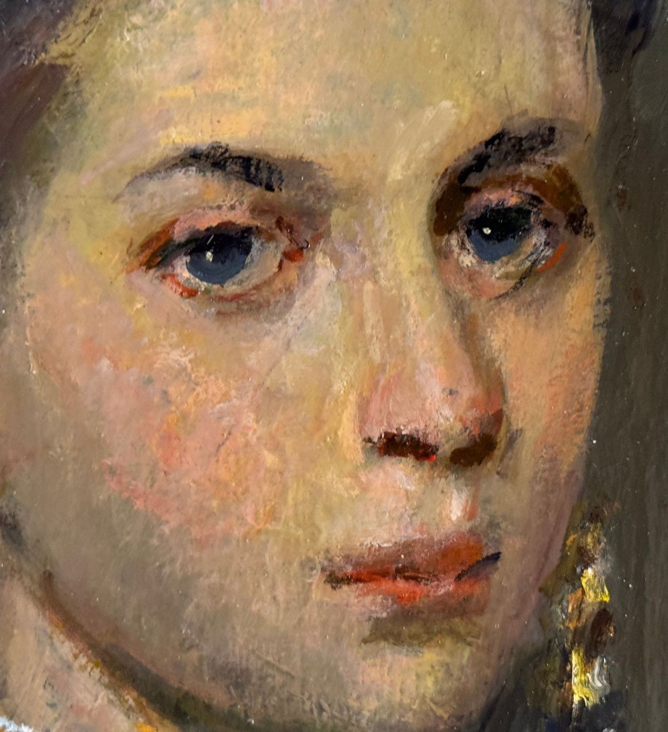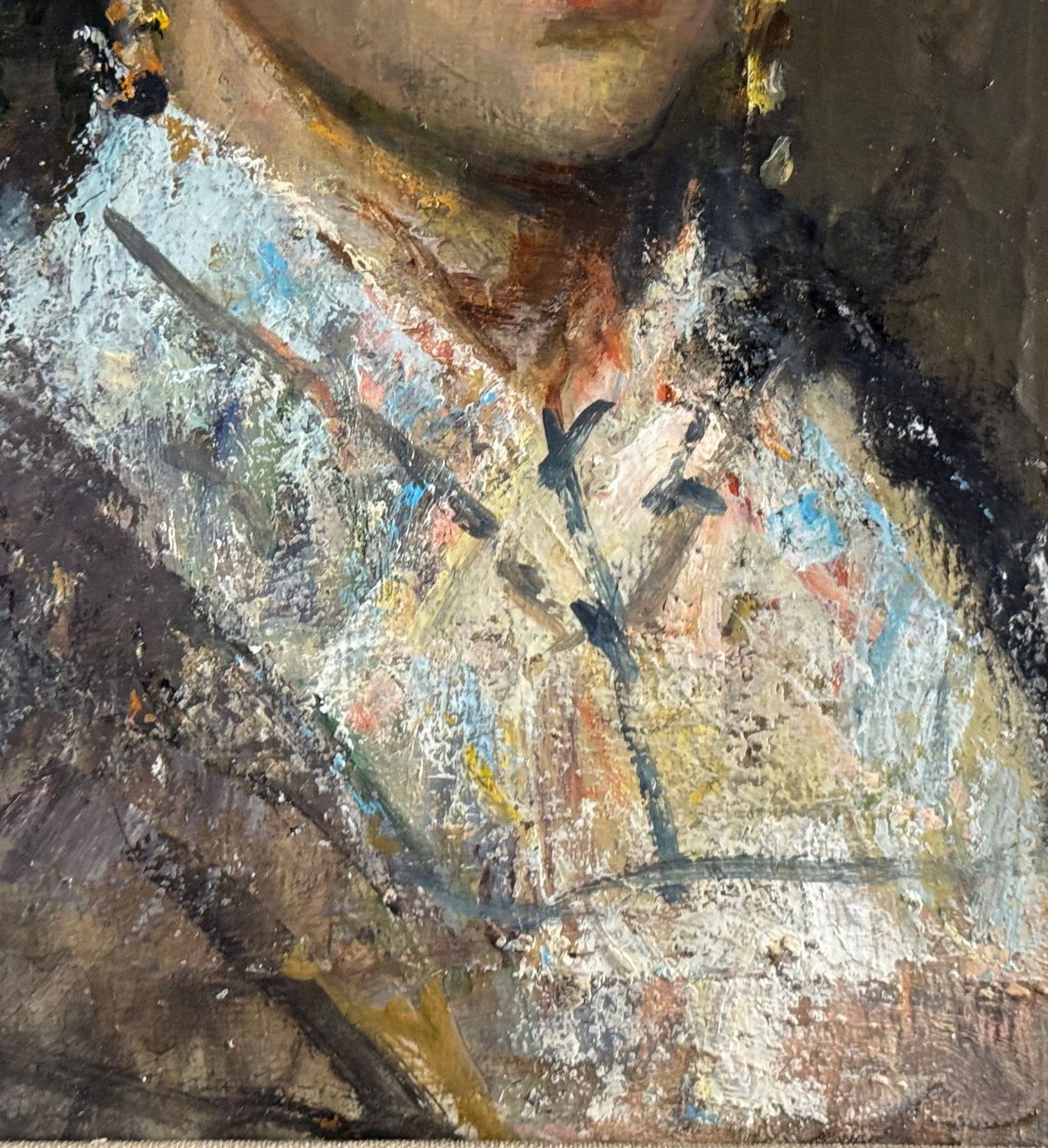Oil painting on canvas, 20th century, Italian school, depicting a portrait of a young woman. Dimensions including frame: 56x66 cm. Inner frame dimensions: 30x40 cm. Anonymous artist. The artwork is in good condition.