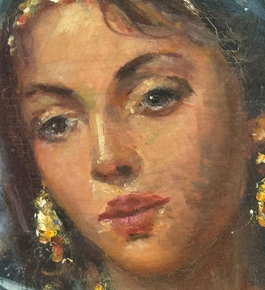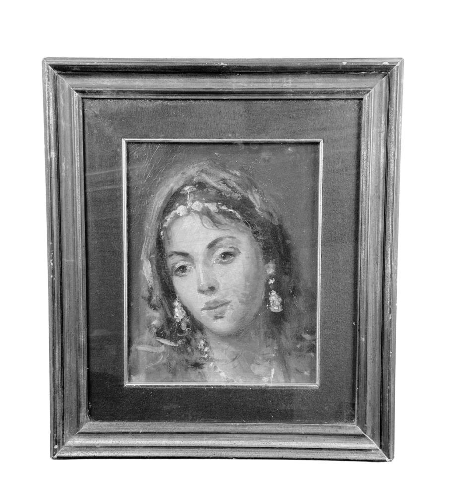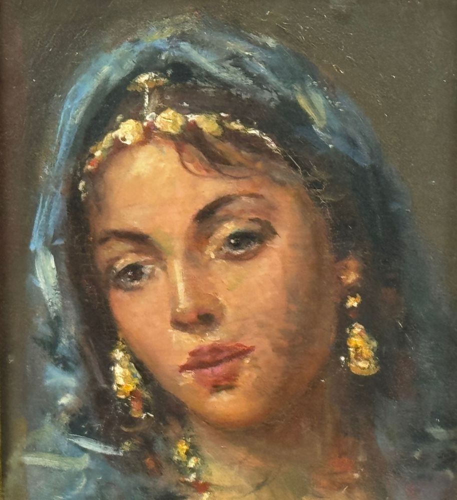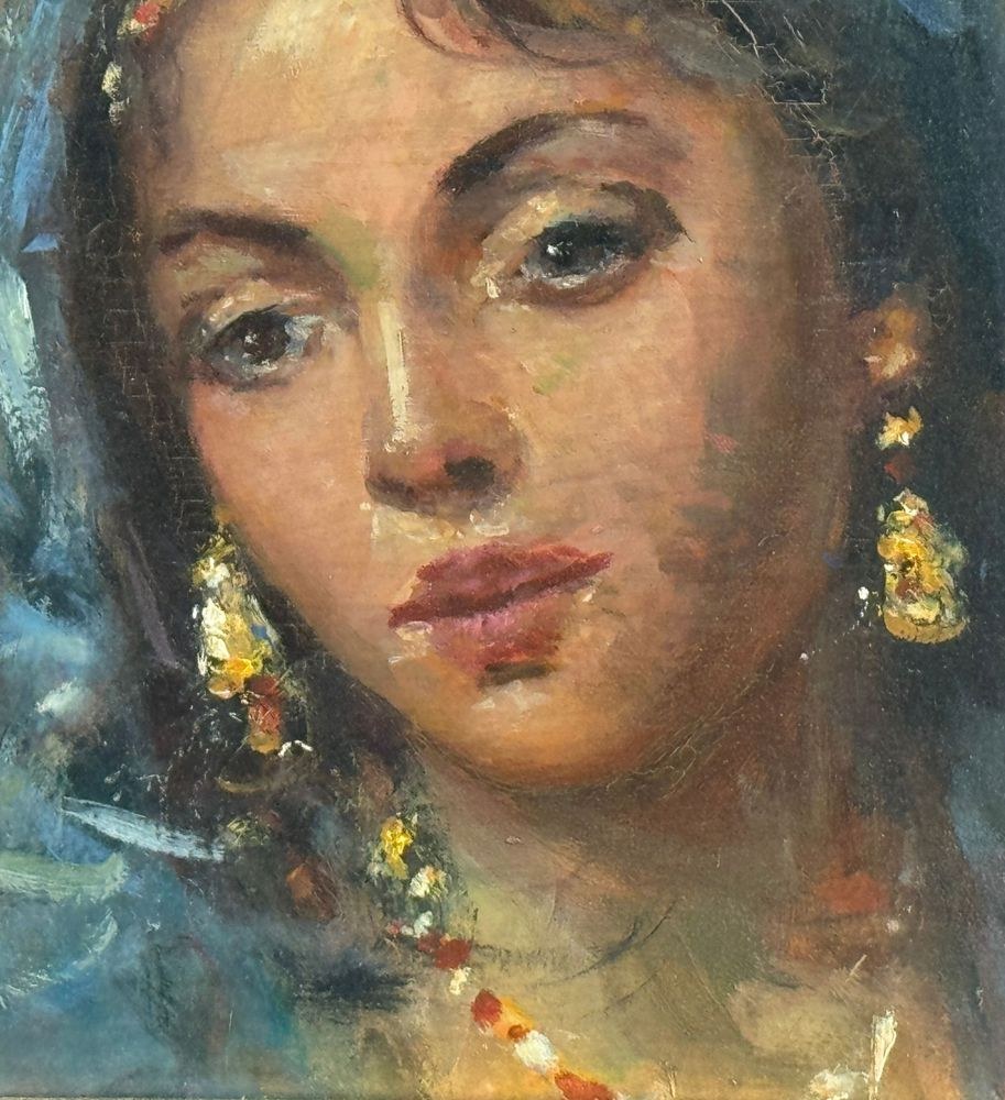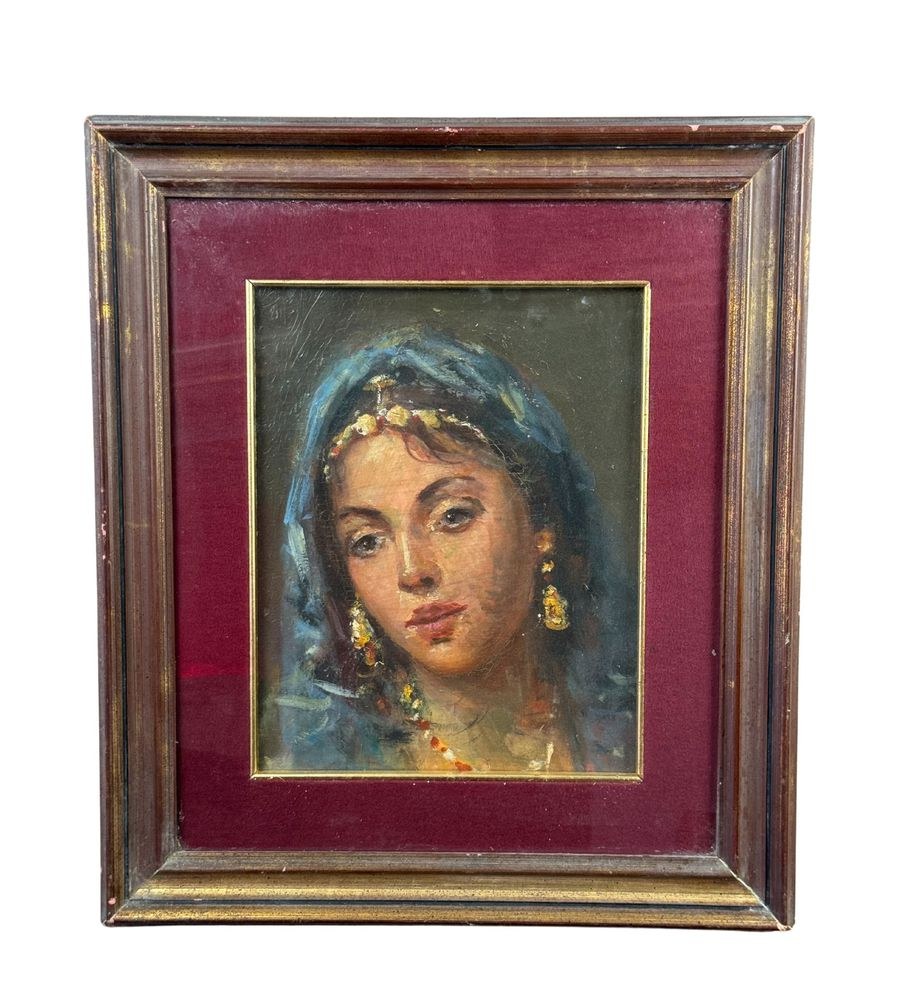 Oil painting on panel, 20th century, Italian school, depicting a portrait of a woman. Dimensions including the frame: 41x47 cm. Inner frame dimensions: 24x30 cm. By an anonymous artist. The artwork is in good condition and of excellent artistic quality.