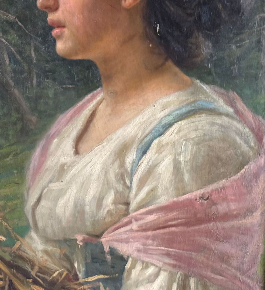 Oil on canvas painting, early 20th-century Italian school, depicting the profile of a young woman. Dimensions including frame: 54x84 cm. Dimensions within the frame: 40x70 cm. By an anonymous artist. The work is in good condition, with minor signs of age as shown in the attached photos.