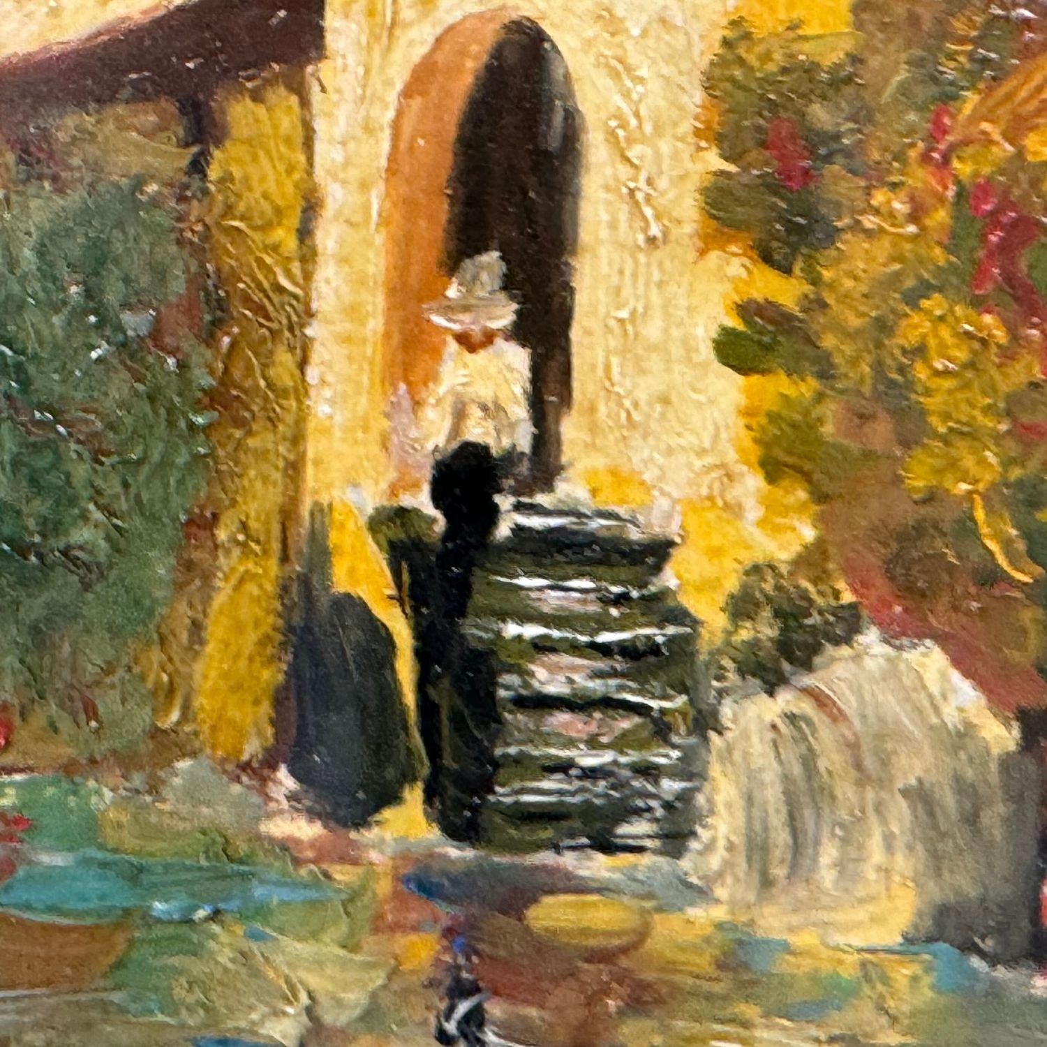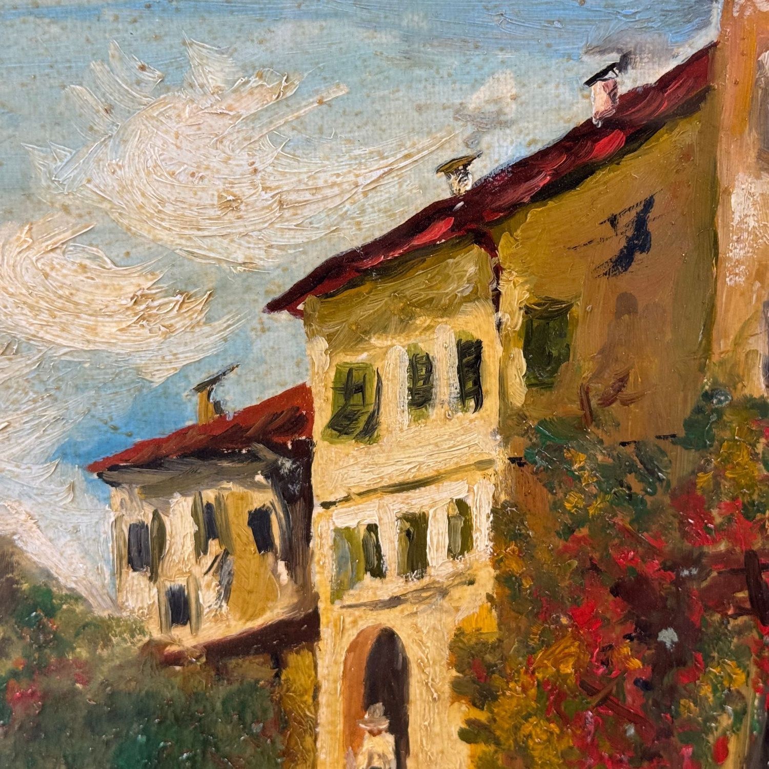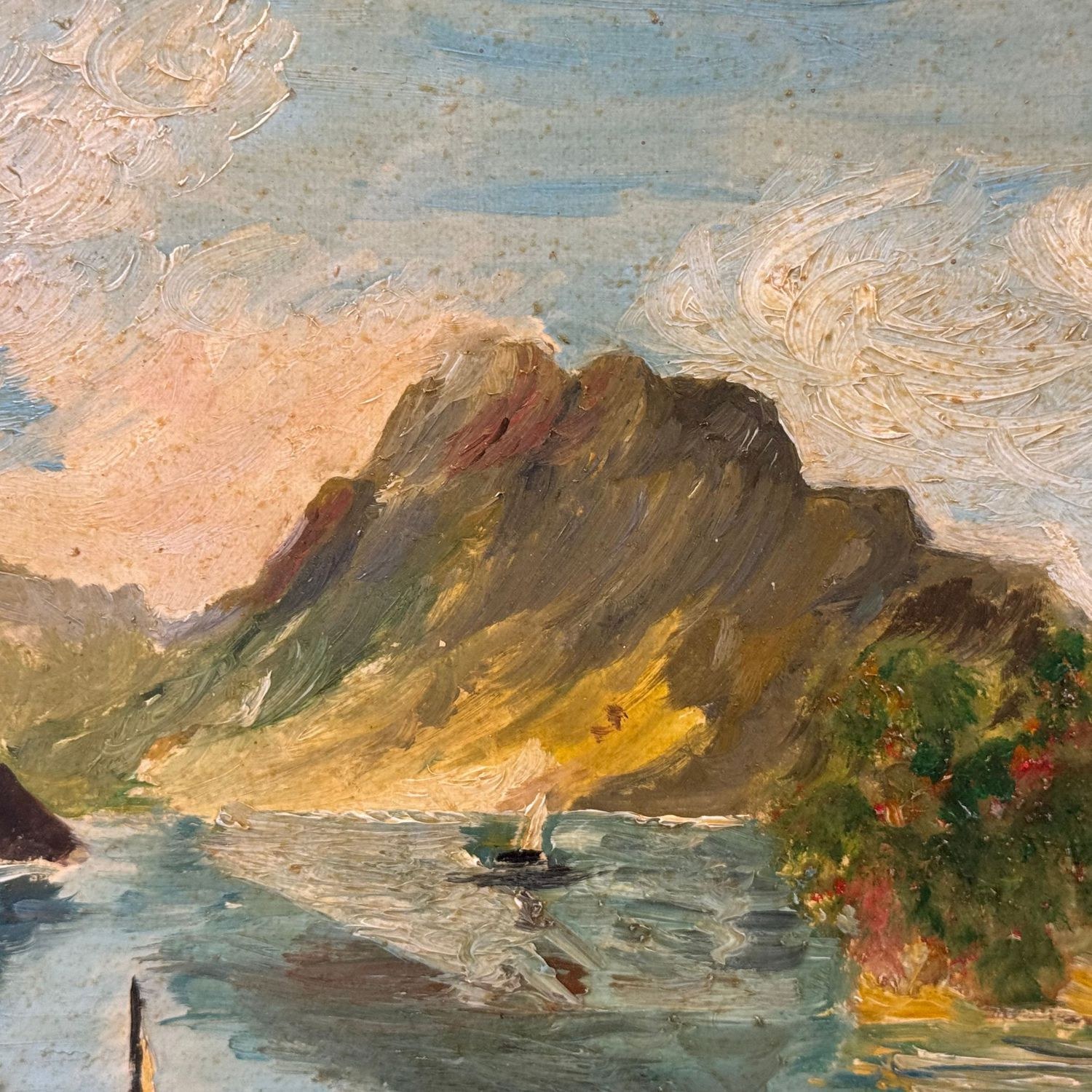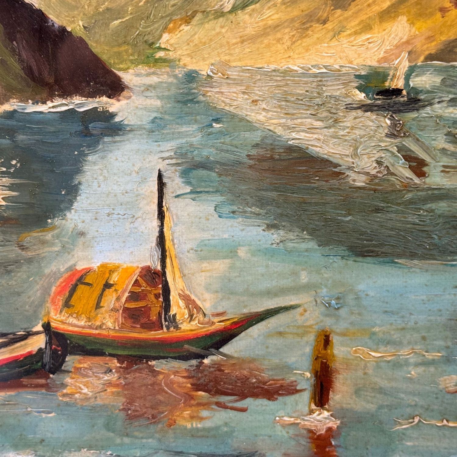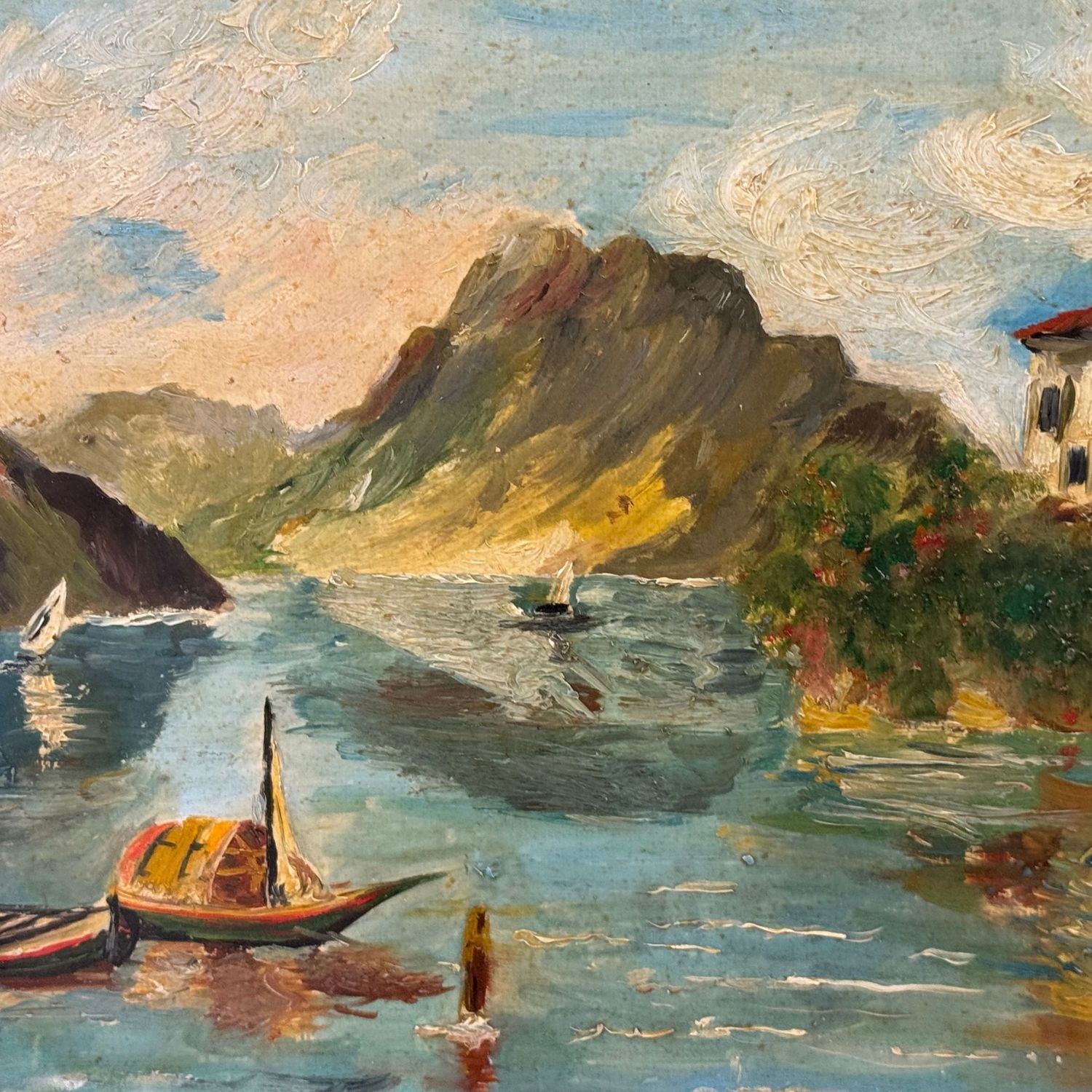 Oil painting on wood panel, 20th-century Italian school, depicting a River Landscape (Unspecified Location).