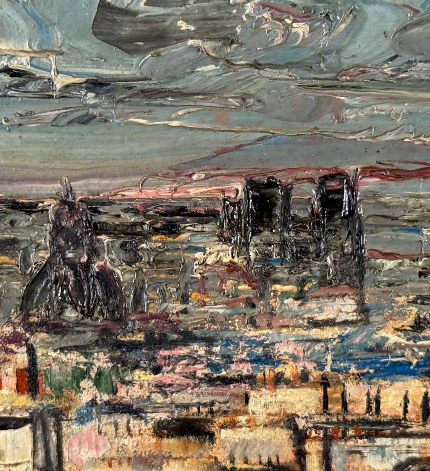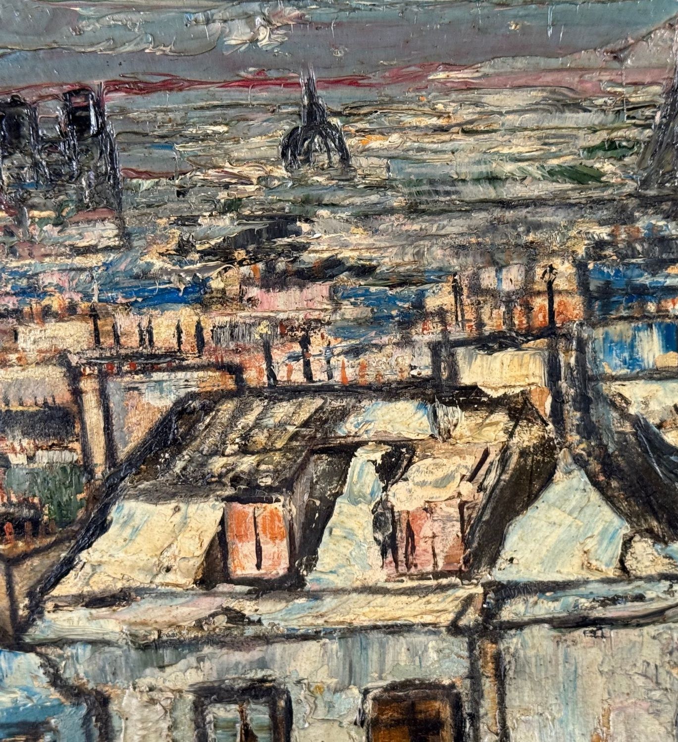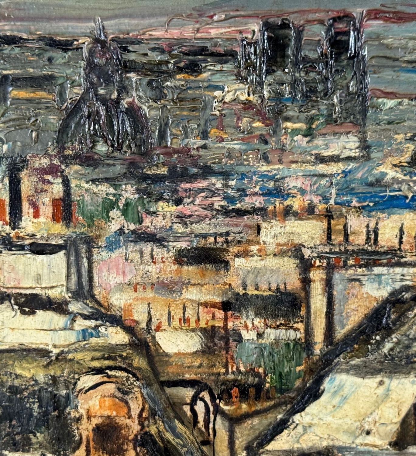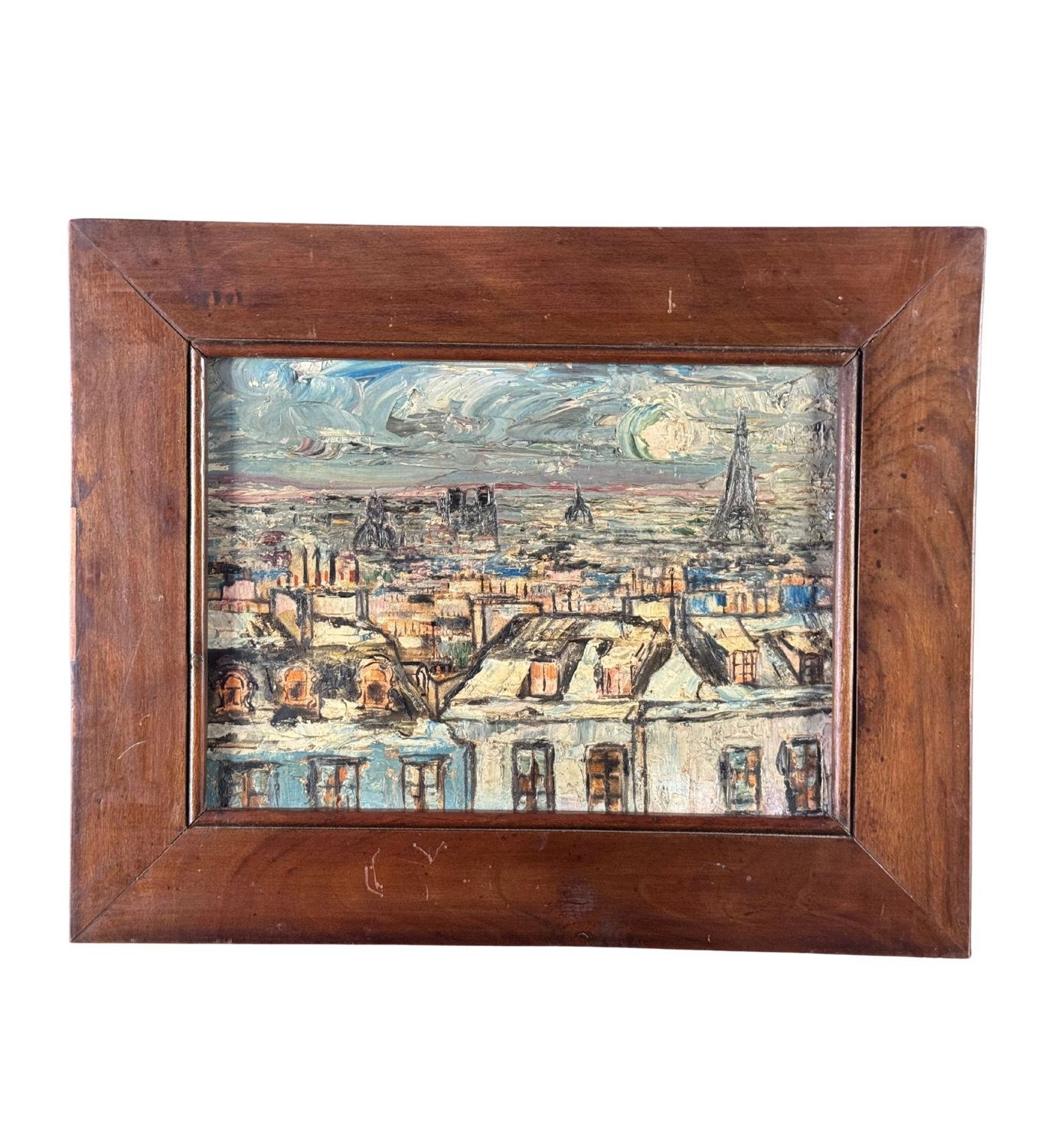 Oil on panel painting, 20th century, European school, depicting rooftops. Dimensions including frame: 45 x 36 cm. Inner frame dimensions: 32 x 23 cm. By an anonymous artist. The artwork is in good condition.