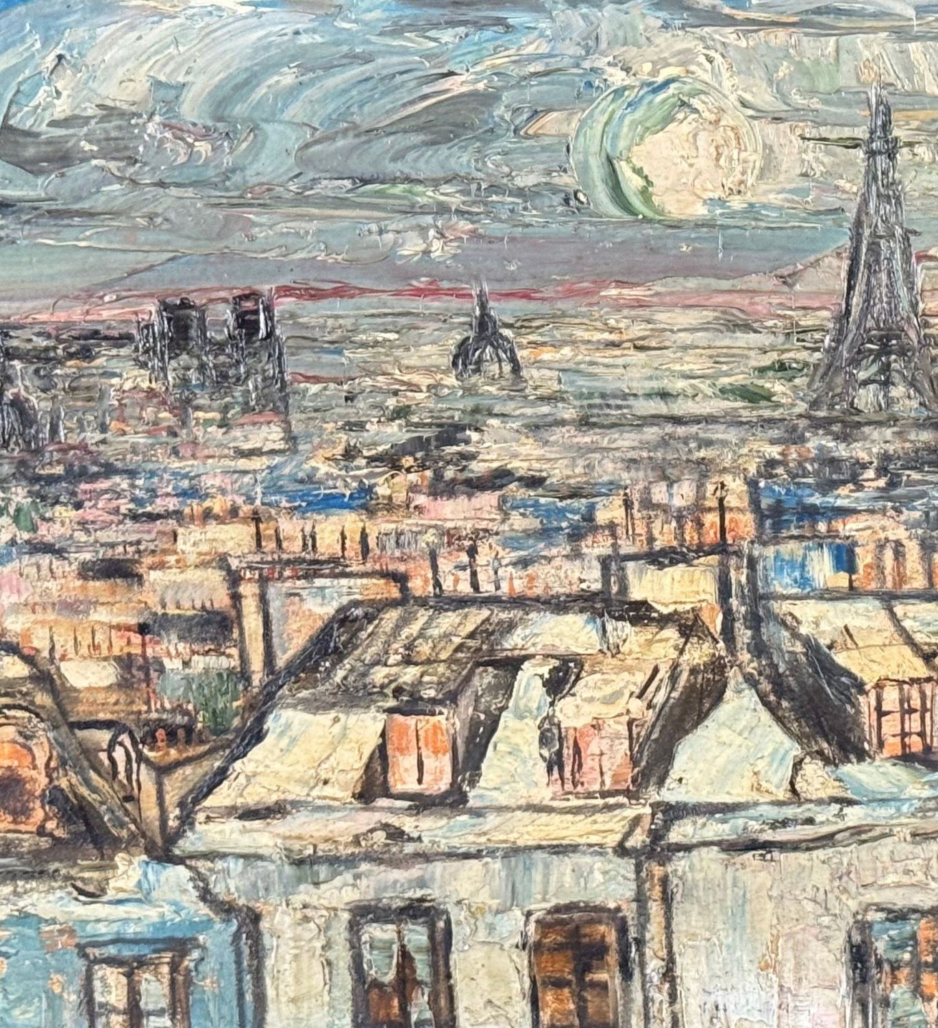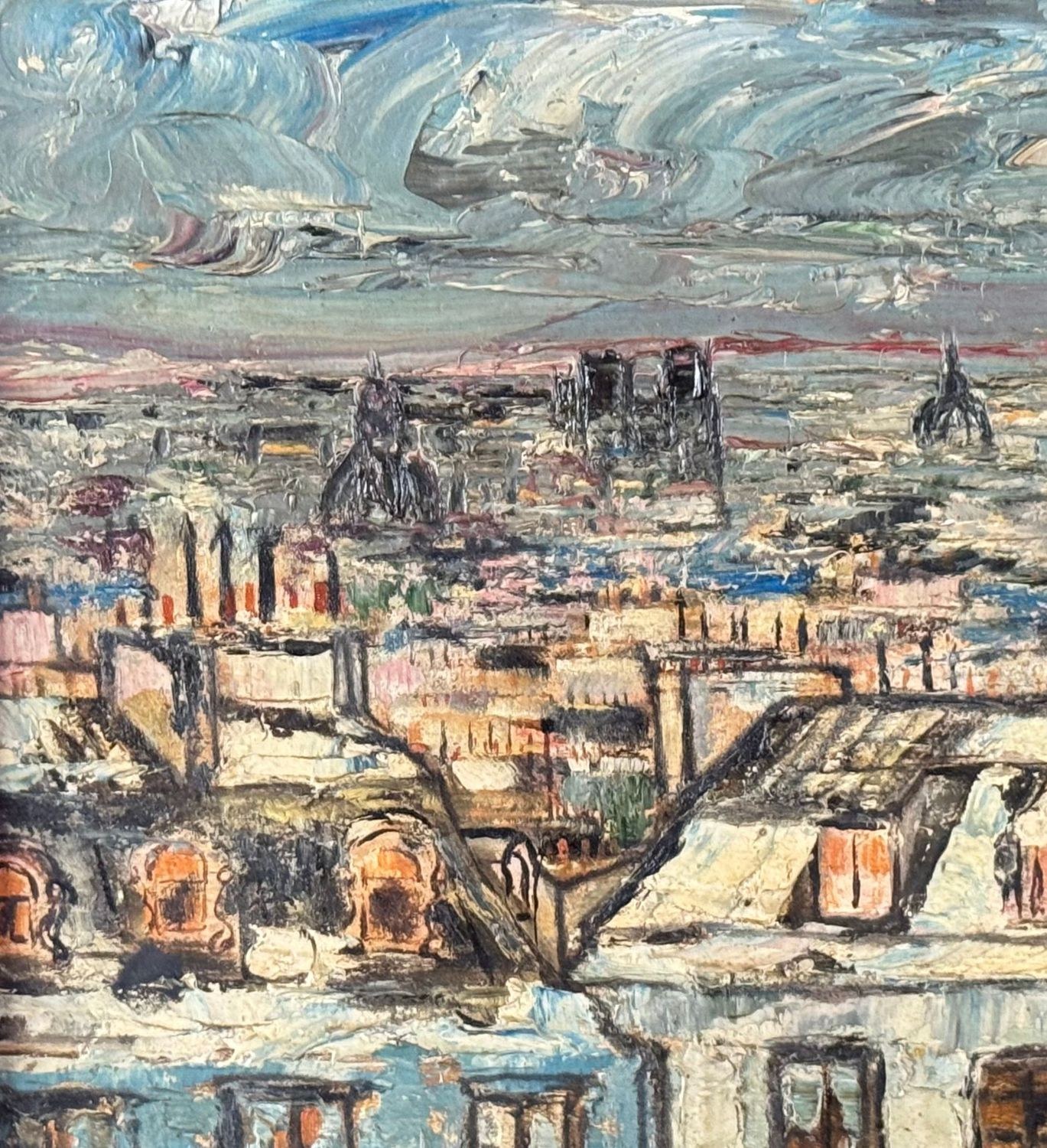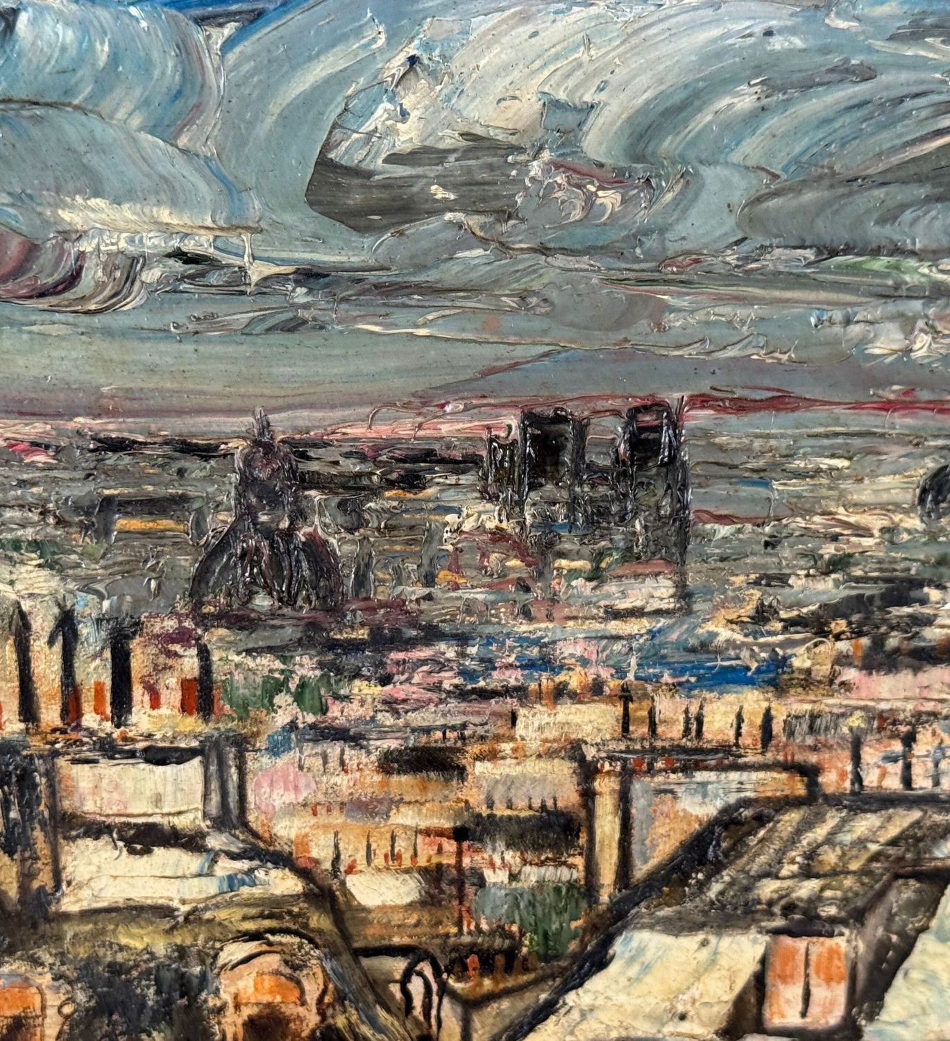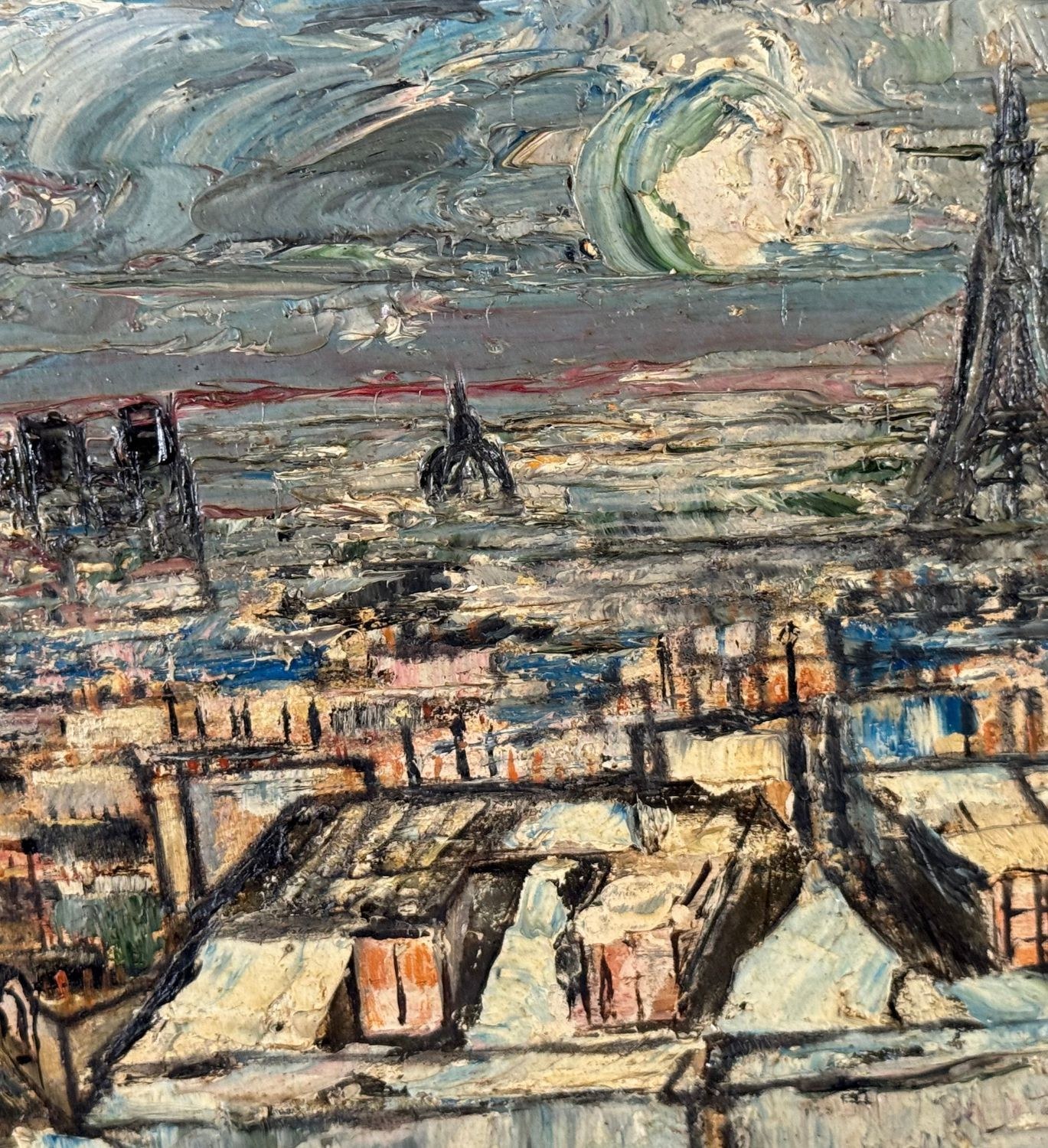 Oil on panel painting, 20th century, European school, depicting rooftops. Dimensions including frame: 45 x 36 cm. Inner frame dimensions: 32 x 23 cm. By an anonymous artist. The artwork is in good condition.