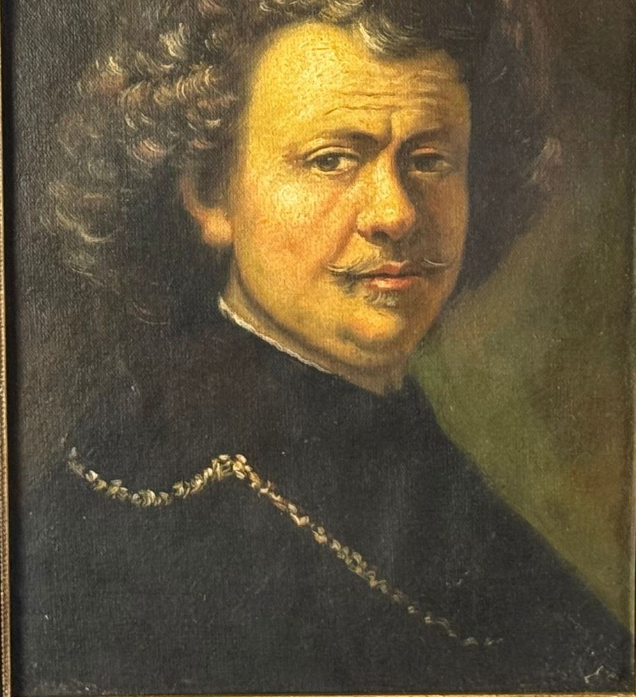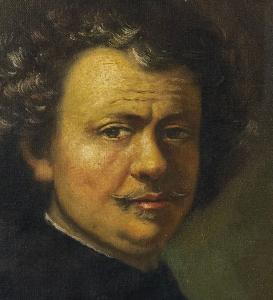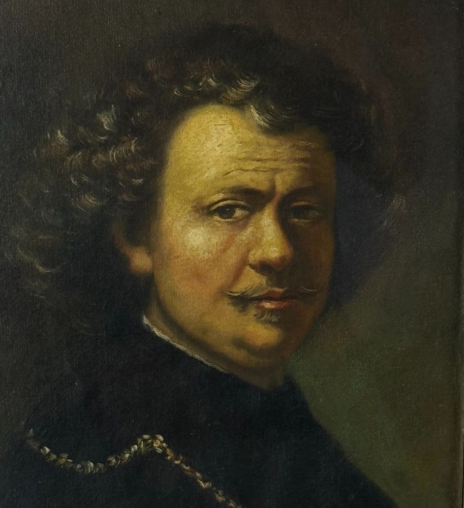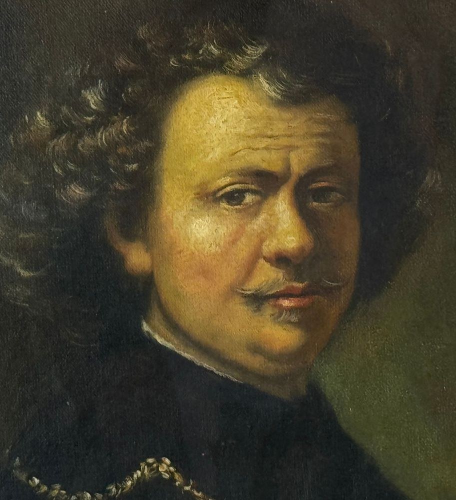 Oil on canvas painting, 19th-century Italian school, depicting a Self-portrait of Rembrandt. Dimensions including frame: 26x34 cm. Dimensions inside frame: 23x31 cm. By an anonymous artist. The work is in good condition and of excellent artistic quality.