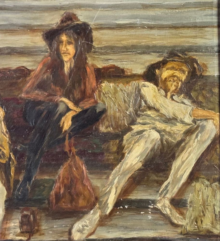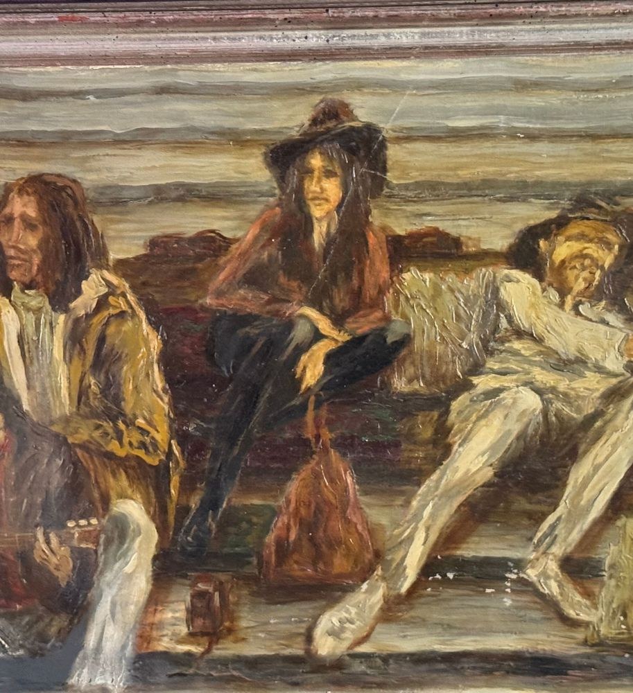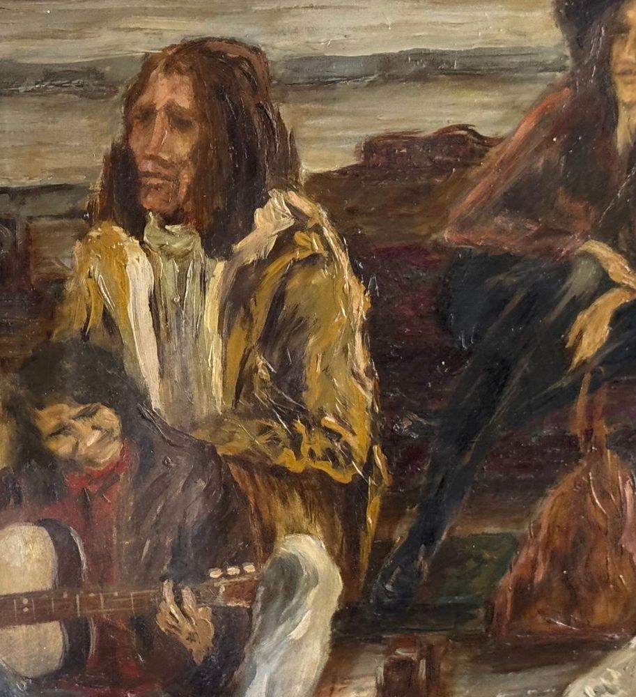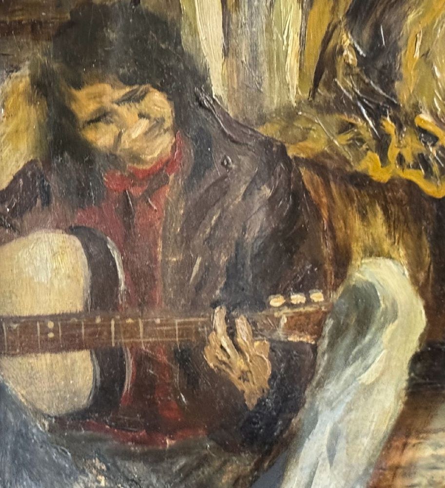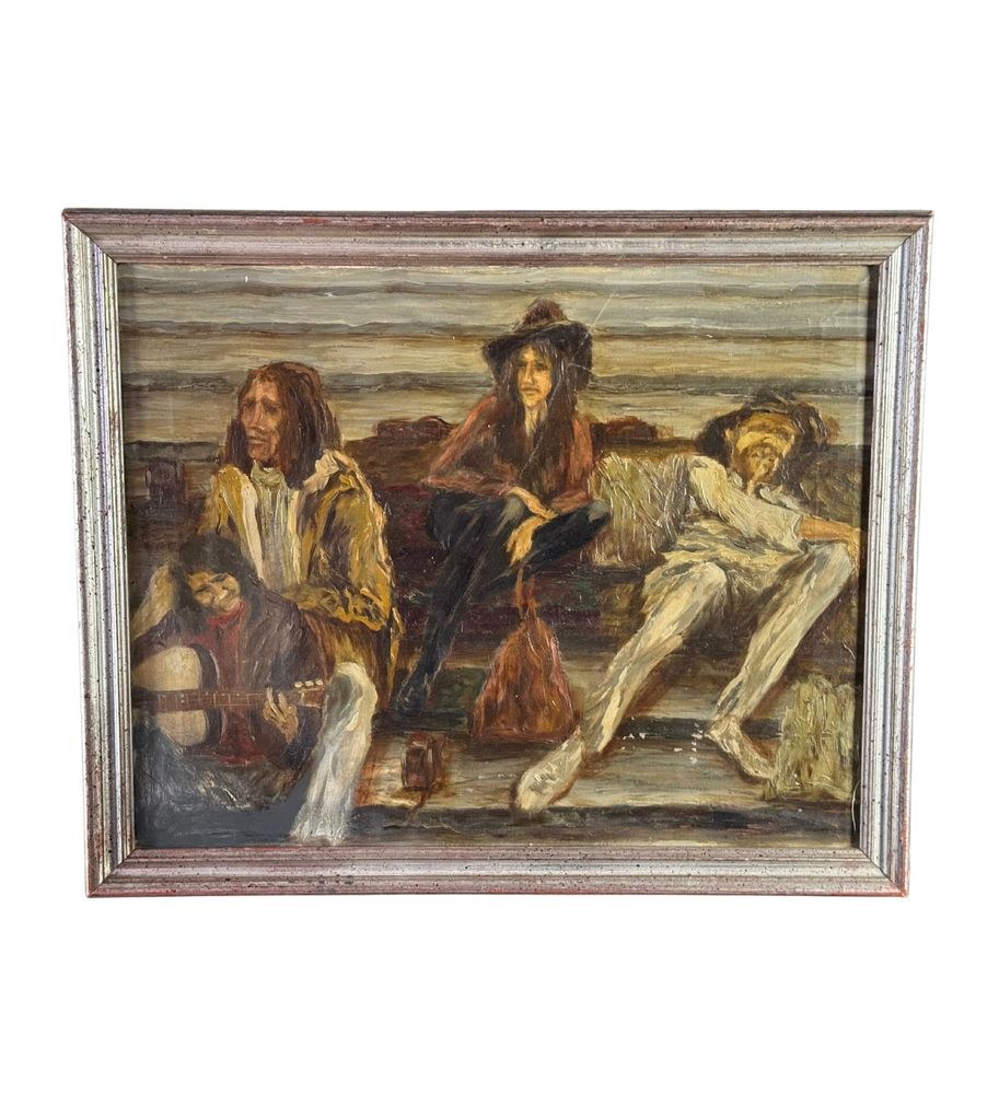 Oil painting on canvas, 20th century, depicting street performers. Dimensions including frame: 56x46 cm. Dimensions inside the frame: 50x40 cm. By an anonymous artist. The artwork is in good condition with minor signs of wear, as shown in the attached photos.