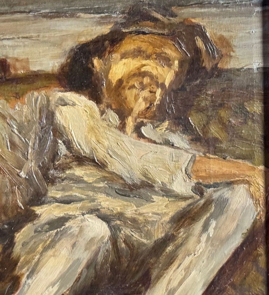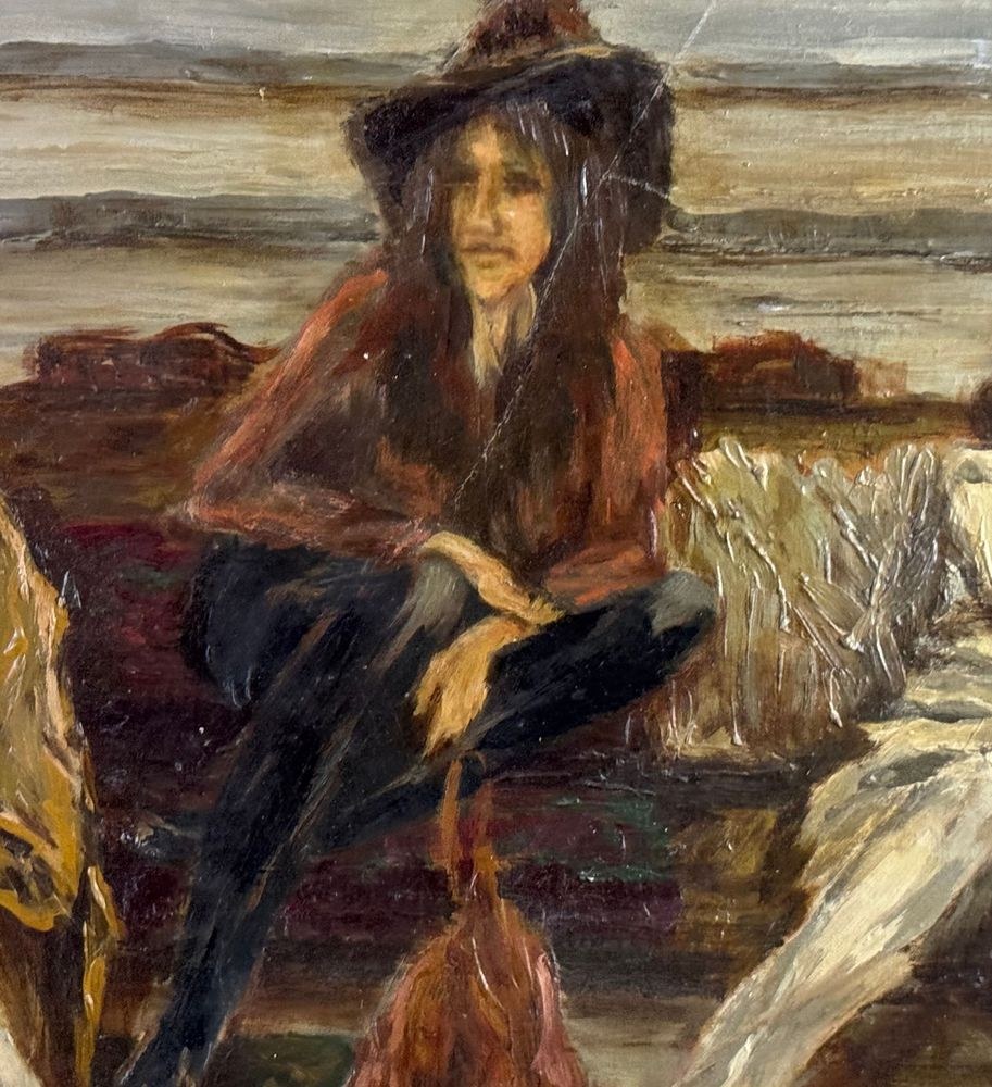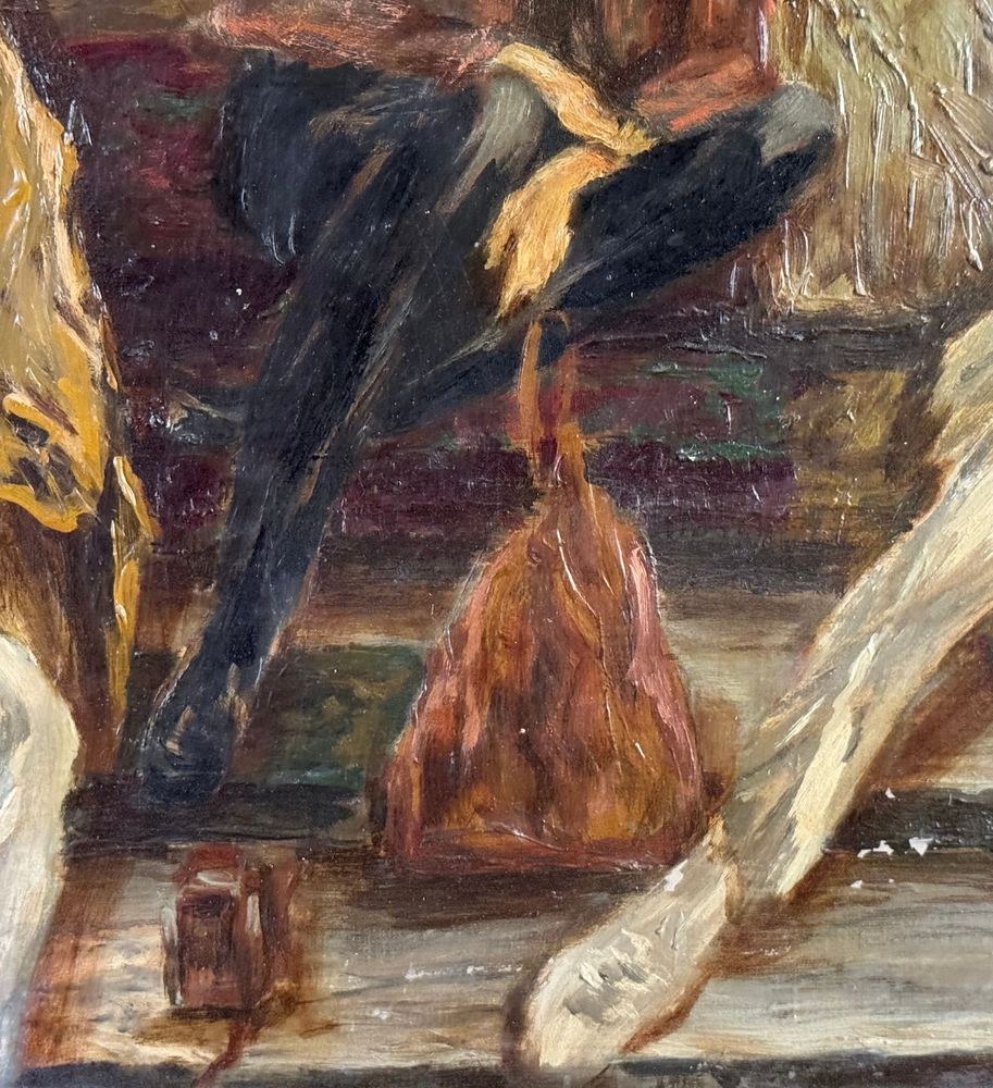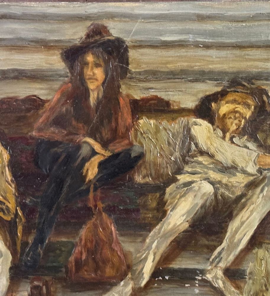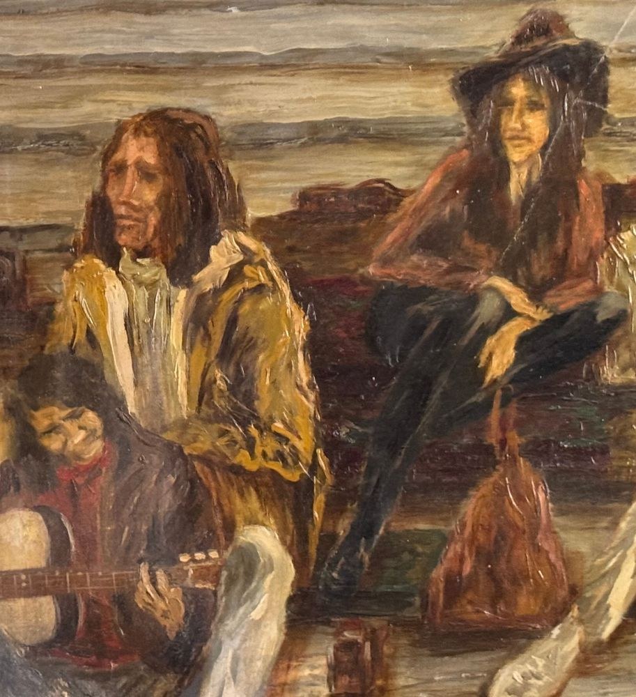 Oil painting on canvas, 20th century, depicting street performers. Dimensions including frame: 56x46 cm. Dimensions inside the frame: 50x40 cm. By an anonymous artist. The artwork is in good condition with minor signs of wear, as shown in the attached photos.
