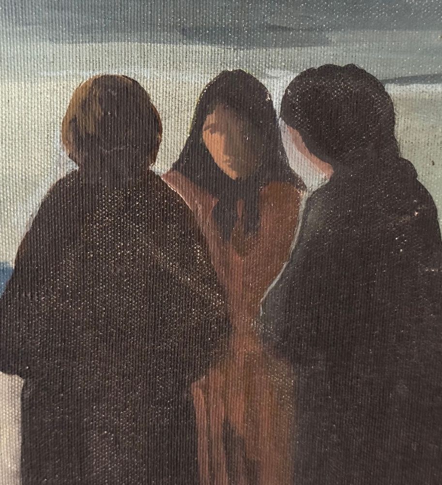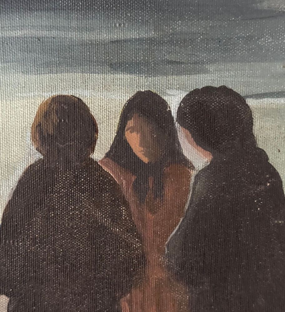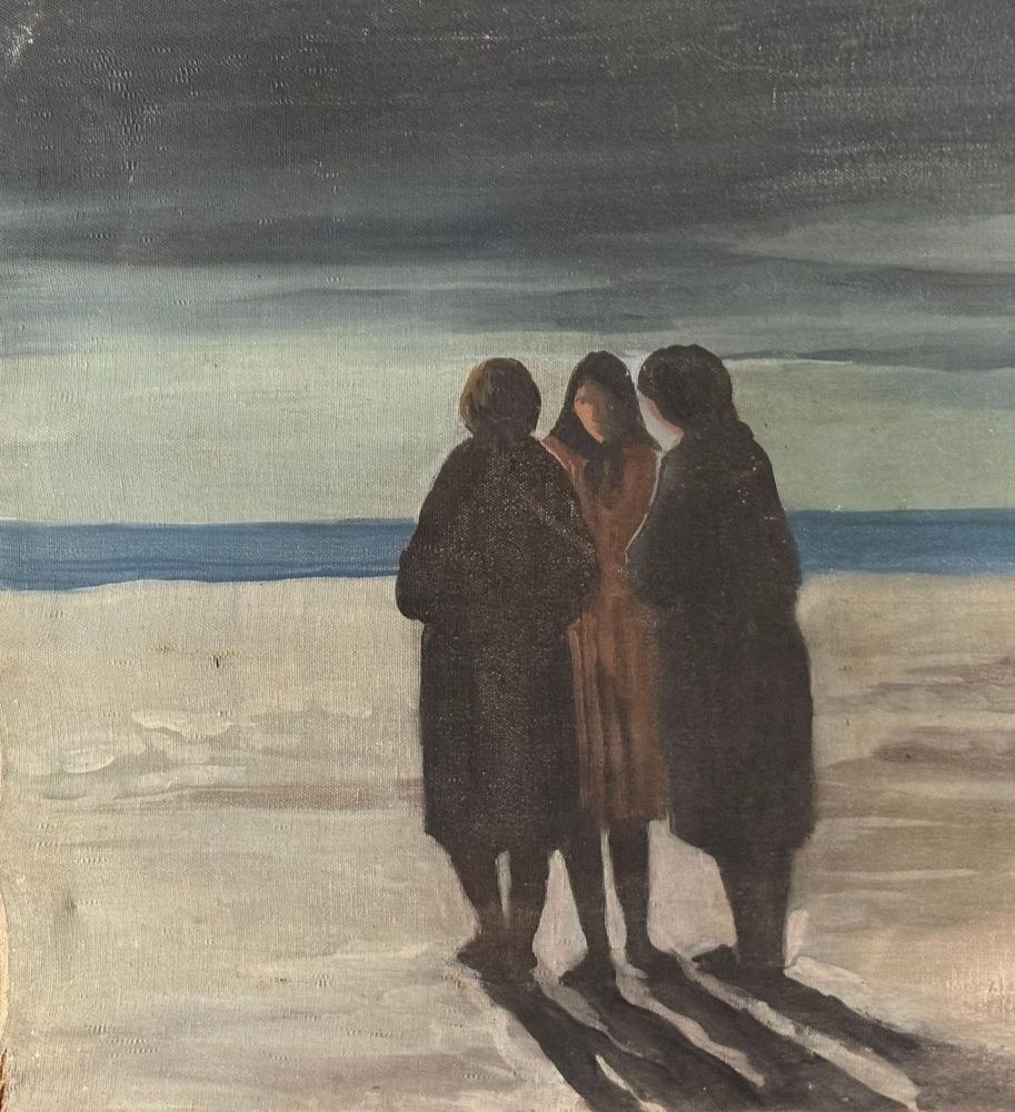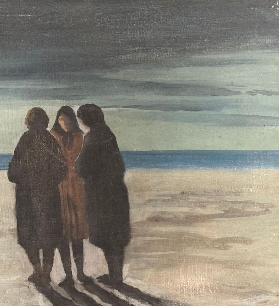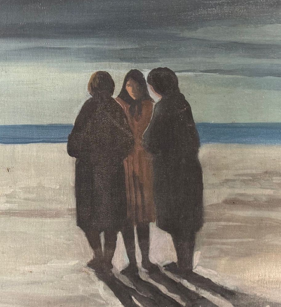 Oil painting on canvas, Italian school, 20th century, depicting three figures by the seascape. Dimensions: 50x60 cm. By an anonymous artist. The artwork is in good condition with minor signs of wear, as shown in the attached photos.