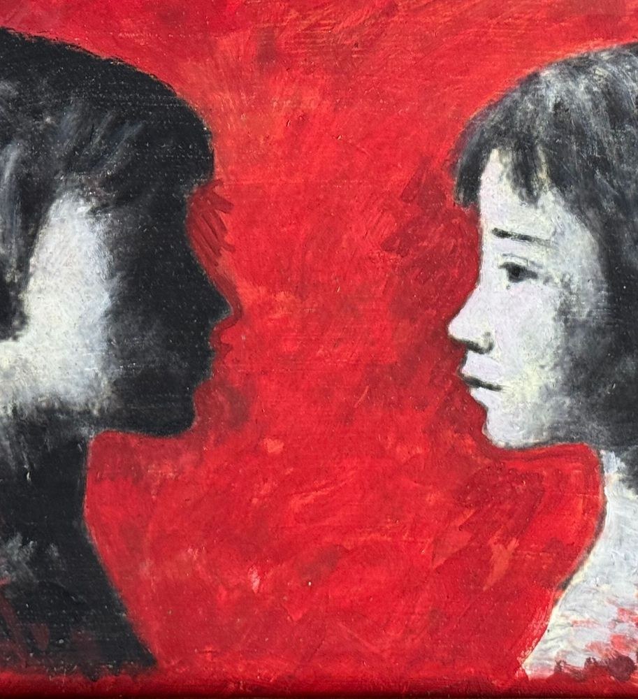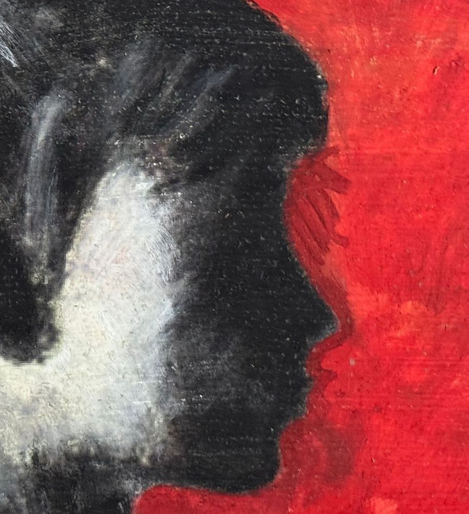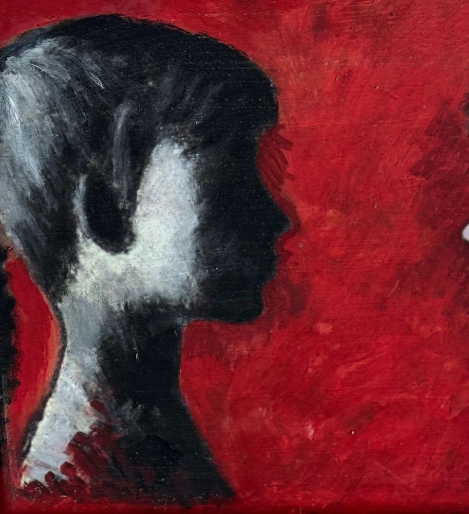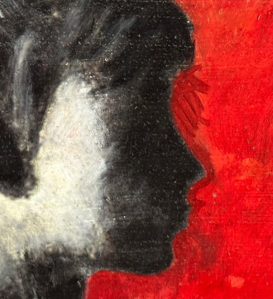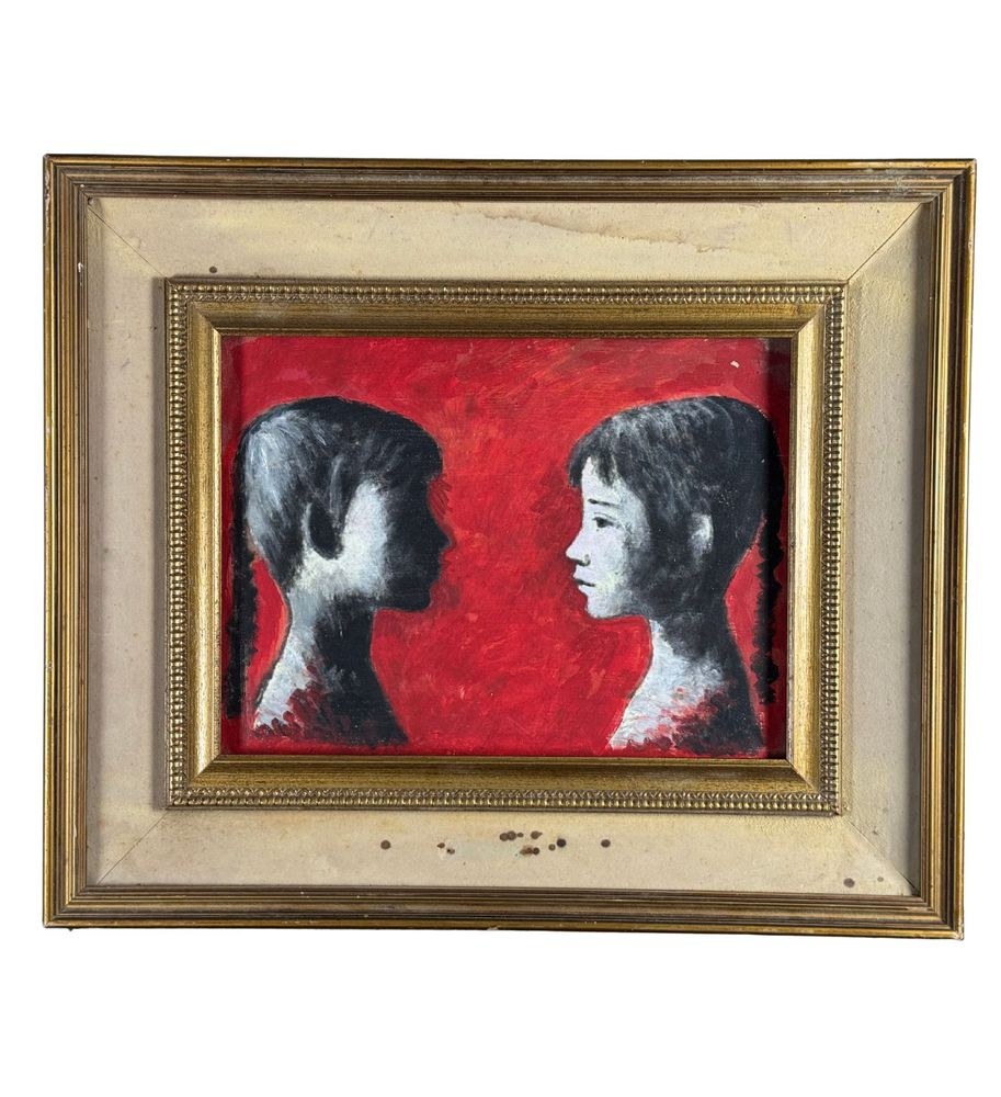 Oil painting on panel, 20th century period, Italian school depicting Two faces. Dimensions including frame: 62x52 cm. Internal frame dimensions: 35x45 cm. Anonymous artist. Work in good condition.