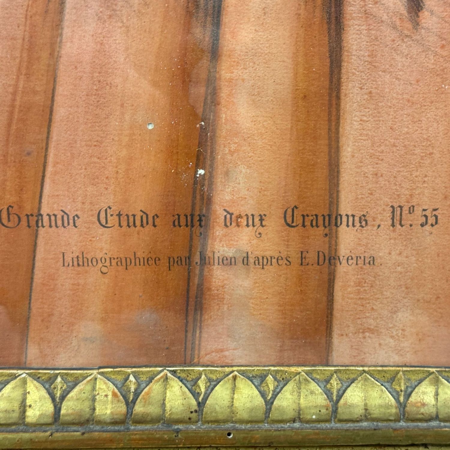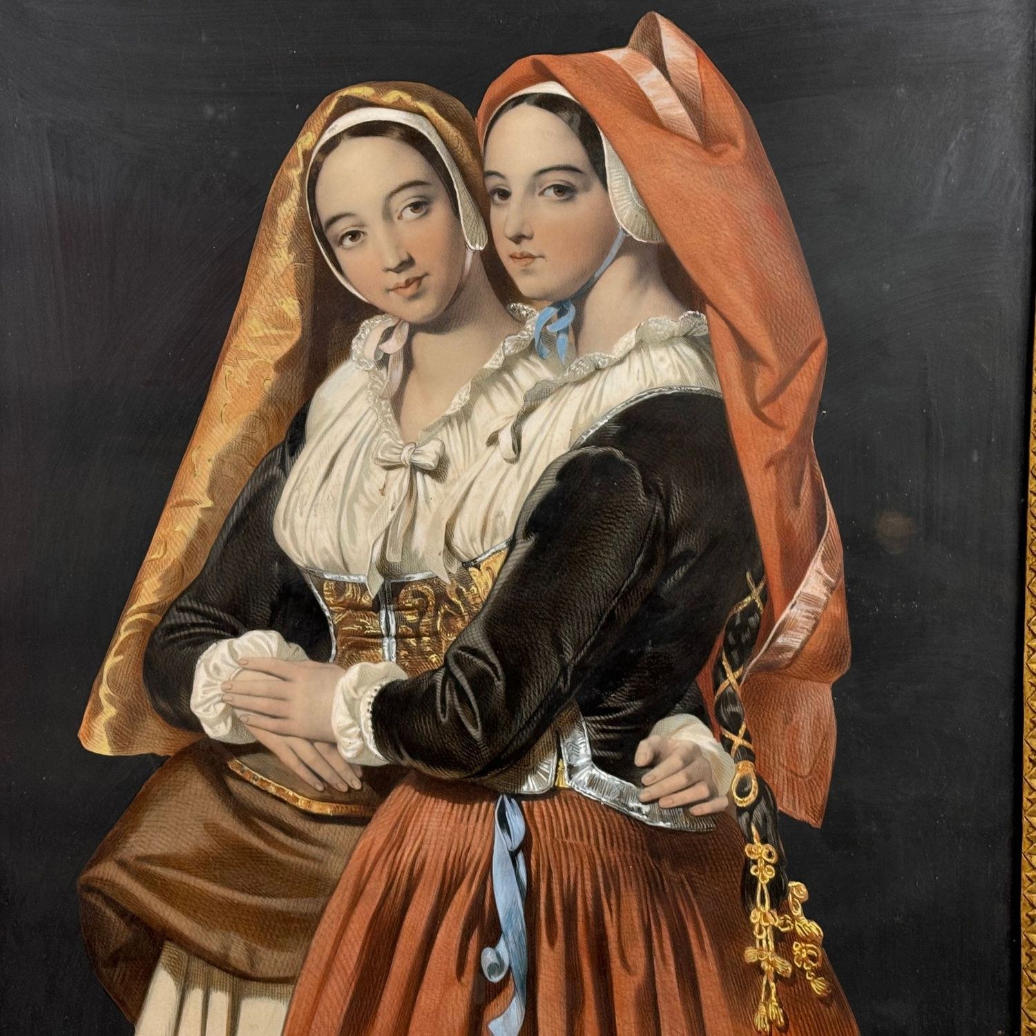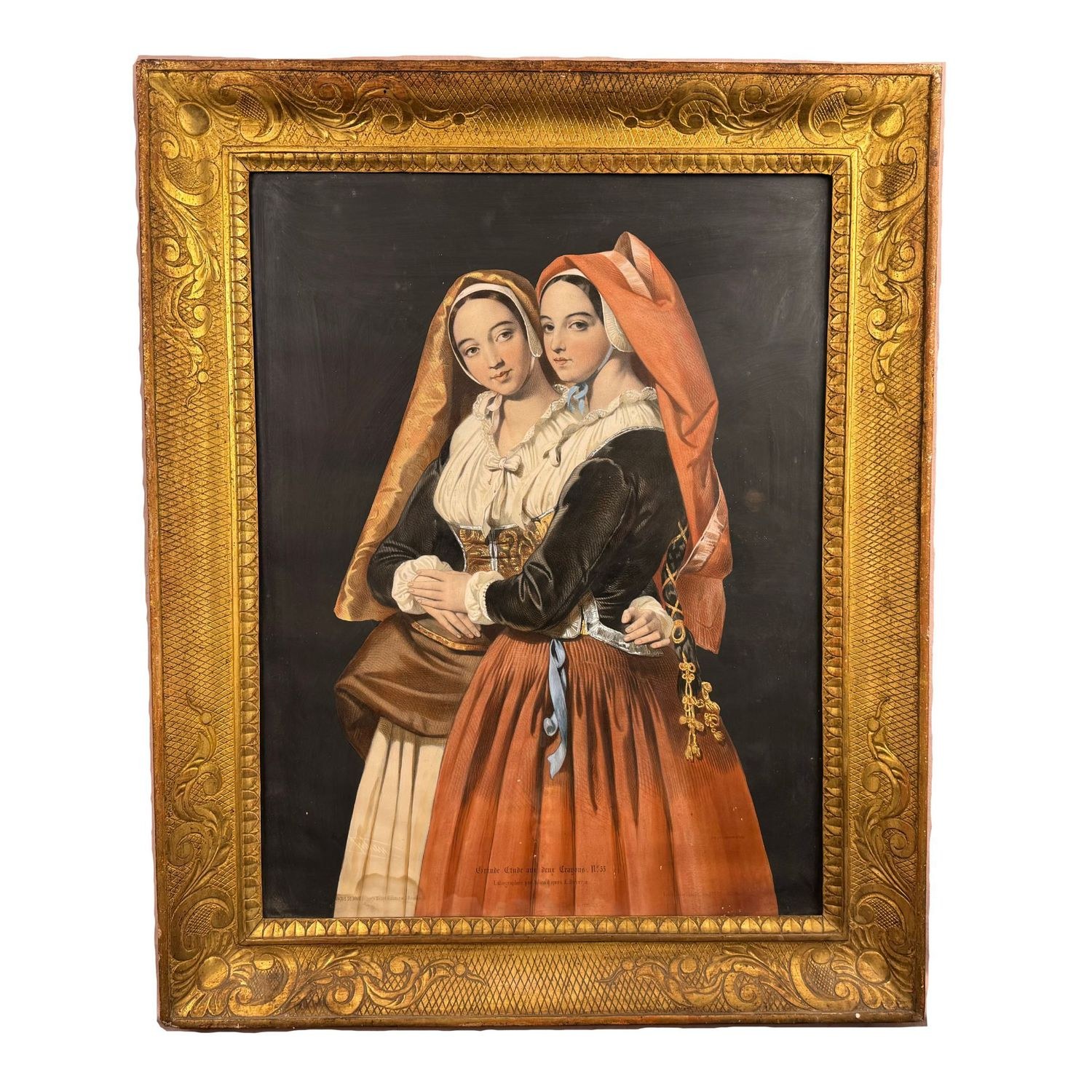 Antique watercolor print in an Empire period frame from 19th century Italy, depicting Two ladies. Dimensions including frame: 78x63 cm. Shows signs of aging, with writing at the bottom. By an anonymous artist.