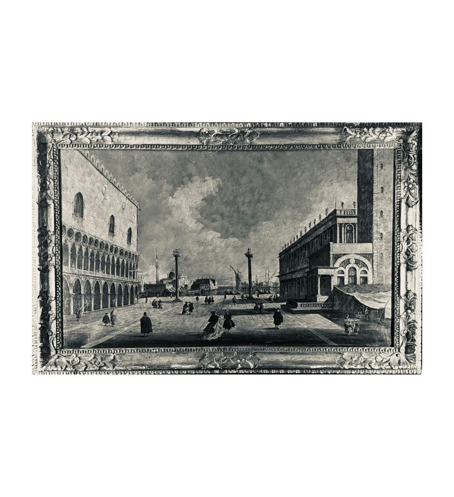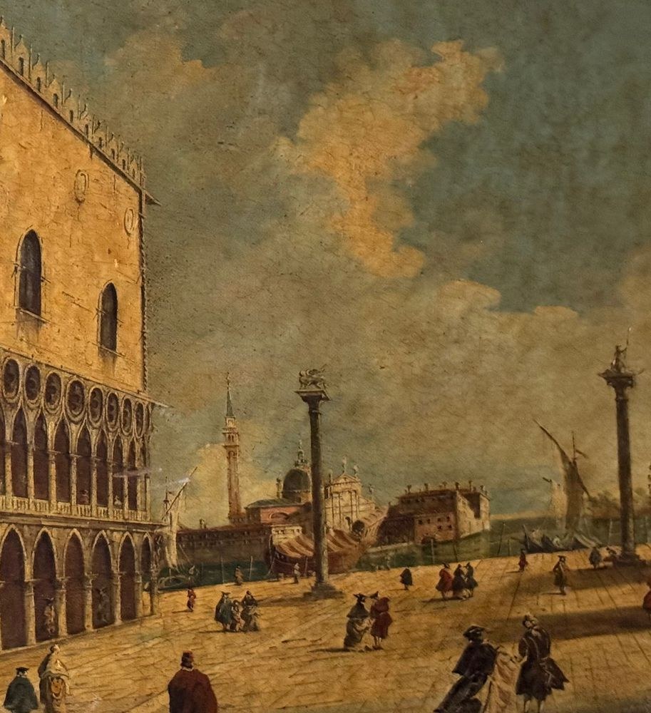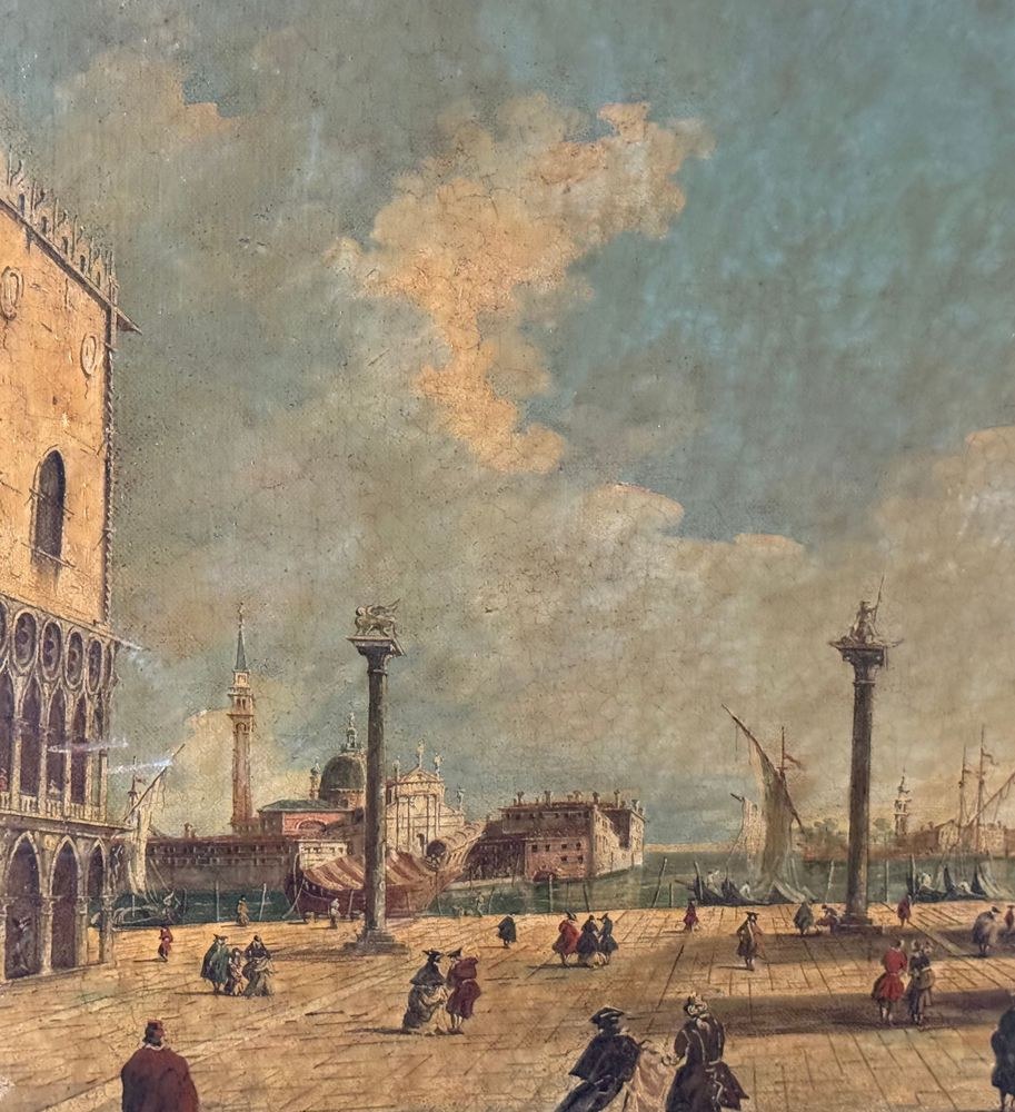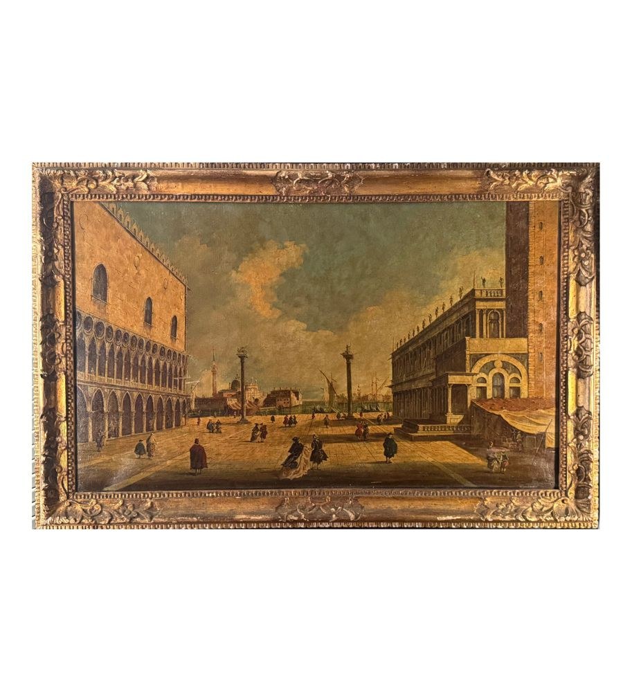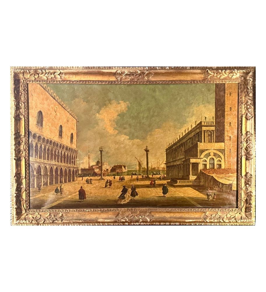 Oil on canvas painting, 19th-century Italian school, depicting Venice (Canaletto). Dimensions including frame: 75x115 cm. Dimensions inside frame: 60x100 cm. By an anonymous artist. The work is in good condition with slight signs of age, as shown in the attached photos. The canvas has an old relining and very small areas of restoration. A work of extraordinary artistic skill, accompanied by a frame with signs of age, defects, and losses.