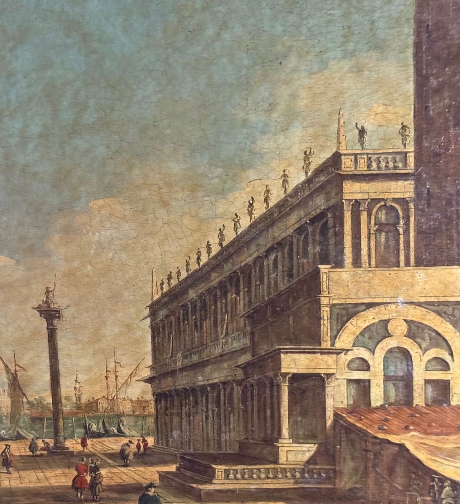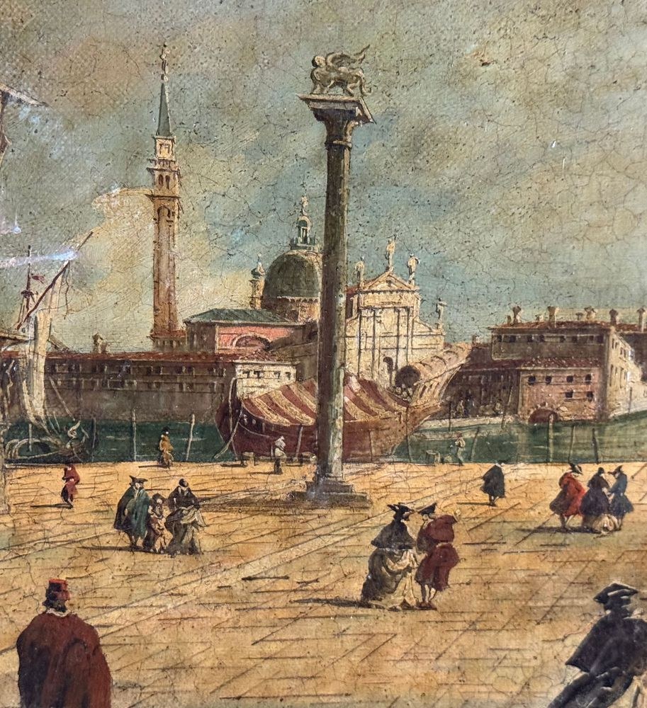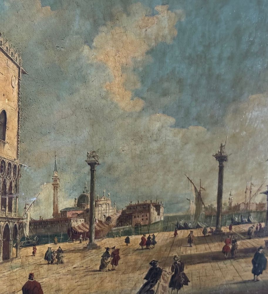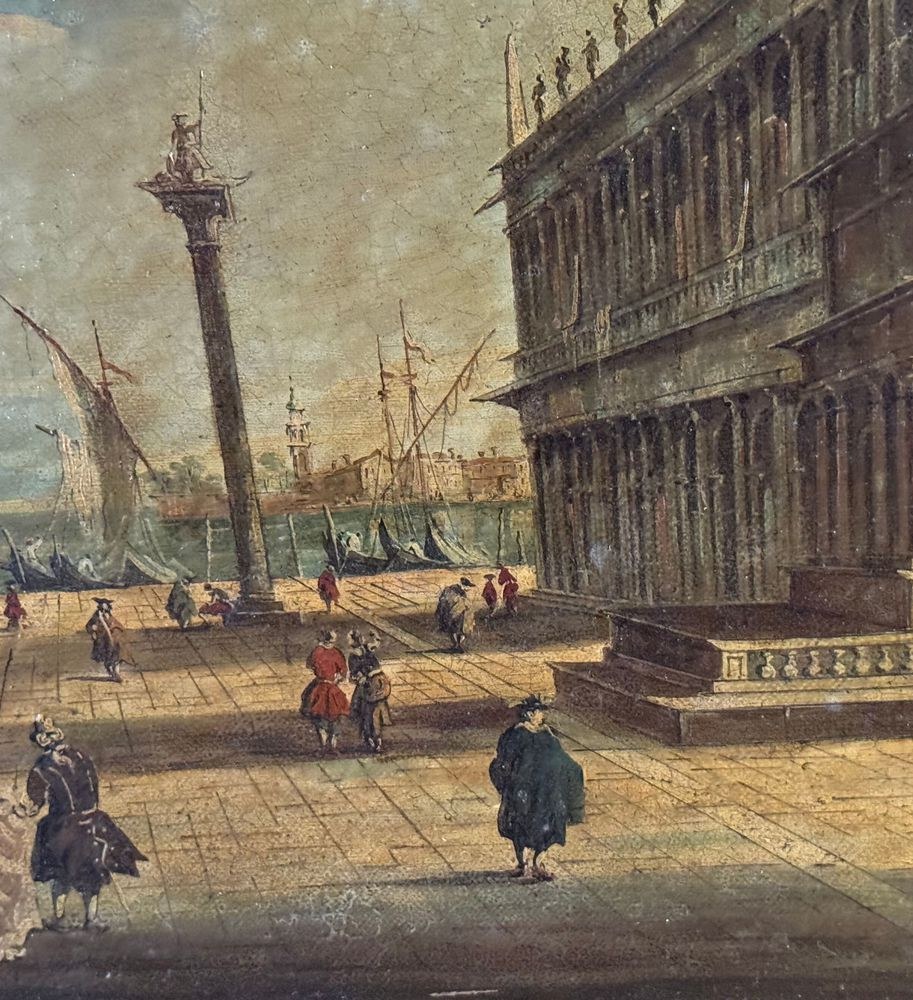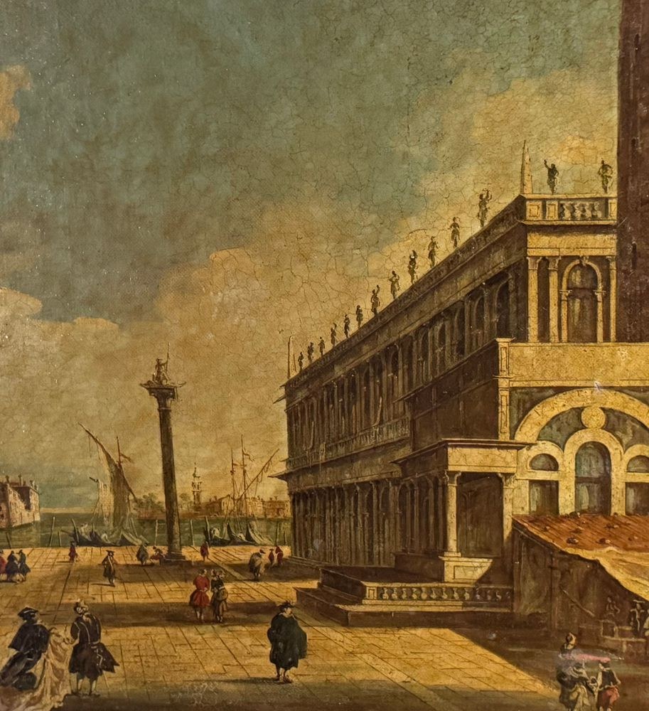 Oil on canvas painting, 19th-century Italian school, depicting Venice (Canaletto). Dimensions including frame: 75x115 cm. Dimensions inside frame: 60x100 cm. By an anonymous artist. The work is in good condition with slight signs of age, as shown in the attached photos. The canvas has an old relining and very small areas of restoration. A work of extraordinary artistic skill, accompanied by a frame with signs of age, defects, and losses.