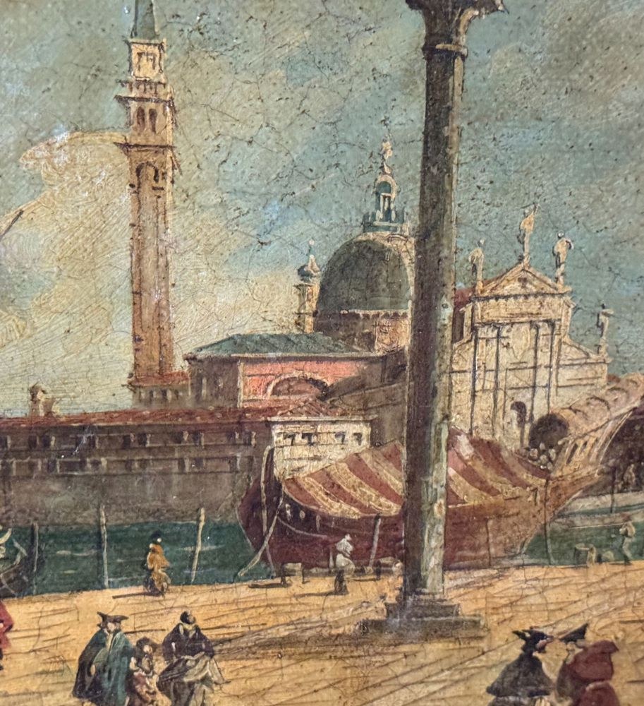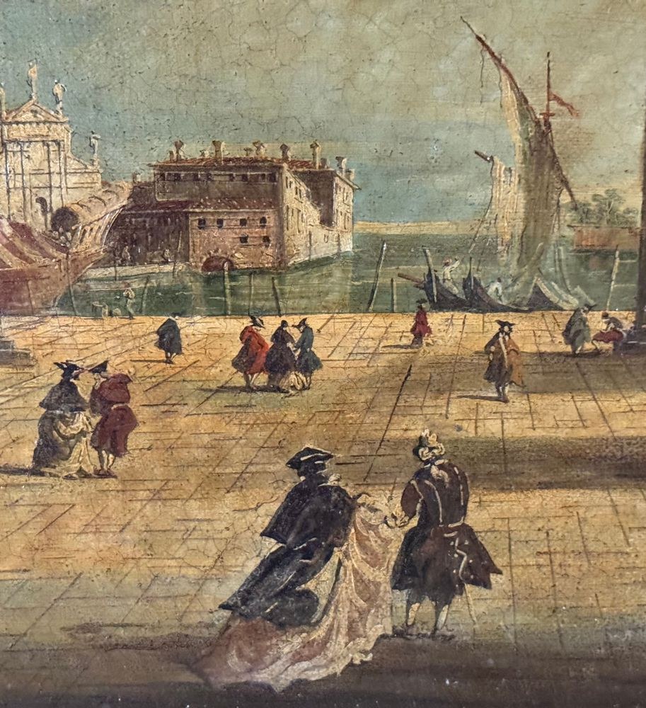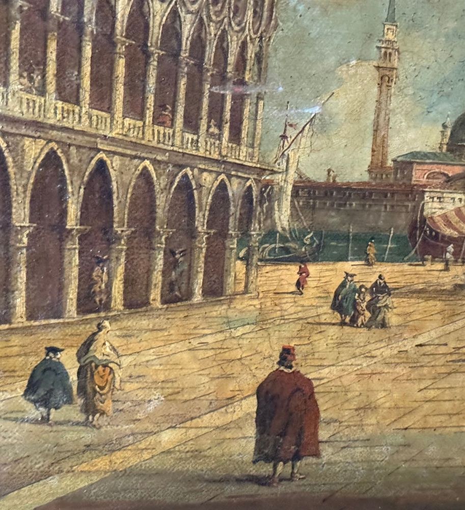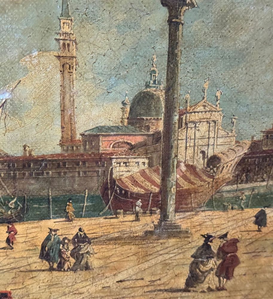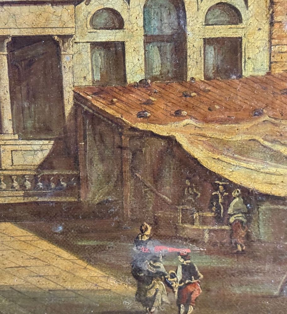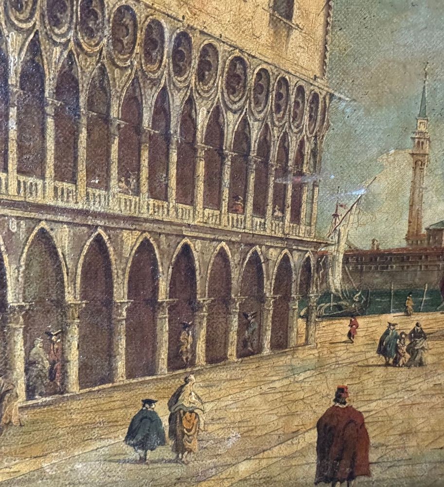 Oil on canvas painting, 19th-century Italian school, depicting Venice (Canaletto). Dimensions including frame: 75x115 cm. Dimensions inside frame: 60x100 cm. By an anonymous artist. The work is in good condition with slight signs of age, as shown in the attached photos. The canvas has an old relining and very small areas of restoration. A work of extraordinary artistic skill, accompanied by a frame with signs of age, defects, and losses.
