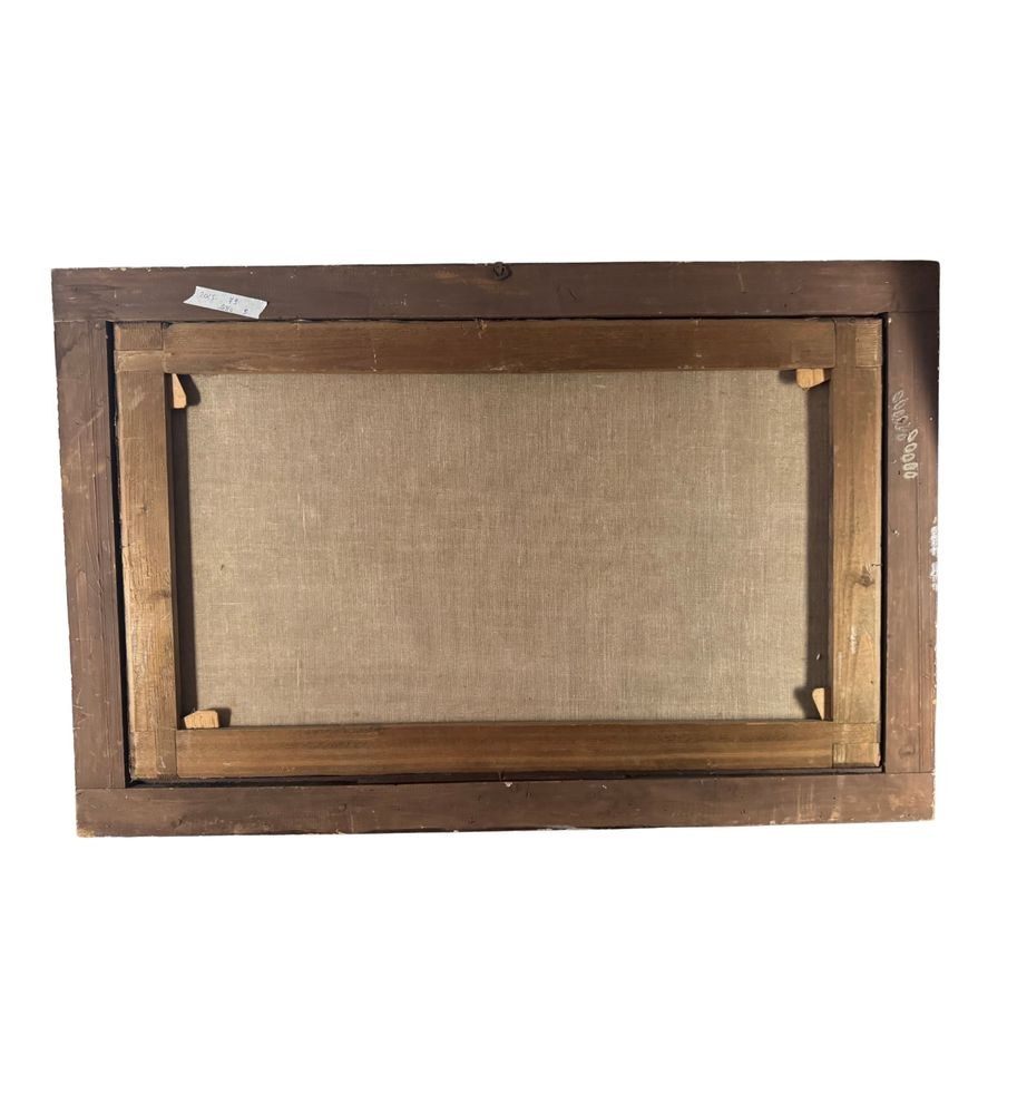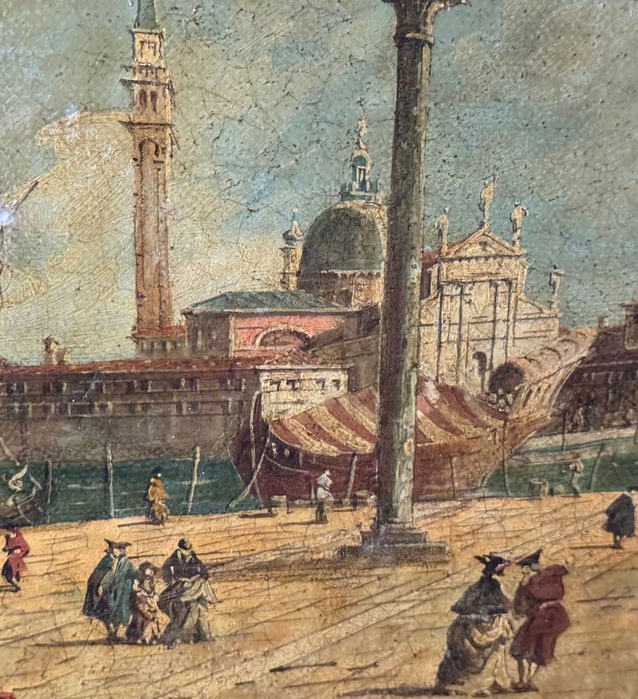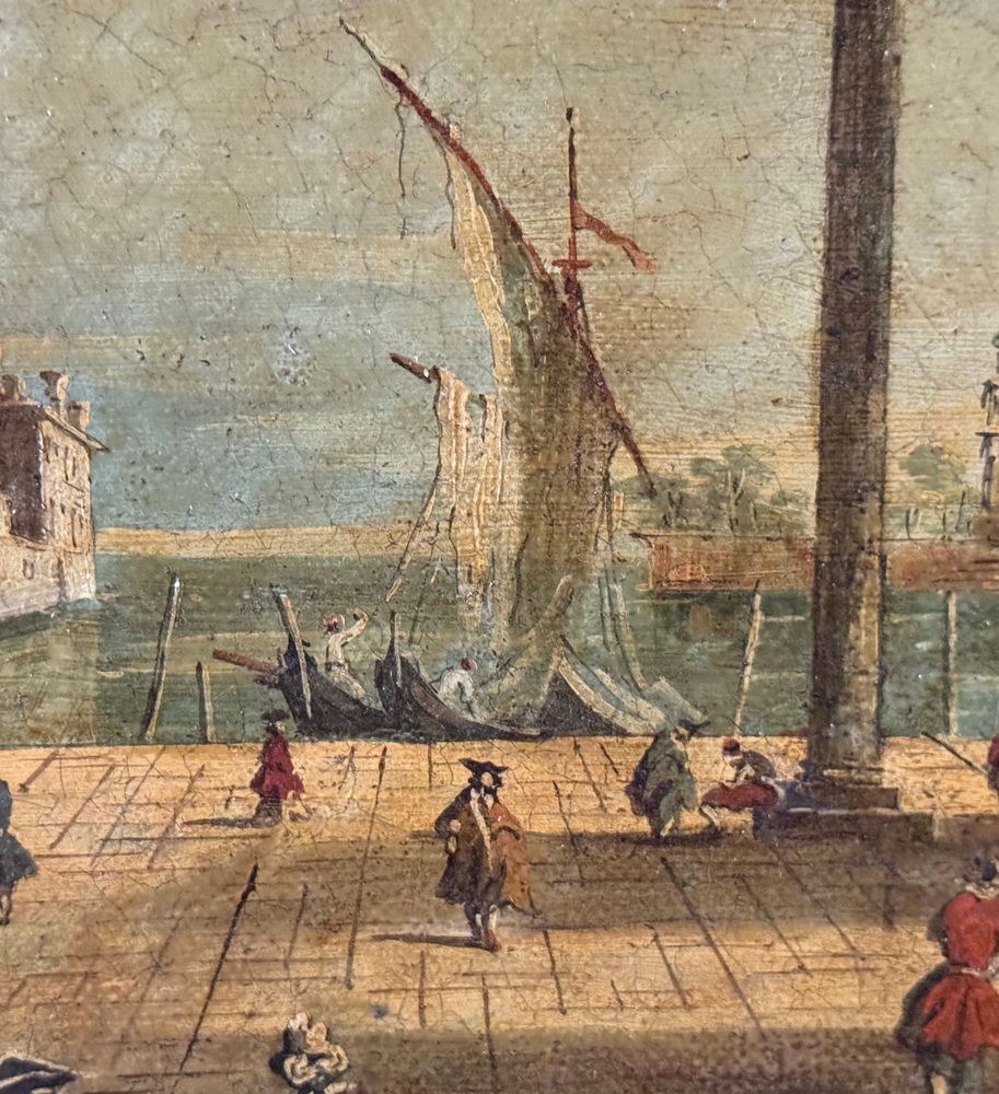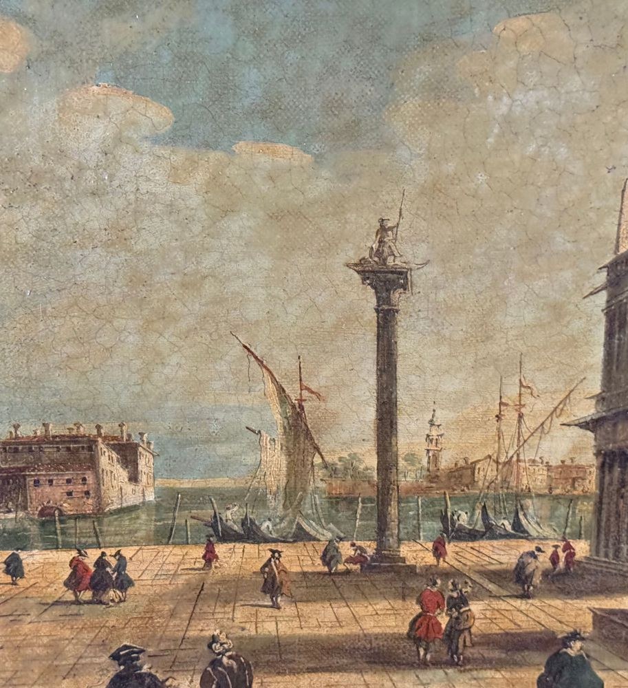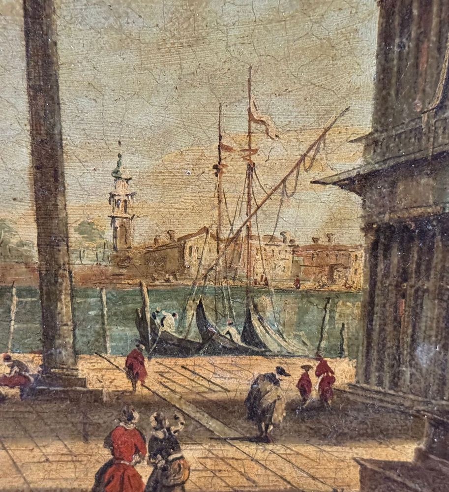 Oil on canvas painting, 19th-century Italian school, depicting Venice (Canaletto). Dimensions including frame: 75x115 cm. Dimensions inside frame: 60x100 cm. By an anonymous artist. The work is in good condition with slight signs of age, as shown in the attached photos. The canvas has an old relining and very small areas of restoration. A work of extraordinary artistic skill, accompanied by a frame with signs of age, defects, and losses.