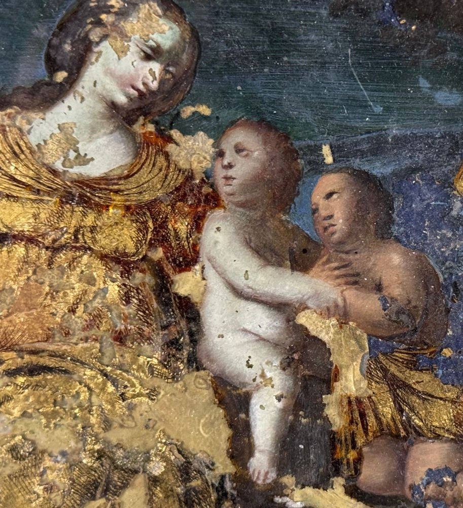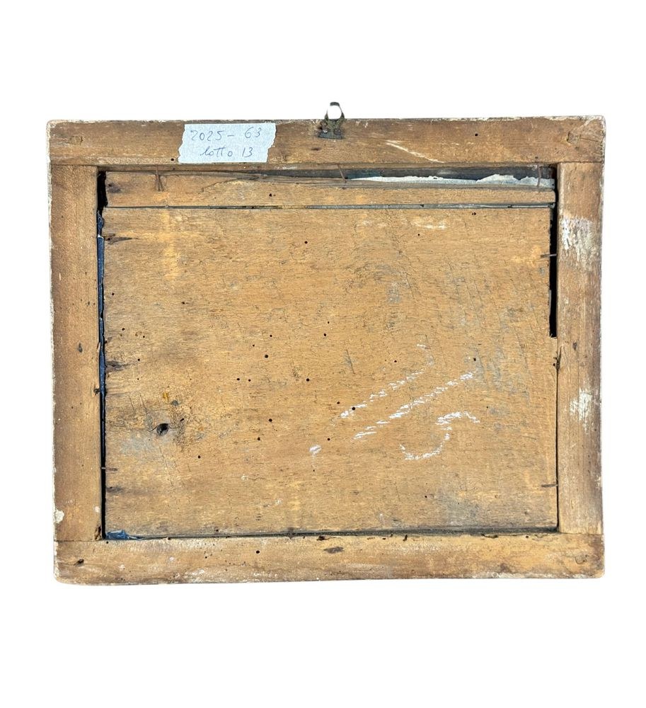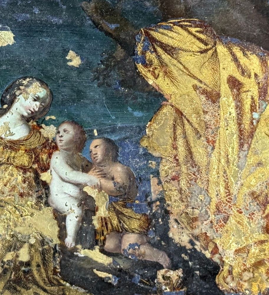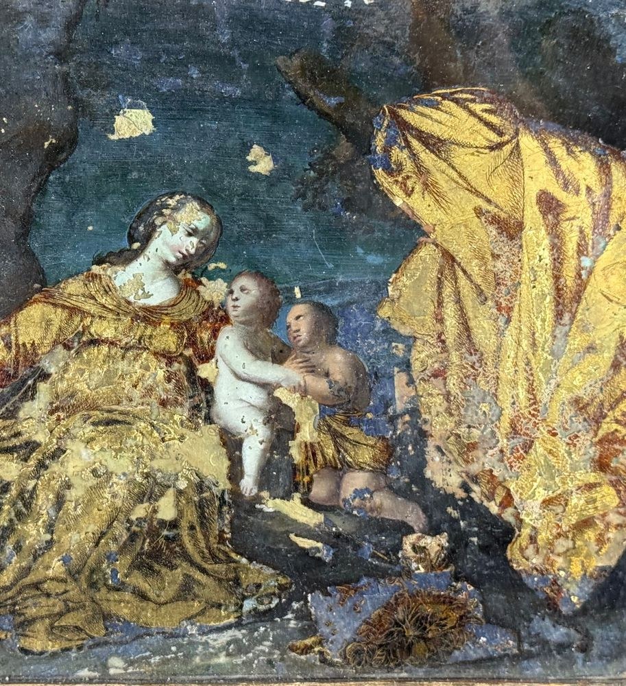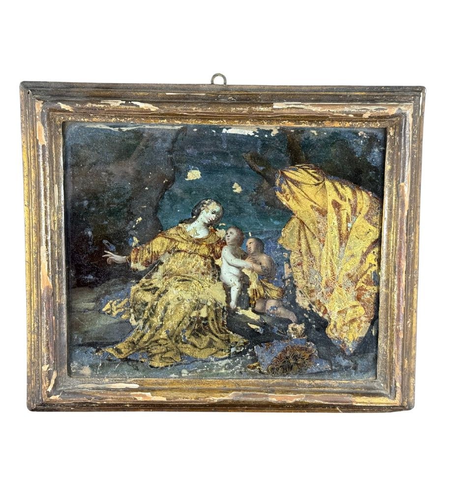 Reverse glass painting, 17th century, Italian school, depicting the Virgin Mary, Jesus, and Saint John the Baptist (San Giovannino). Dimensions including frame: 36x30 cm. Inner frame dimensions: 29x23.5 cm. Anonymous artist. The artwork is in fair condition, as shown in the attached photos.